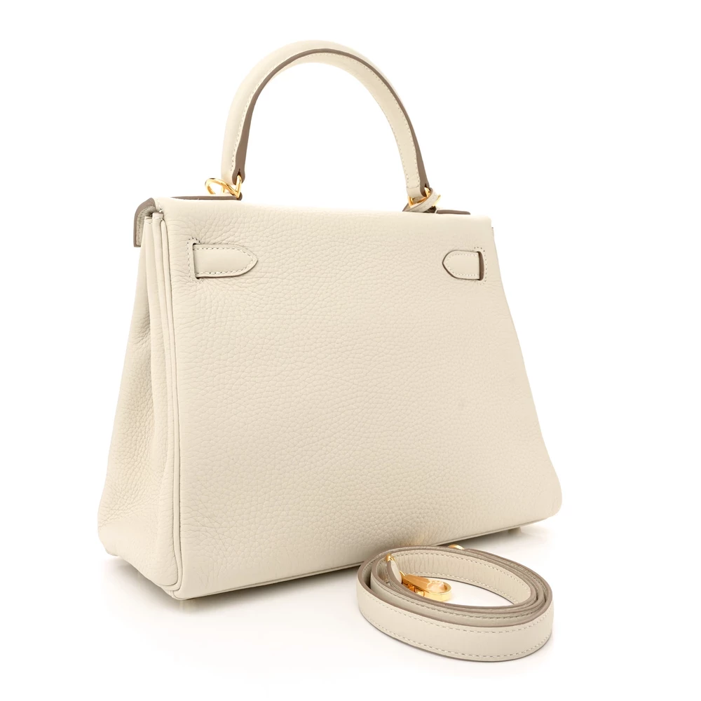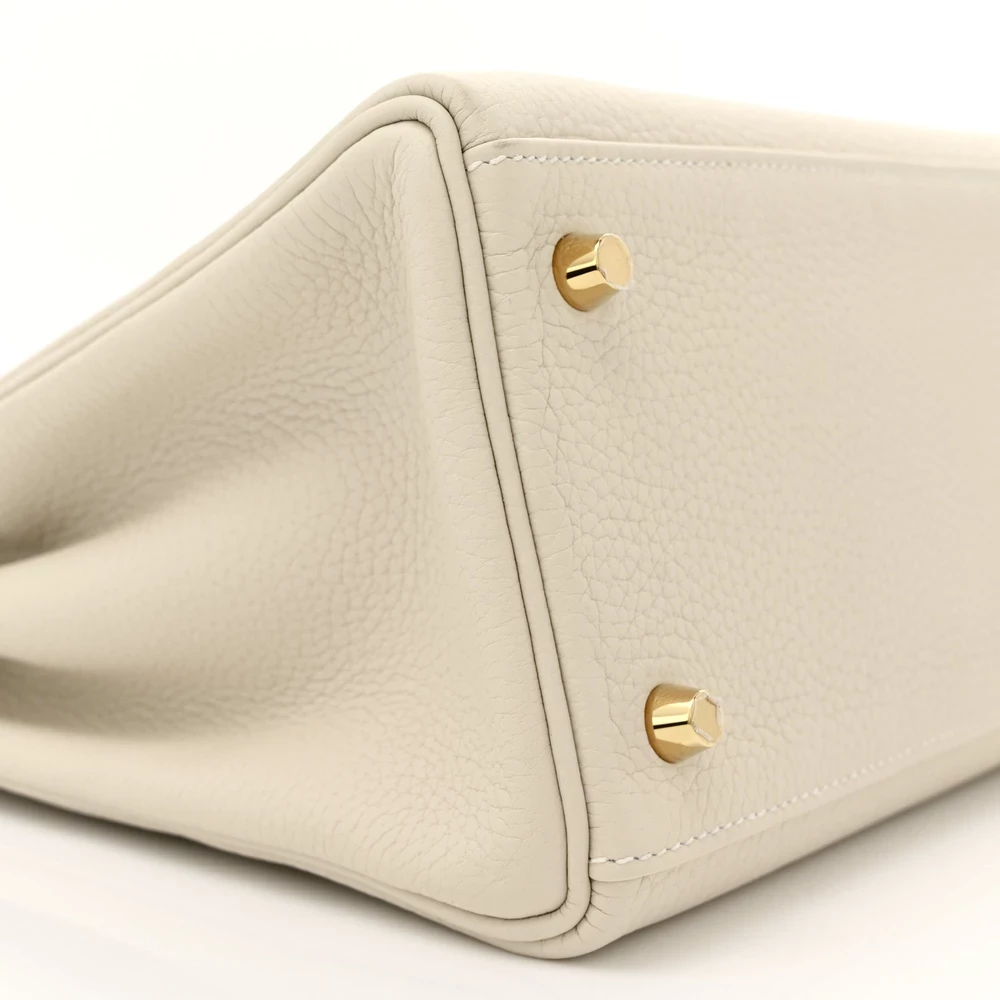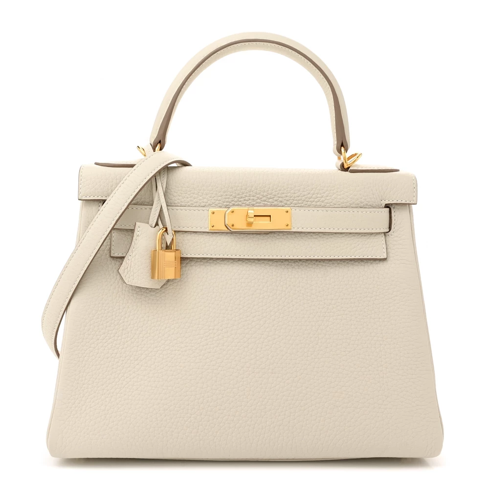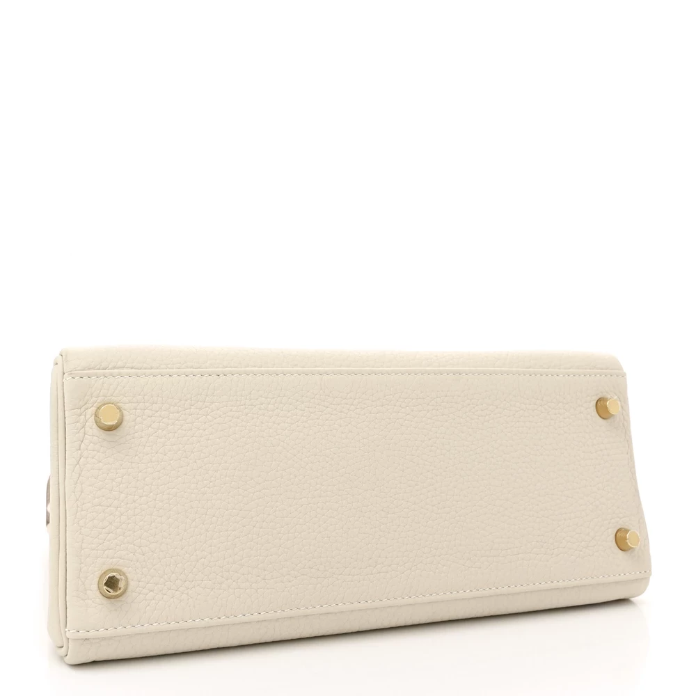 This Hermès Taurillon Clémence Kelly Retourne 28 Craie is a soft and relaxed handbag in a creamy off-white shade. The Taurillon Clémence leather provides a supple and slightly slouchy appearance, offering a more casual take on the classic Kelly. The 28 cm size makes it a practical choice for everyday wear. Palladium hardware adds a sleek contrast, enhancing its understated elegance. This Kelly is a perfect blend of sophistication and effortless charm.