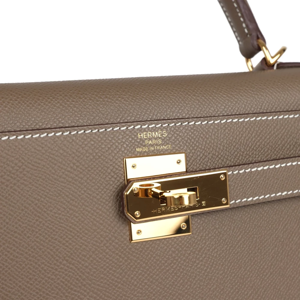 This Hermès Kelly Sellier 28 in Etoupe Epsom leather is the ultimate neutral statement piece. The structured Sellier silhouette gives it a refined and polished aesthetic. Gold hardware adds warmth, creating a harmonious balance of elegance. Durable Epsom leather ensures lasting beauty and effortless sophistication. A must-have for those who appreciate timeless style. Elevate your collection with this classic and versatile Kelly.