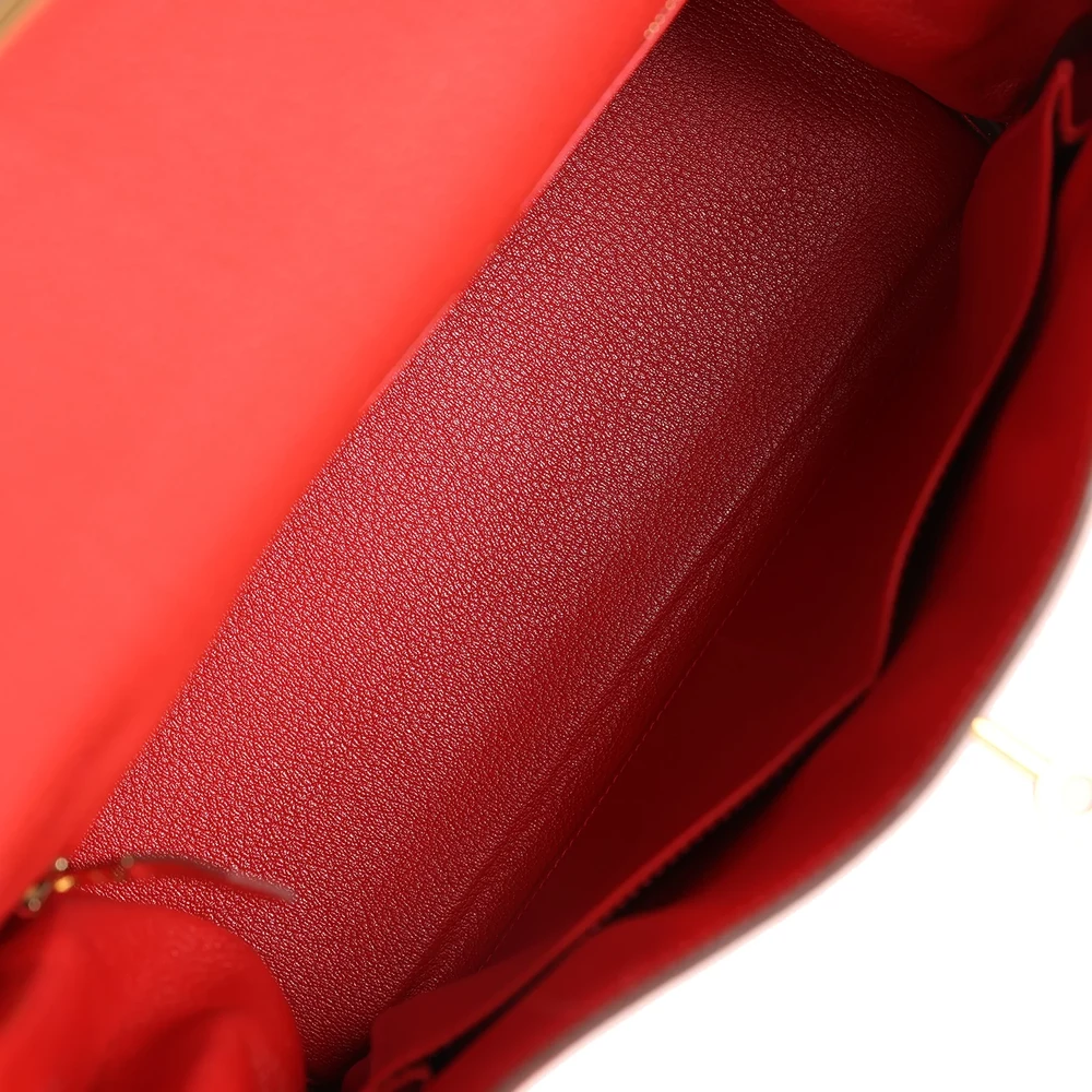 This Hermès Kelly Retourne 28 in Geranium is a vibrant and eye-catching piece. Crafted from durable Togo leather, it features a slouchy silhouette. The Gold hardware adds a modern touch. Its bright red hue is perfect for adding a pop of color to your wardrobe. The spacious interior offers practicality and style. A must-have for any Hermès enthusiast. This bag is a true investment piece.