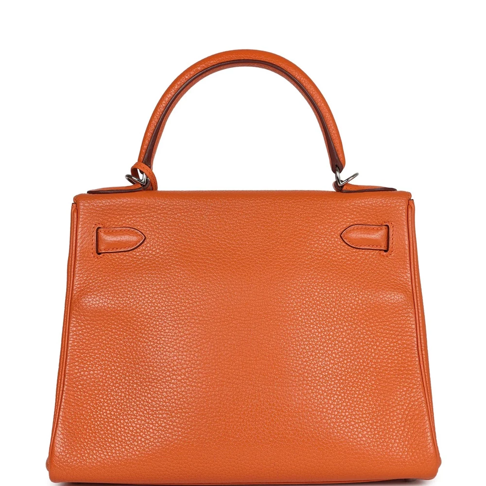 This Hermès Kelly Retourne 28 in Orange is a luxurious and practical handbag. Crafted from Togo leather, it offers a soft, slouchy silhouette. The Palladium hardware adds a modern touch. Its vibrant orange hue is perfect for adding warmth to any outfit. The spacious interior provides ample room for essentials. Perfect for everyday elegance. This bag is a true Hermès classic.