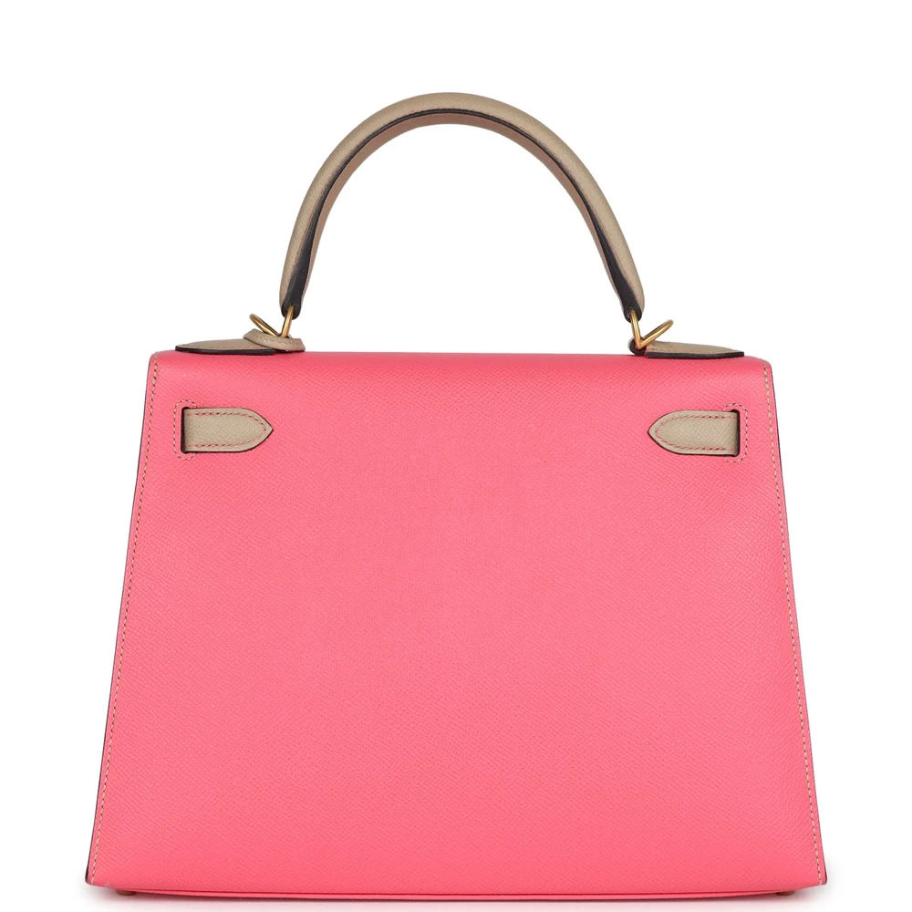 This Hermès Special Order Kelly Sellier 28 in Rose Azalee and Trench is a rare and exquisite piece. Crafted from Epsom leather, it features a unique two-tone design. The Brushed Gold hardware adds a touch of opulence. Its vibrant colors are perfect for making a bold statement. The structured silhouette ensures timeless sophistication. A must-have for collectors. This bag is a true Hermès treasure.