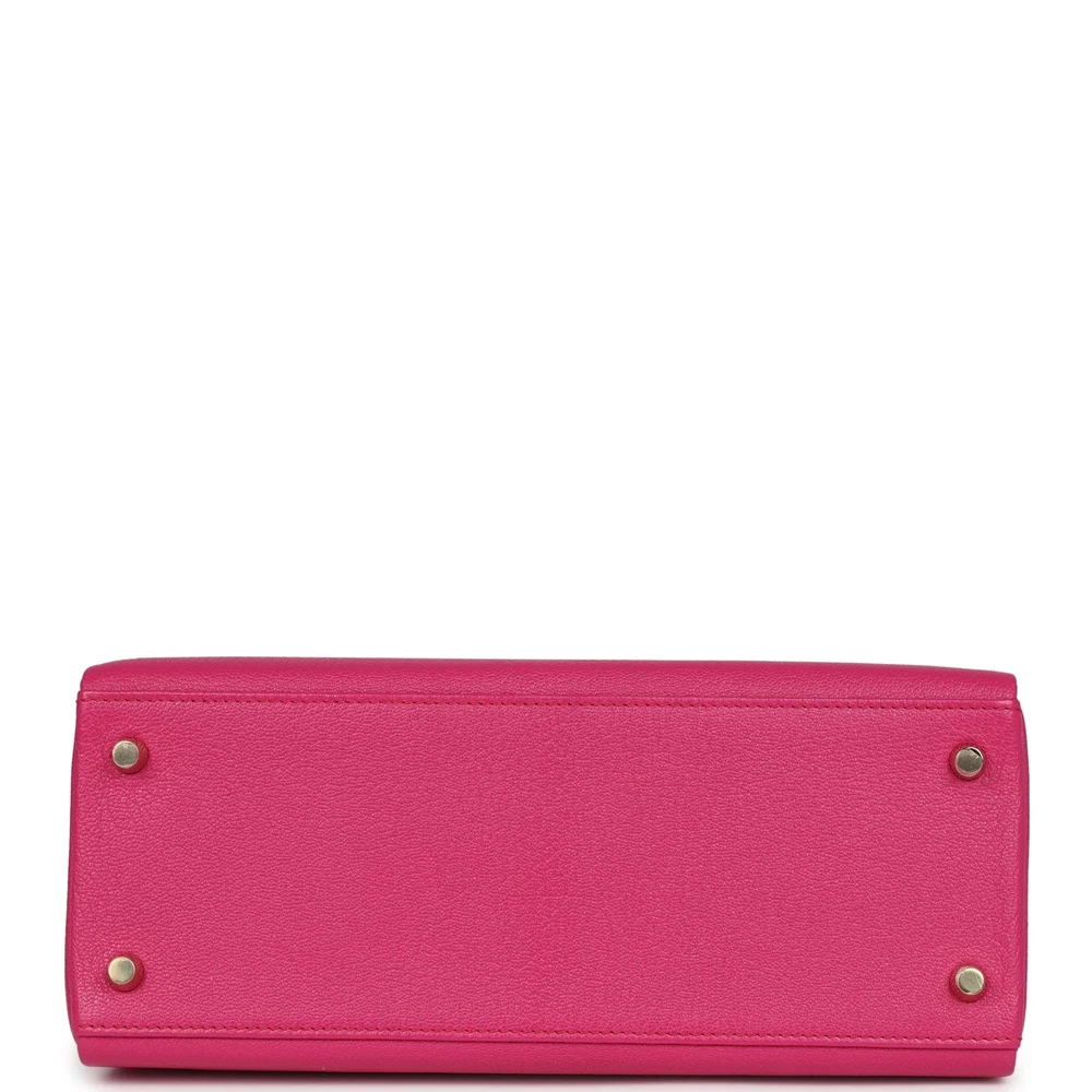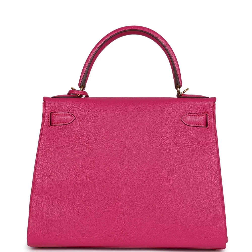 This Hermès Kelly Retourne 28 in Rose Shocking is a bold and luxurious statement. Made from supple Chevre leather, it features a slouchy design. The Gold hardware adds a touch of elegance. Its vibrant pink hue is perfect for making a bold statement. The spacious interior provides ample room for essentials. A must-have for collectors. This bag is a true Hermès masterpiece.