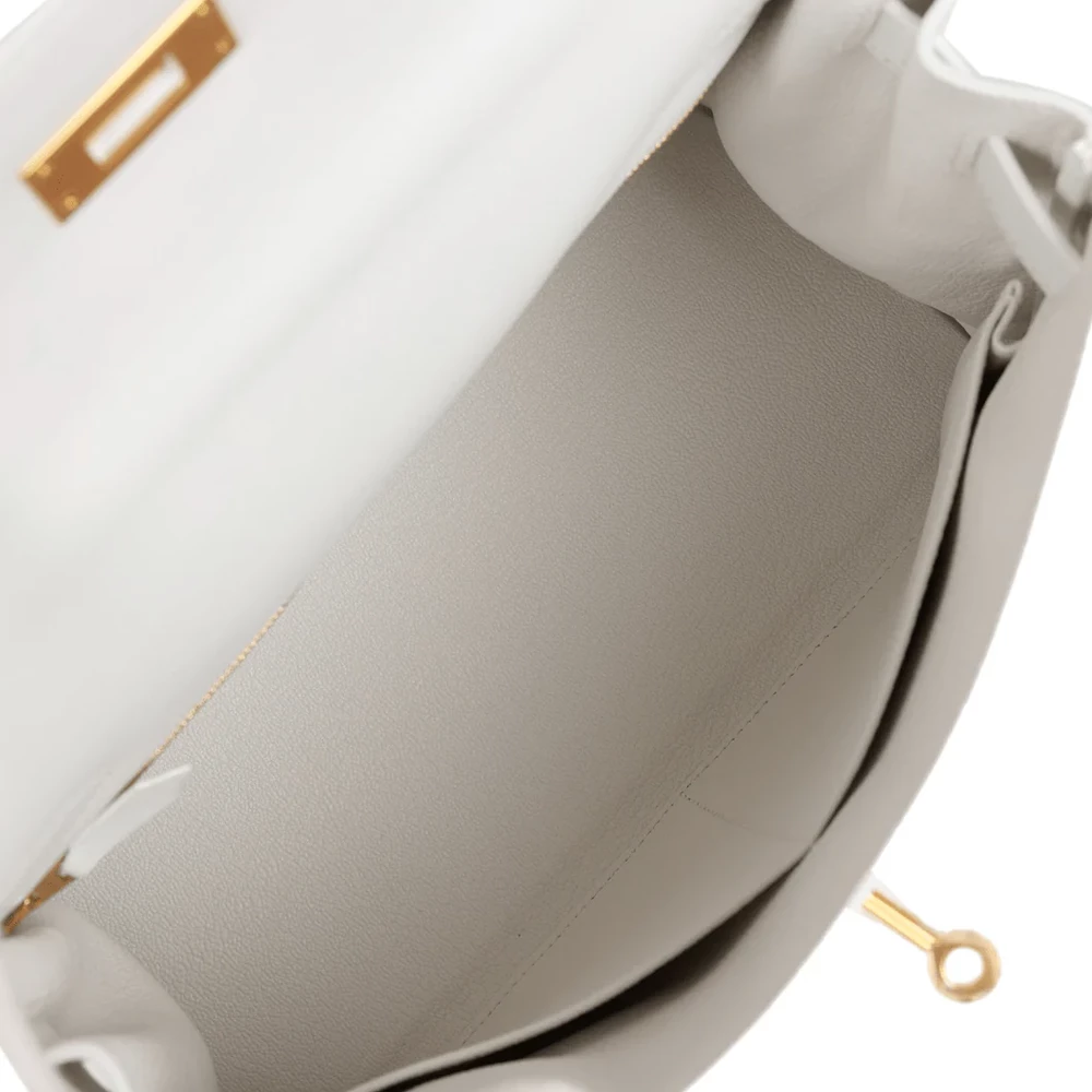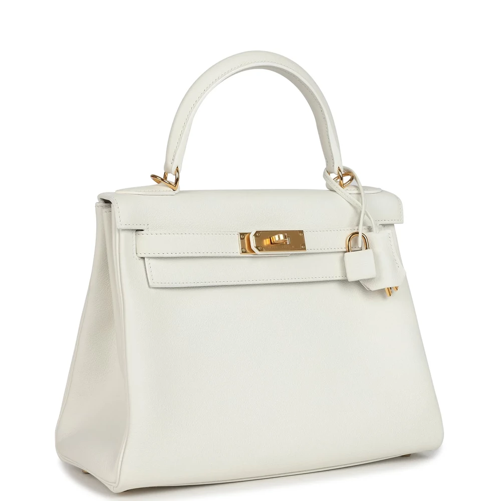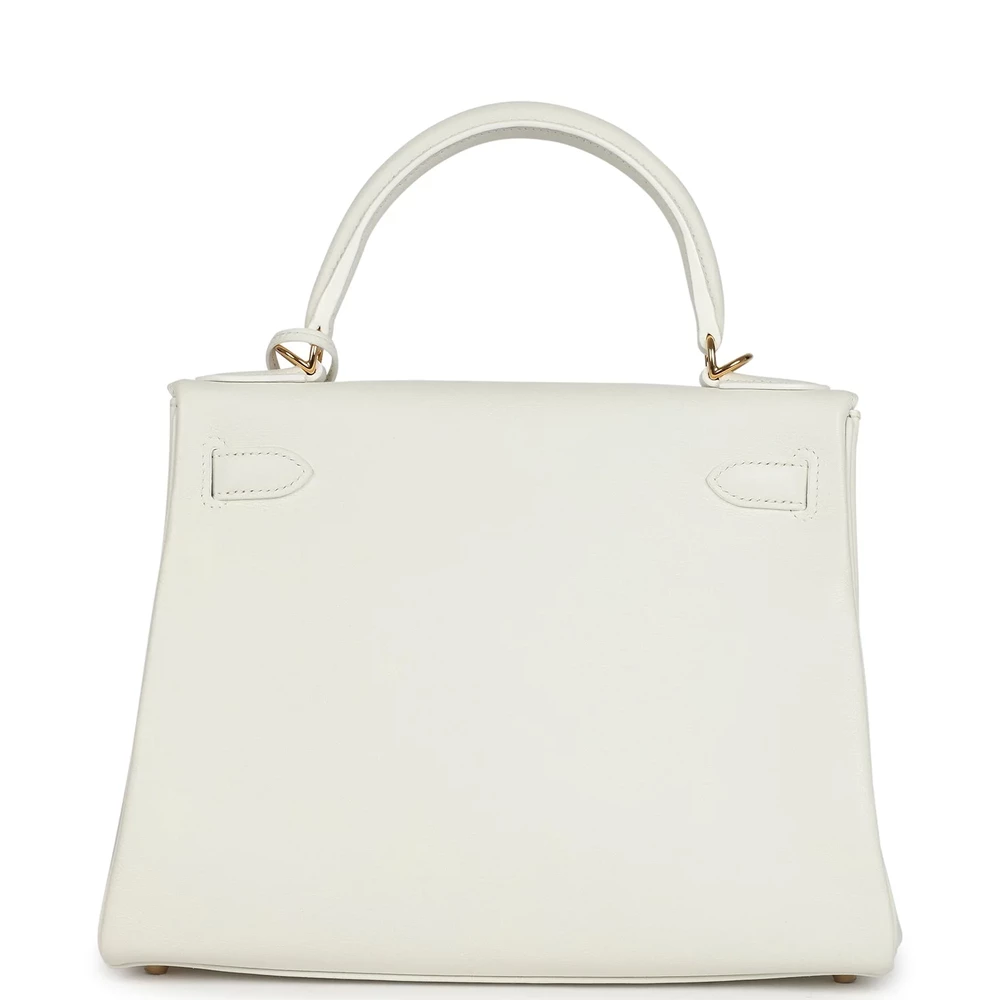 This Hermès Kelly Retourne 28 in White Evercolor leather is a vision of pure elegance. The Retourne construction adds a touch of softness to its structured silhouette. Gold hardware complements its pristine white hue with a warm, luxurious glow. A timeless piece that effortlessly transitions from day to night. Ideal for those who adore classic beauty with a modern twist. Elevate your collection with this fresh and refined statement piece.