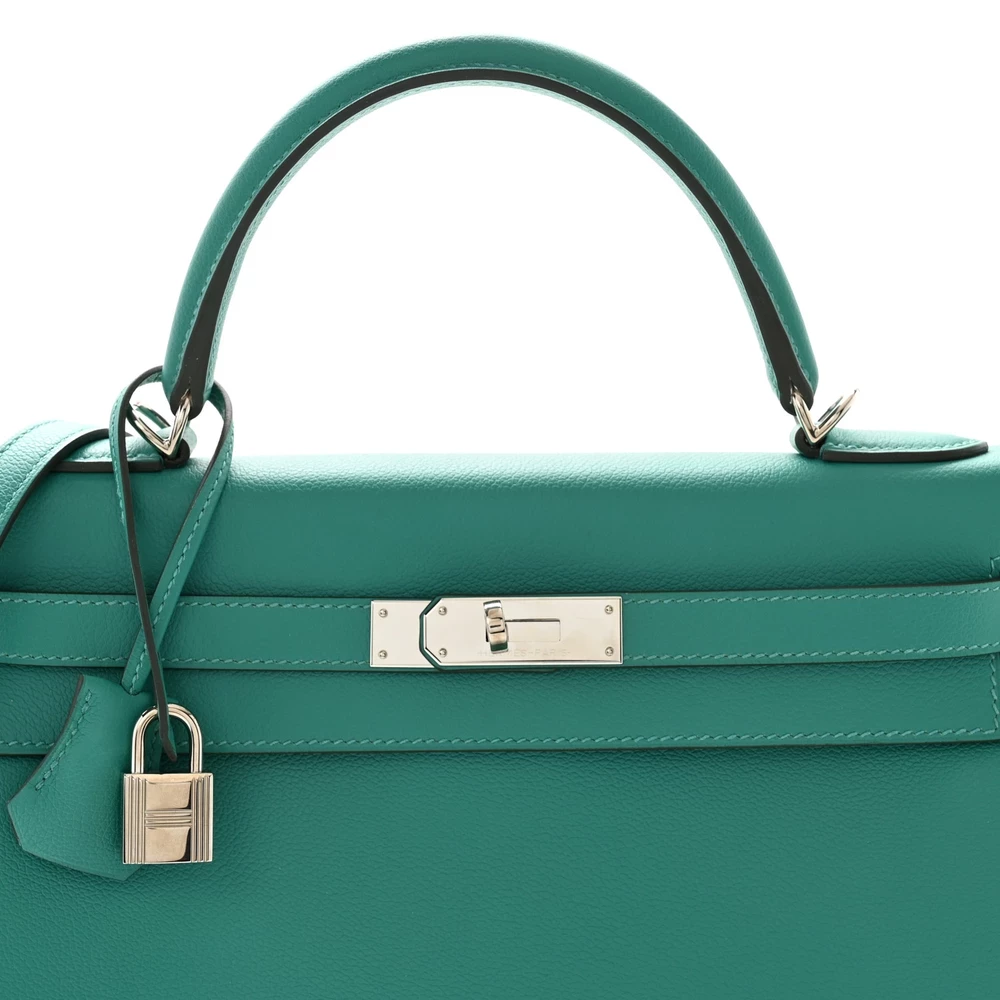 This Hermès Evercolor Verso Kelly Retourne 32 Vert Verone Bleu du Nord is a refined and sophisticated handbag with a subtle bi-color contrast. The Evercolor leather offers a smooth texture with excellent durability. The 32 cm size provides ample space while maintaining an elegant silhouette. The combination of green and blue tones adds a fresh and contemporary touch. This Kelly is a timeless piece with a modern twist.