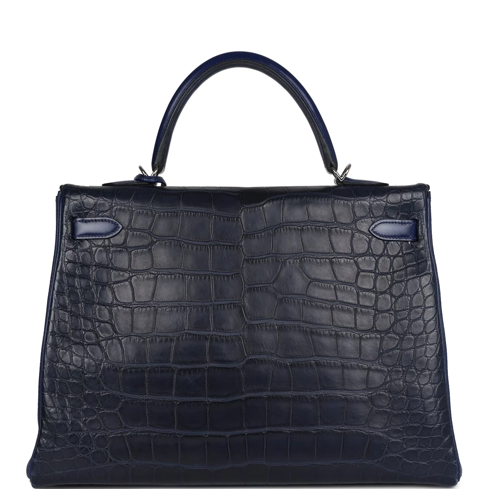 This Hermès Kelly Retourne 35 in Bleu Indigo and Bleu Saphir is a rare and luxurious statement. Crafted from matte alligator and Swift leather, it features a unique two-tone design. The Palladium hardware adds a modern touch. Its deep blue hues are perfect for making a bold statement. The spacious interior offers practicality and style. A must-have for collectors. This bag is a true Hermès masterpiece.