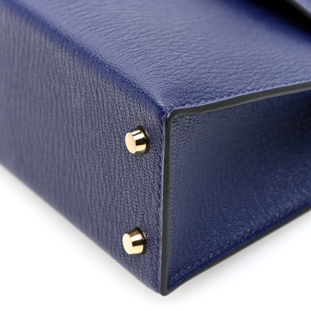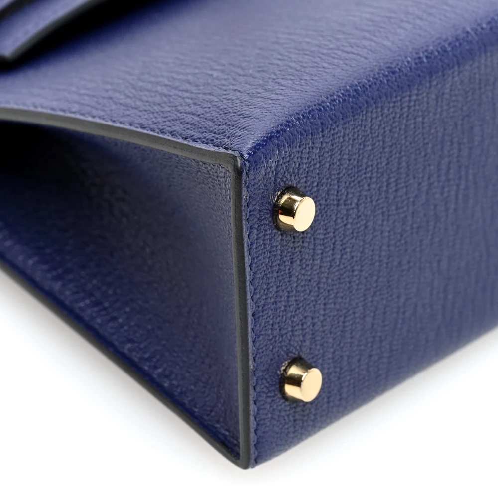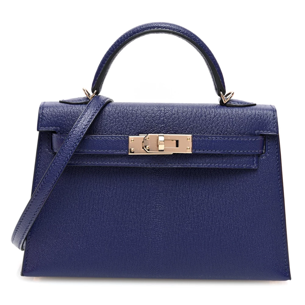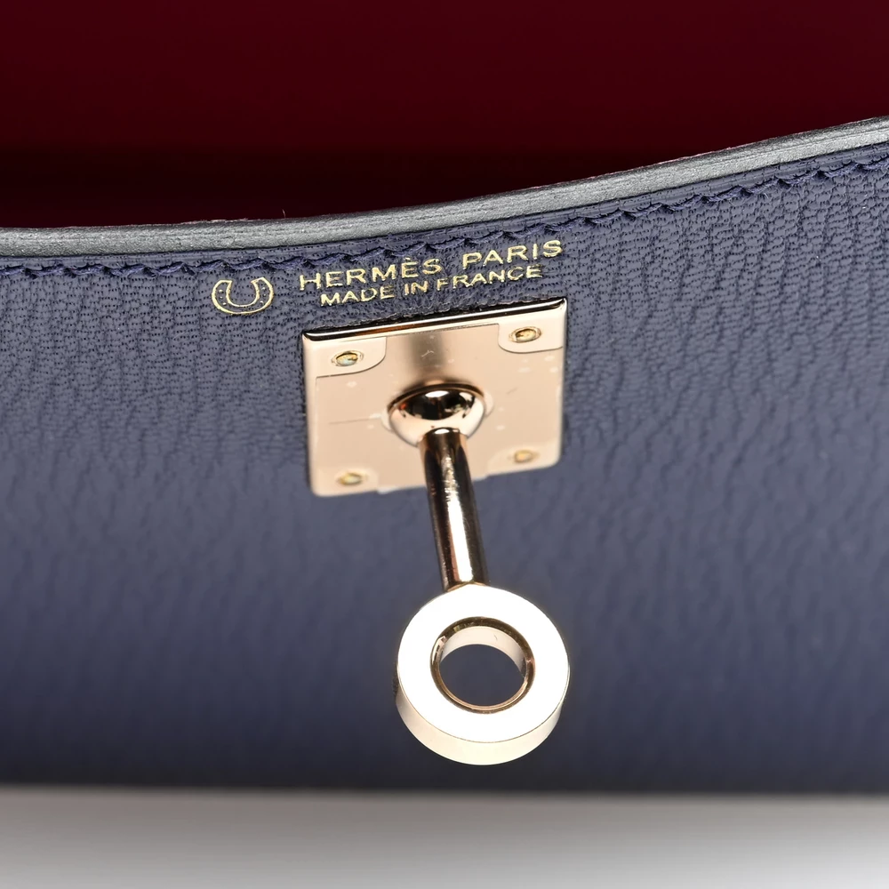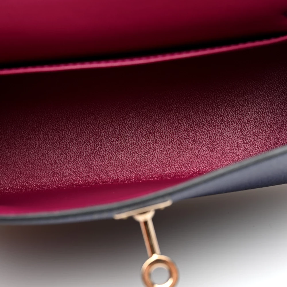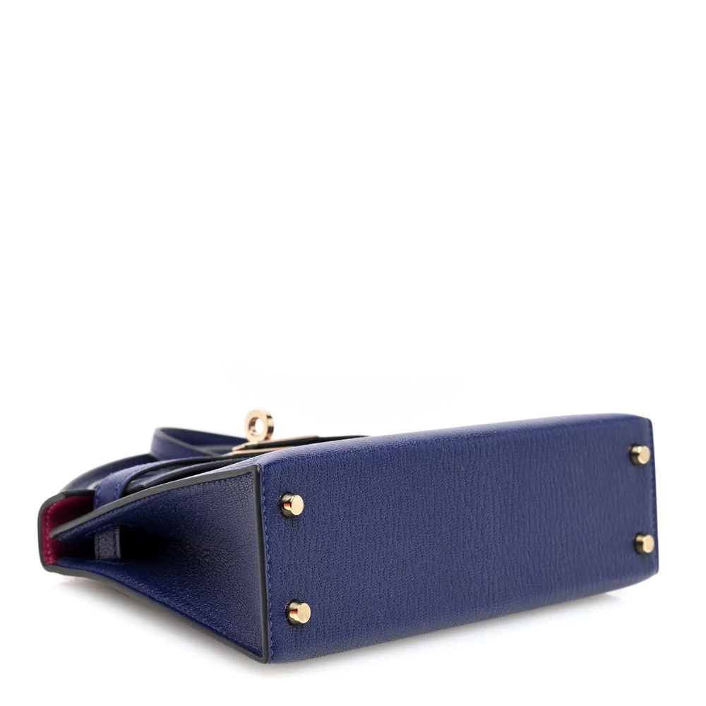 This Hermès Chèvre Mysore Horseshoe Mini Kelly Sellier 20 Bleu Encre Rose Pourpre is a rare and custom handbag with a striking color combination. The Chèvre Mysore leather offers a fine grain and natural sheen, ensuring a luxurious finish. The deep Bleu Encre exterior contrasts beautifully with the Rose Pourpre interior. Palladium hardware adds a sleek, modern touch. This Mini Kelly is a collector’s dream with its unique hues.