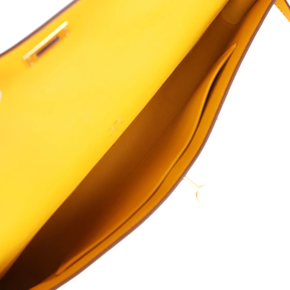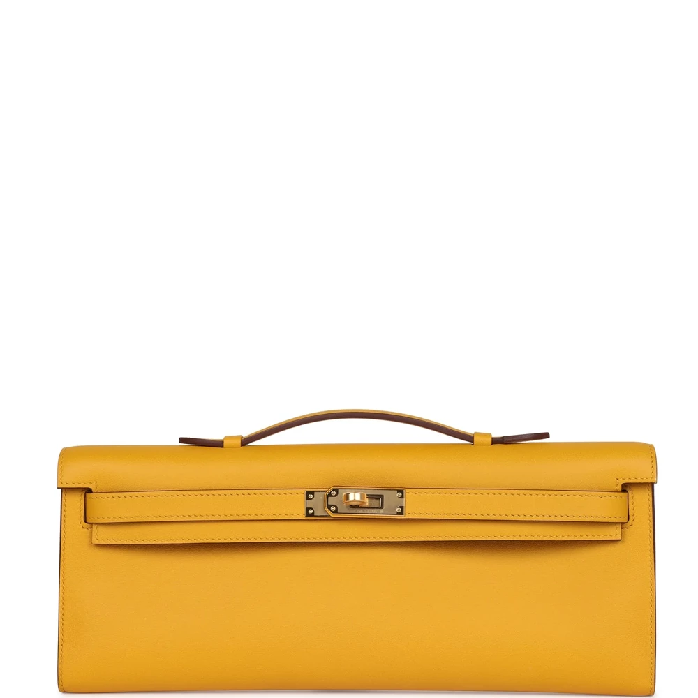 This Hermès Kelly Cut in Jaune Ambre is a chic and compact handbag. Crafted from Swift leather, it offers a smooth, luxurious feel. The Gold hardware adds a touch of glamour. Its warm yellow hue is perfect for adding a subtle pop of color to any outfit. The sleek design ensures versatility. Perfect for both day and night. This bag is a timeless addition to any collection.