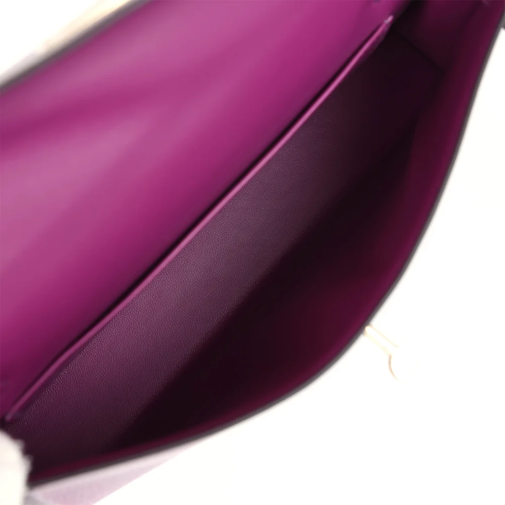 This Hermès Kelly Elan in Anemone is a chic and modern choice. Crafted from supple Chevre Chamkila leather, it features a sleek design. The Permabrass hardware adds a unique touch. Its vibrant purple hue is perfect for adding a pop of color to your wardrobe. The spacious interior offers practicality and style. A must-have for any Hermès collector. This bag is a true statement piece.