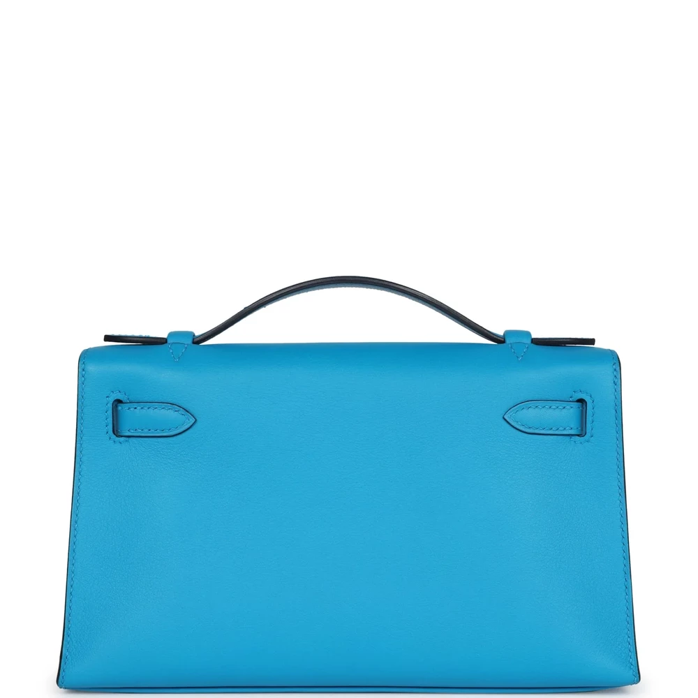This Hermès Kelly Pochette in Bleu Frida is a chic and modern choice. Made from supple Swift leather, it features a compact design. The Gold hardware adds a touch of elegance. Its vibrant blue hue is perfect for adding a pop of color to your wardrobe. The interior is designed for essentials, making it both stylish and practical. A must-have for any Hermès collector. This bag is a true statement piece.