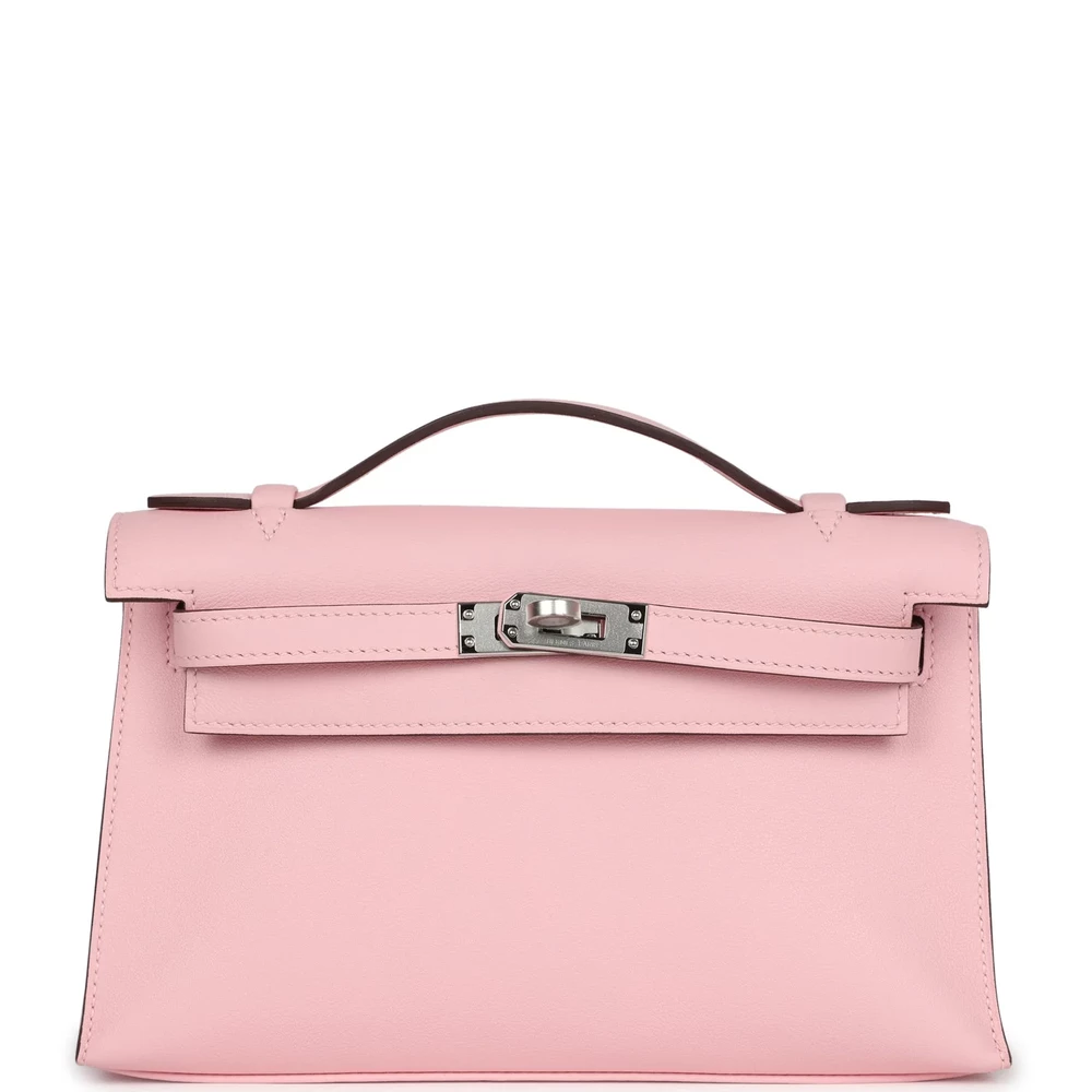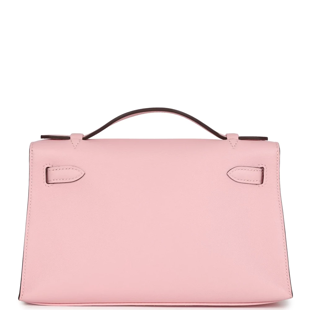 This Hermès Kelly Pochette in Rose Sakura is a chic and compact accessory. Made from Swift leather, it features a luxurious texture. The Palladium hardware adds a modern touch. Its soft pink hue is perfect for adding a touch of elegance to your wardrobe. The compact size makes it ideal for evenings or special occasions. A must-have for any collection.