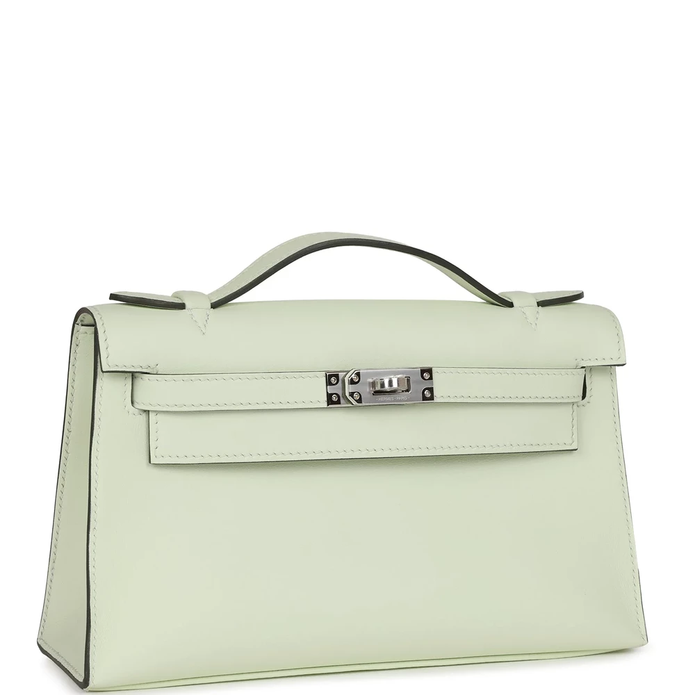 This Hermès Kelly Pochette in Vert Fizz is a playful and modern statement piece. Crafted from supple Swift leather, it features a compact design. The Palladium hardware adds a contemporary touch. Its vibrant green hue is perfect for adding a pop of color to your wardrobe. The interior is designed for essentials, making it both stylish and practical. A must-have for any Hermès collector. This bag is a true investment piece.