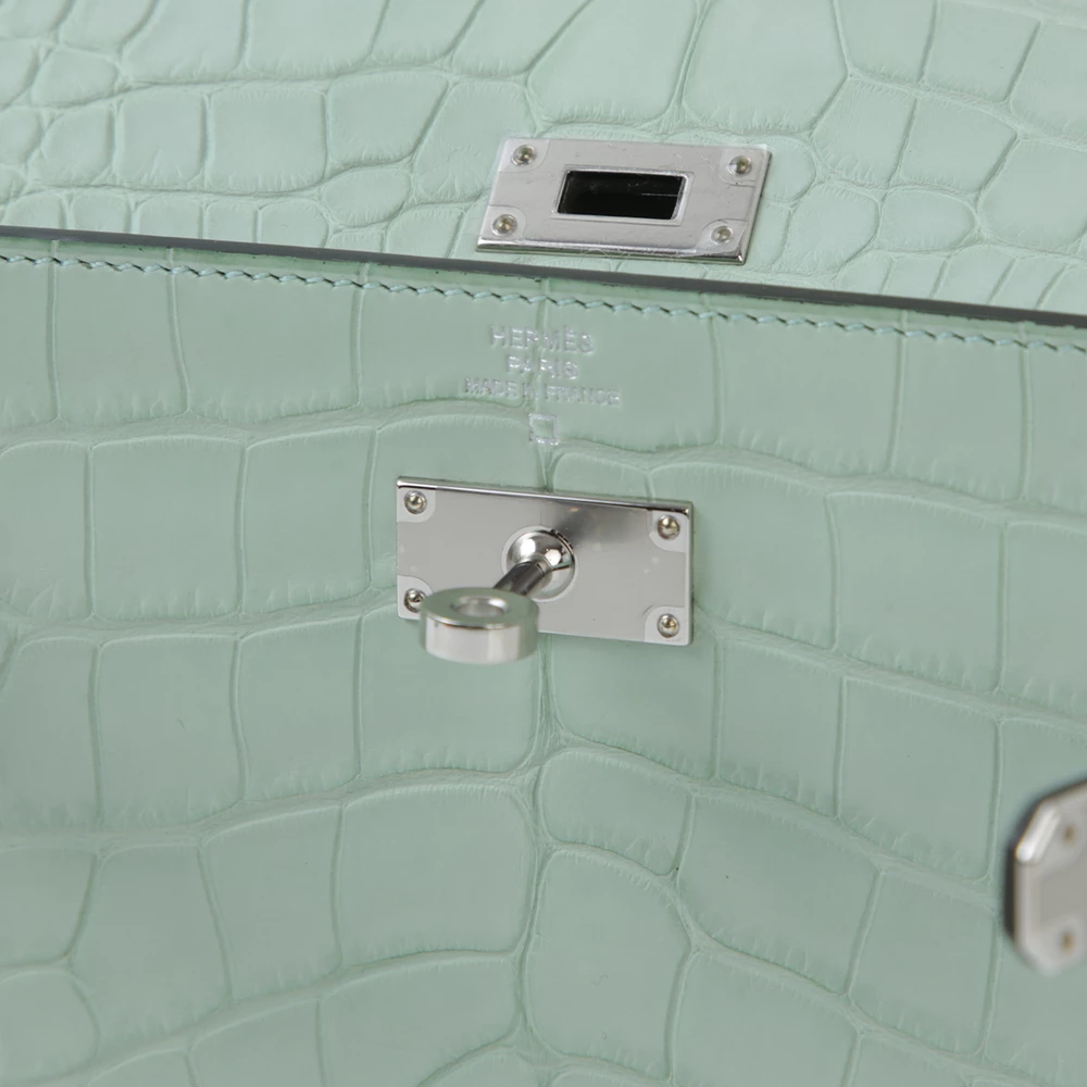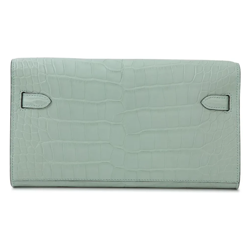 This Hermès Kelly Wallet is a masterpiece of elegance and craftsmanship, crafted from luxurious alligator leather in the serene Vert d’Eau (6U) shade. The rich texture of the exotic leather is perfectly complemented by sleek palladium hardware, enhancing its refined and timeless appeal. Stamped with a “B” for 2023, this exquisite piece embodies the exceptional artistry that defines Hermès. Measuring approximately 20.5cm in width, 11cm in height, and 2.5cm in depth, it offers a sophisticated yet practical design. The included 124.5cm shoulder strap allows for versatile styling, making it effortlessly wearable as a chic handbag. Accompanied by its original box, dustbag, shoulder strap, receipt, and CITES certificate, this highly sought-after wallet is available in Japan, making it a prized addition to any luxury collection.
