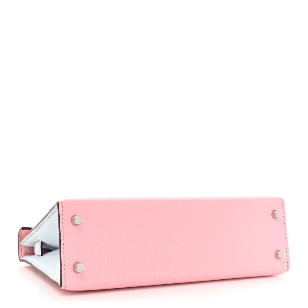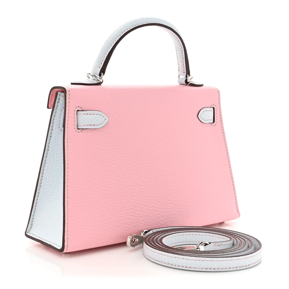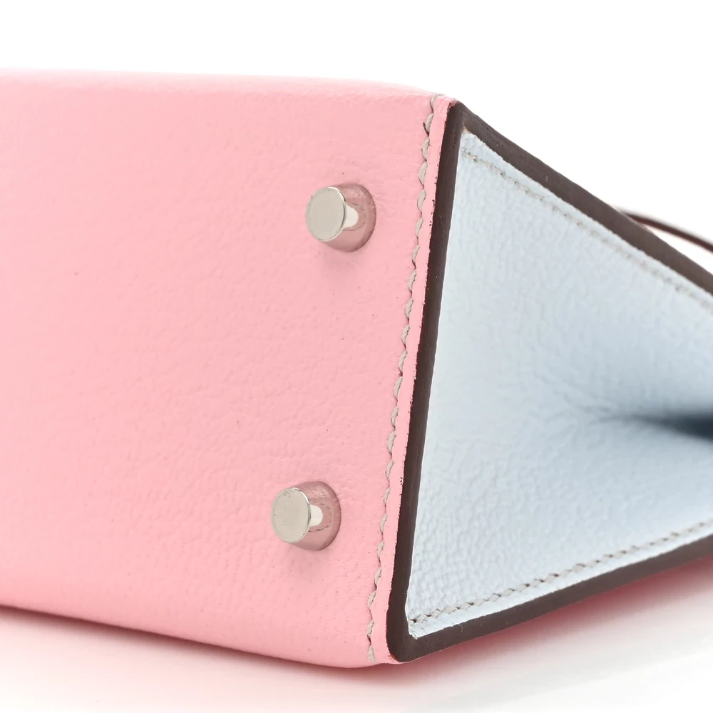 This Hermès Chèvre Mysore Horseshoe Mini Kelly Sellier 20 Rose Sakura Bleu Brume is a rare and charming handbag with a custom Horseshoe Stamp. The Chèvre Mysore leather offers a fine grain and subtle sheen, enhancing its luxurious appeal. The delicate Rose Sakura exterior contrasts beautifully with the Bleu Brume interior. Palladium hardware complements the pastel hues, adding a modern touch. This Mini Kelly is a dream piece for collectors.
