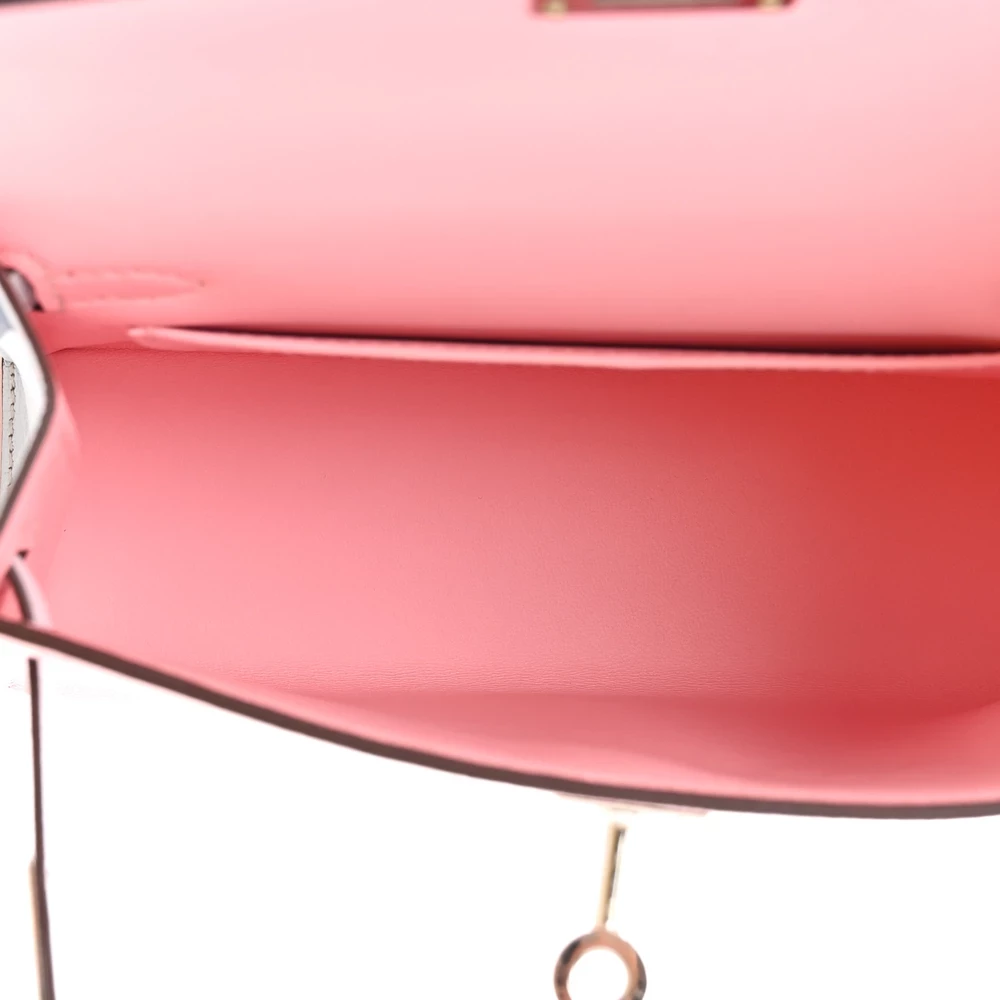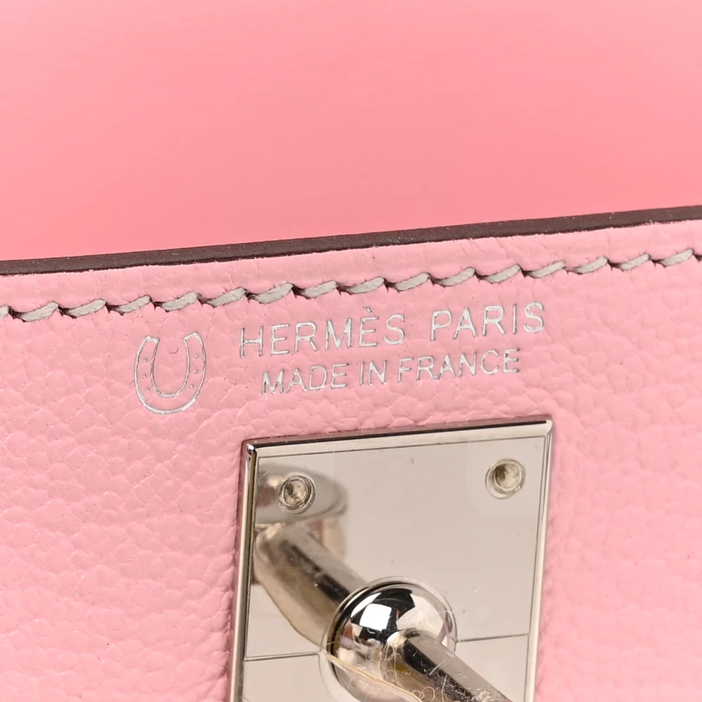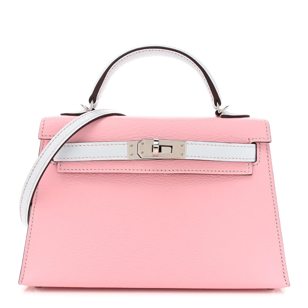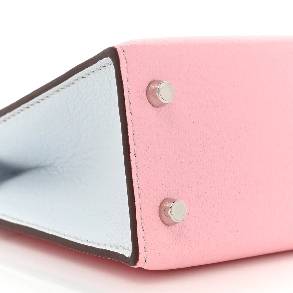 This Hermès Chèvre Mysore Horseshoe Mini Kelly Sellier 20 Rose Sakura Bleu Brume is a rare and charming handbag with a custom Horseshoe Stamp. The Chèvre Mysore leather offers a fine grain and subtle sheen, enhancing its luxurious appeal. The delicate Rose Sakura exterior contrasts beautifully with the Bleu Brume interior. Palladium hardware complements the pastel hues, adding a modern touch. This Mini Kelly is a dream piece for collectors.