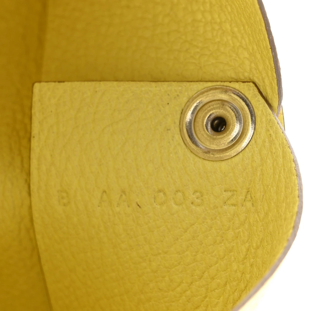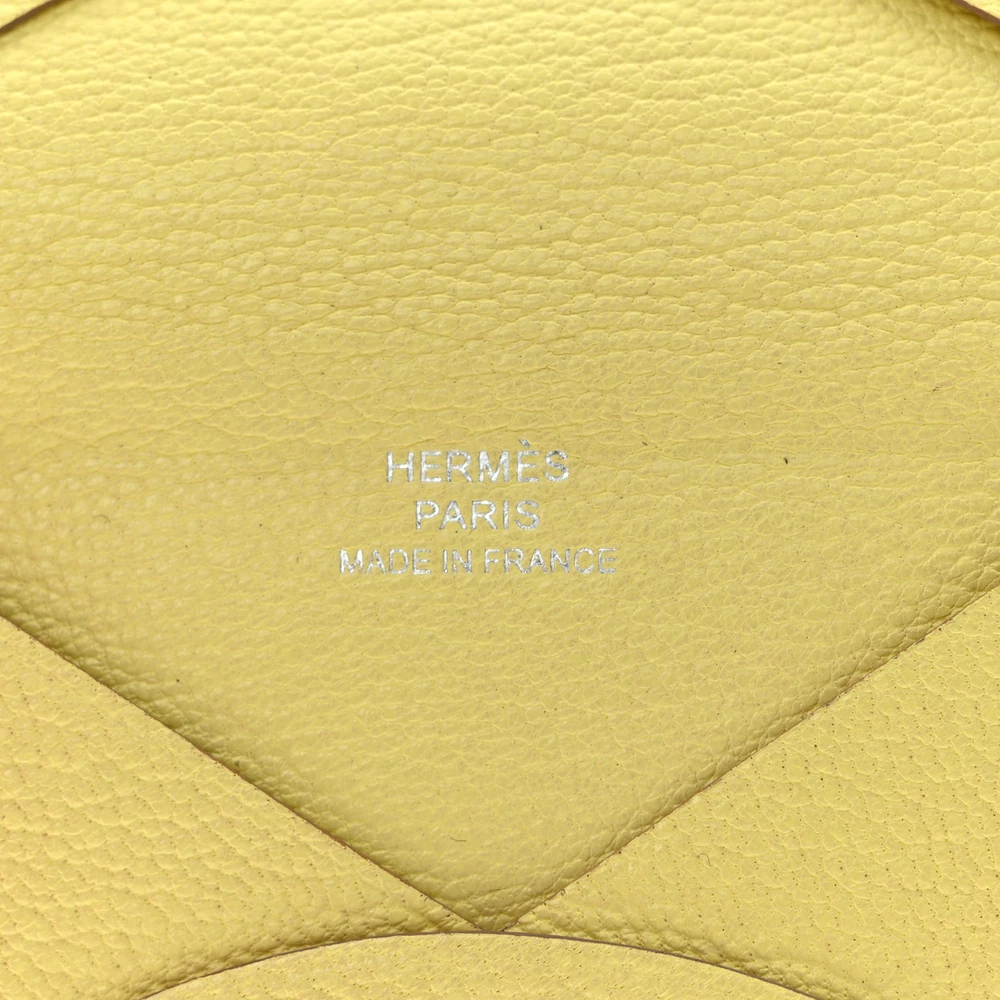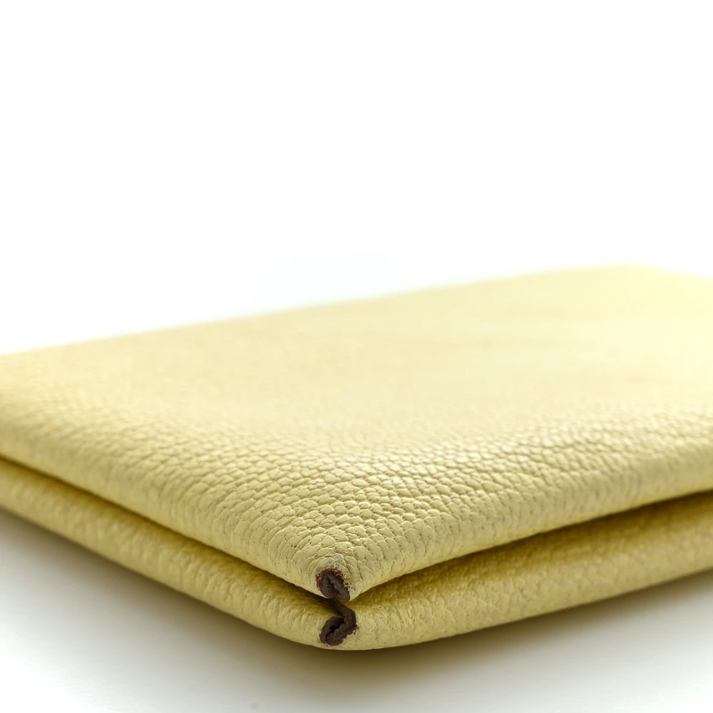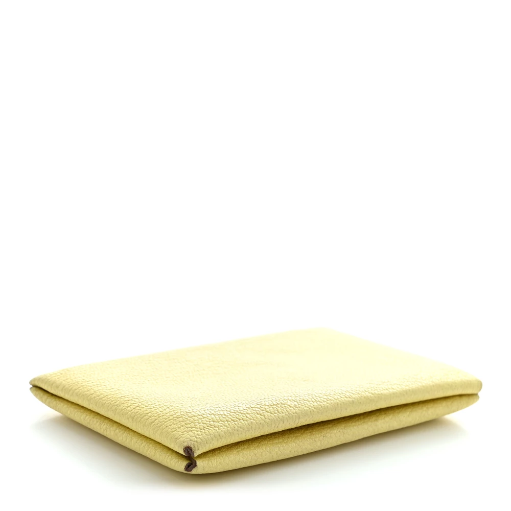 This Hermès Chevre Mysore Calvi Card Case in Limoncello is a vibrant and functional accessory that exudes effortless sophistication. Crafted from textured Chevre Mysore goatskin leather in a refreshing shade of yellow, this card case combines luxury with practicality. The fold-over design features a sleek, compact silhouette, perfect for holding business cards, IDs, and credit cards with ease. The interior is equipped with two envelope pockets, secured by an interior snap closure, ensuring your essentials are organized and safe. This stylish and lightweight card case is ideal for those who appreciate both form and function in a high-quality, everyday accessory.