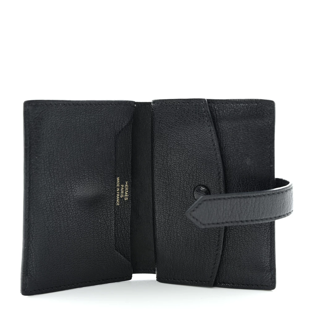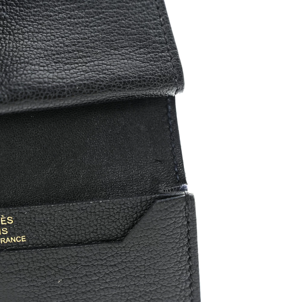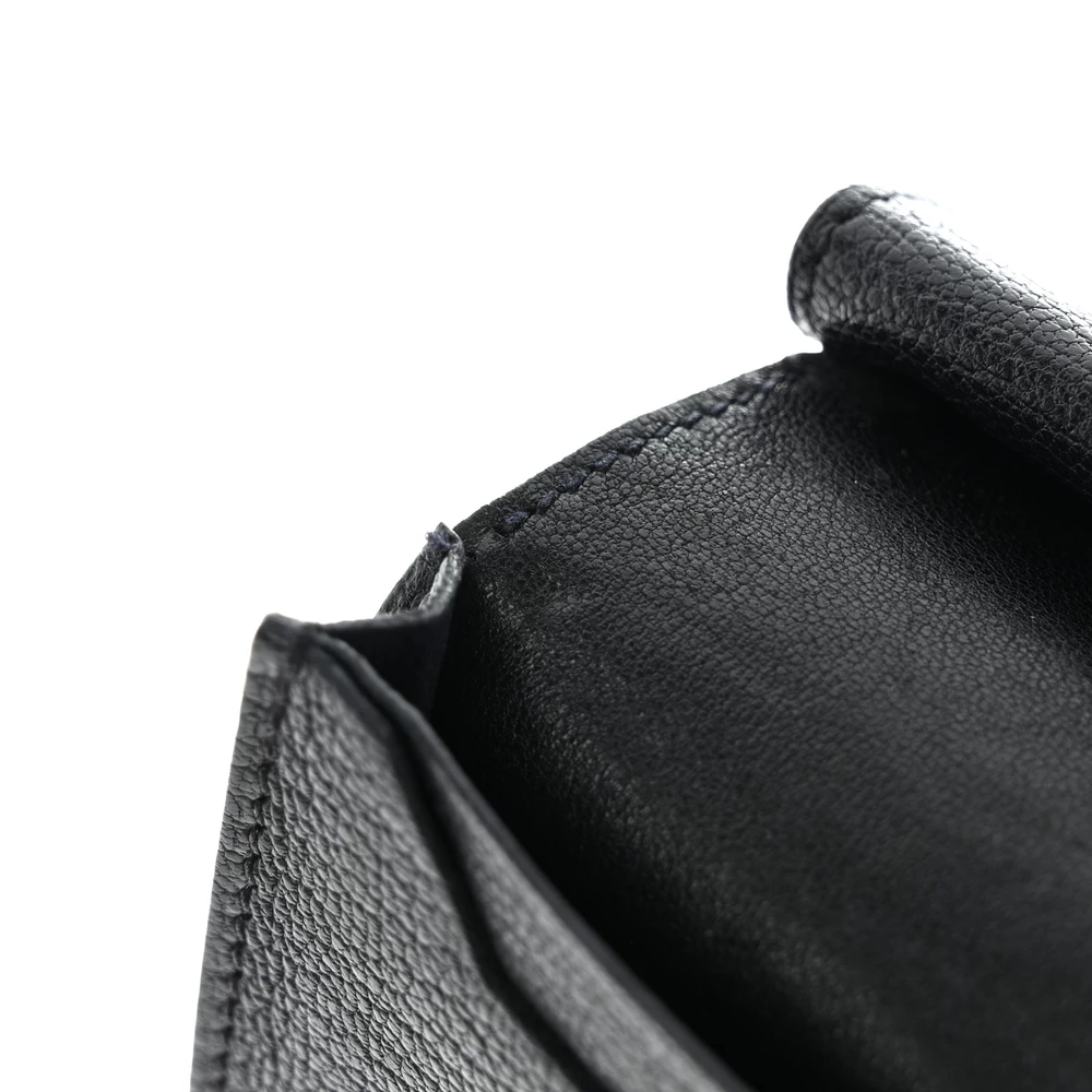 This Hermès Chevre Mysore Mini Bearn Wallet in Black is a refined and compact accessory that epitomizes understated luxury. Crafted from richly pebbled Chevre Mysore goatskin leather, this wallet boasts a supple texture and a sophisticated black hue. The wallet is secured with a crossover leather strap, adorned with the iconic gold Hermès “H” on the front flap, adding a touch of elegance. Inside, the wallet reveals a matching leather interior, complete with card slots and an envelope pocket for added functionality. Perfect for those who appreciate both style and practicality, this mini wallet is an ideal companion for any occasion.
