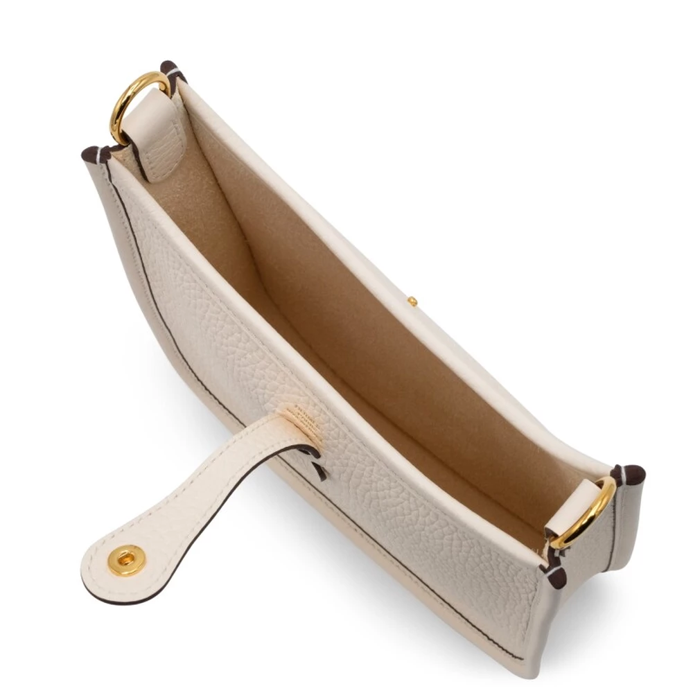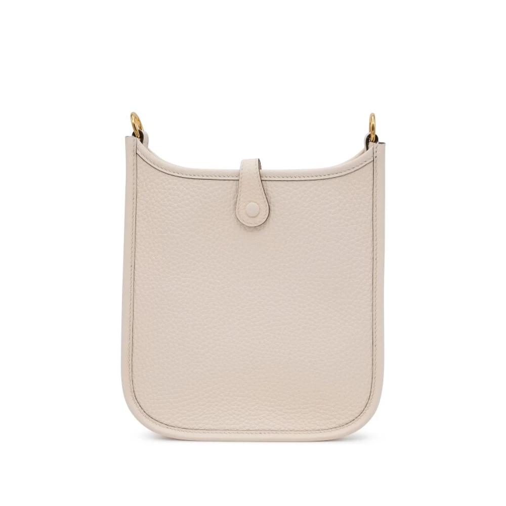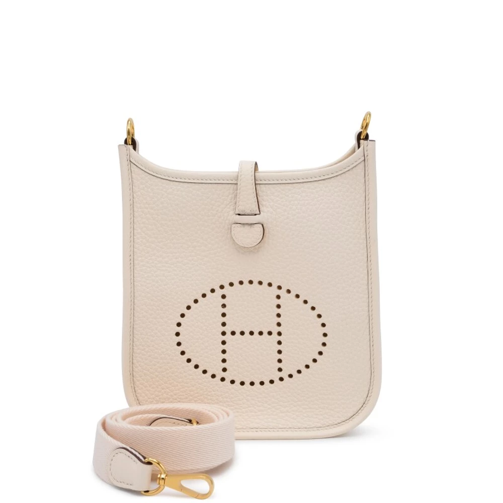 This Hermès Nata Clémence Mini Evelyne II TPM 16 with Gold Hardware is an elegant crossbody bag in a soft off-white hue. The creamy Nata shade is beautifully complemented by gold hardware, adding a refined touch. The perforated “H” logo and compact design make it an effortlessly chic choice for any occasion.
