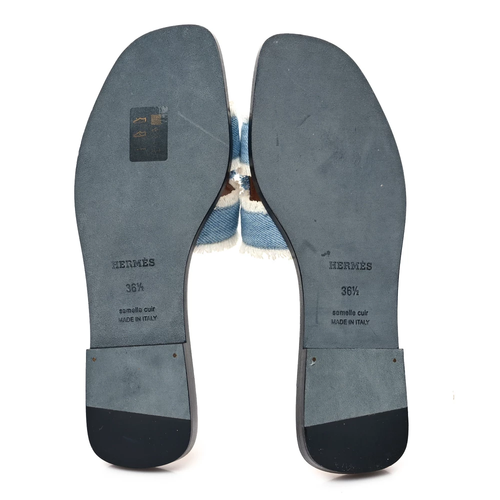 This Hermès Oran Fringe sandal in Bleu Clair denim is a fresh and modern twist on a classic design. The denim material adds a casual yet refined charm, while the frayed edges create a relaxed aesthetic. Designed with the signature H-cutout, it maintains its iconic silhouette. Whether paired with summer dresses or laid-back looks, this sandal exudes effortless cool.