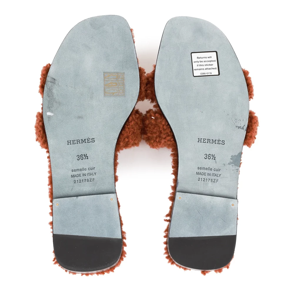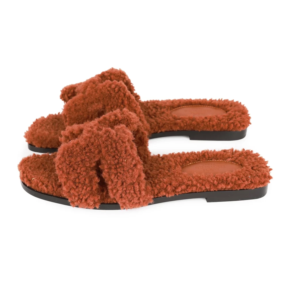 This Hermès Oran sandal in Cognac woolskin is a cozy and elegant take on the iconic silhouette. The rich brown woolskin adds texture and warmth, making it an ideal choice for cooler weather or relaxed luxury. The flat sole ensures all-day wearability, while the H-cut design remains effortlessly chic.