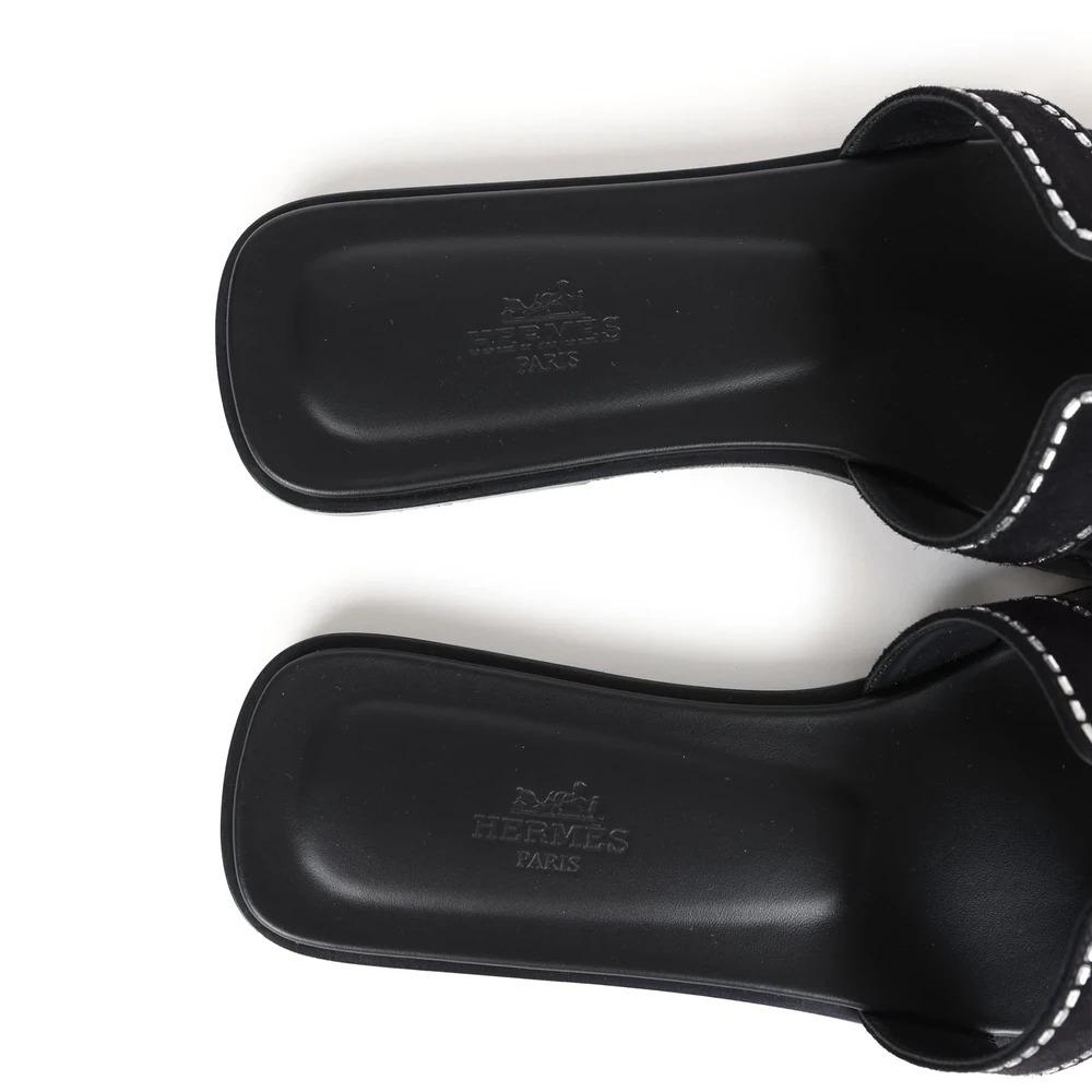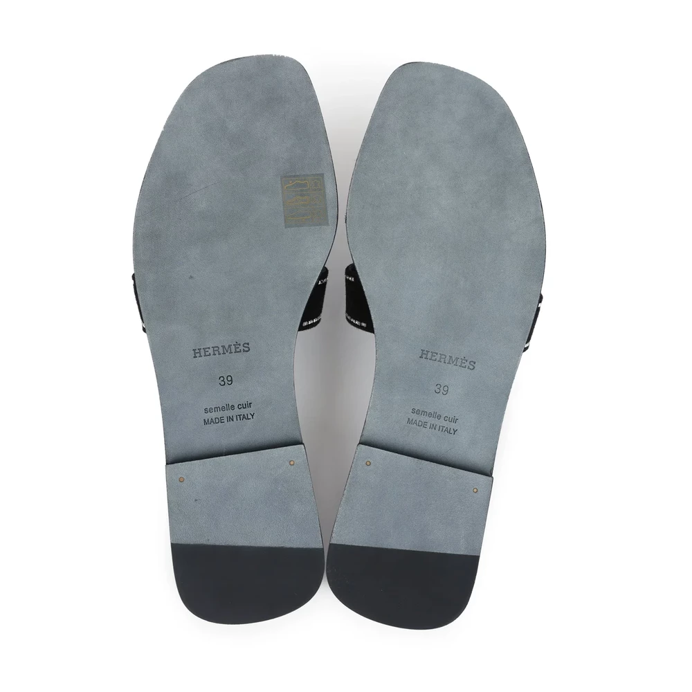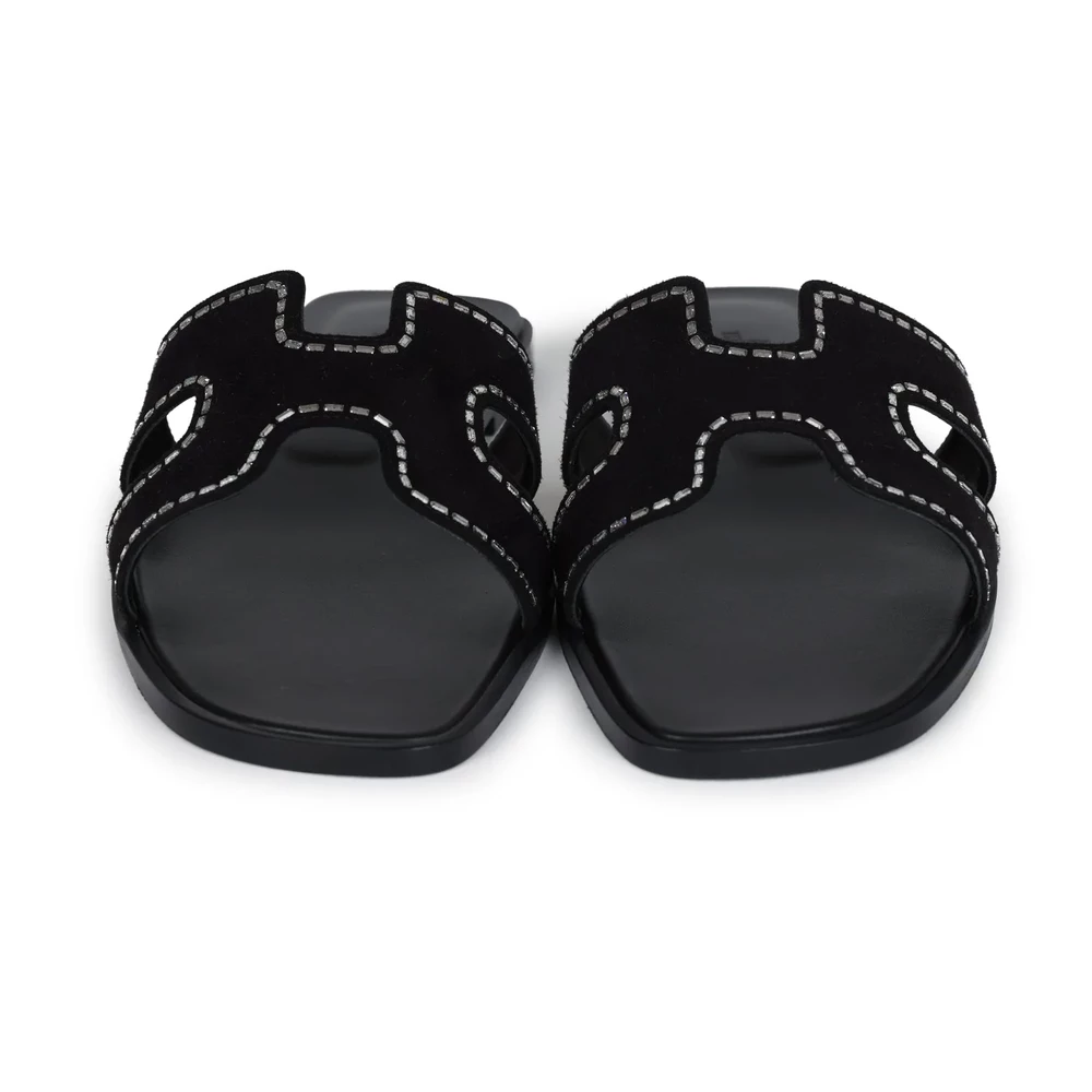 This Hermès Oran sandal in crystal-embellished black suede is a glamorous take on the iconic silhouette. The soft black suede is adorned with delicate crystal embellishments, adding a touch of refined sparkle. Featuring the signature H-cut upper and a flat sole, this sandal blends elegance with everyday wearability, perfect for those who love understated luxury with a dazzling finish.