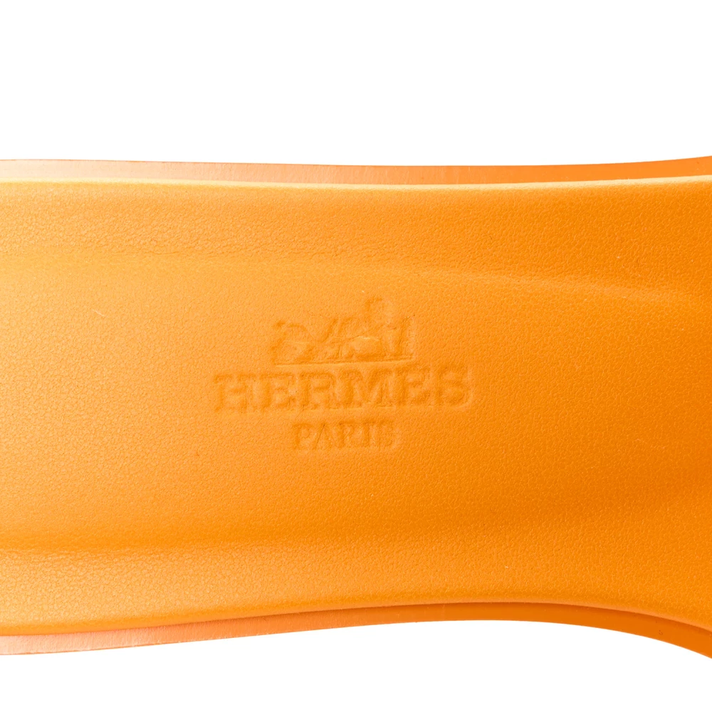 This Hermès Oran sandal in Orange Sunset Epsom leather is a bold and vibrant interpretation of the brand’s iconic design. The structured leather enhances its polished look, while the signature H-cutout maintains its classic appeal. Designed for effortless wear, it adds a pop of color to any wardrobe. Whether styled with neutrals or complementary hues, this sandal stands out beautifully.