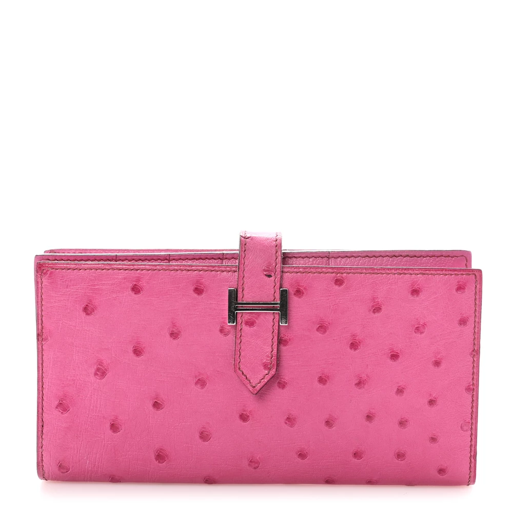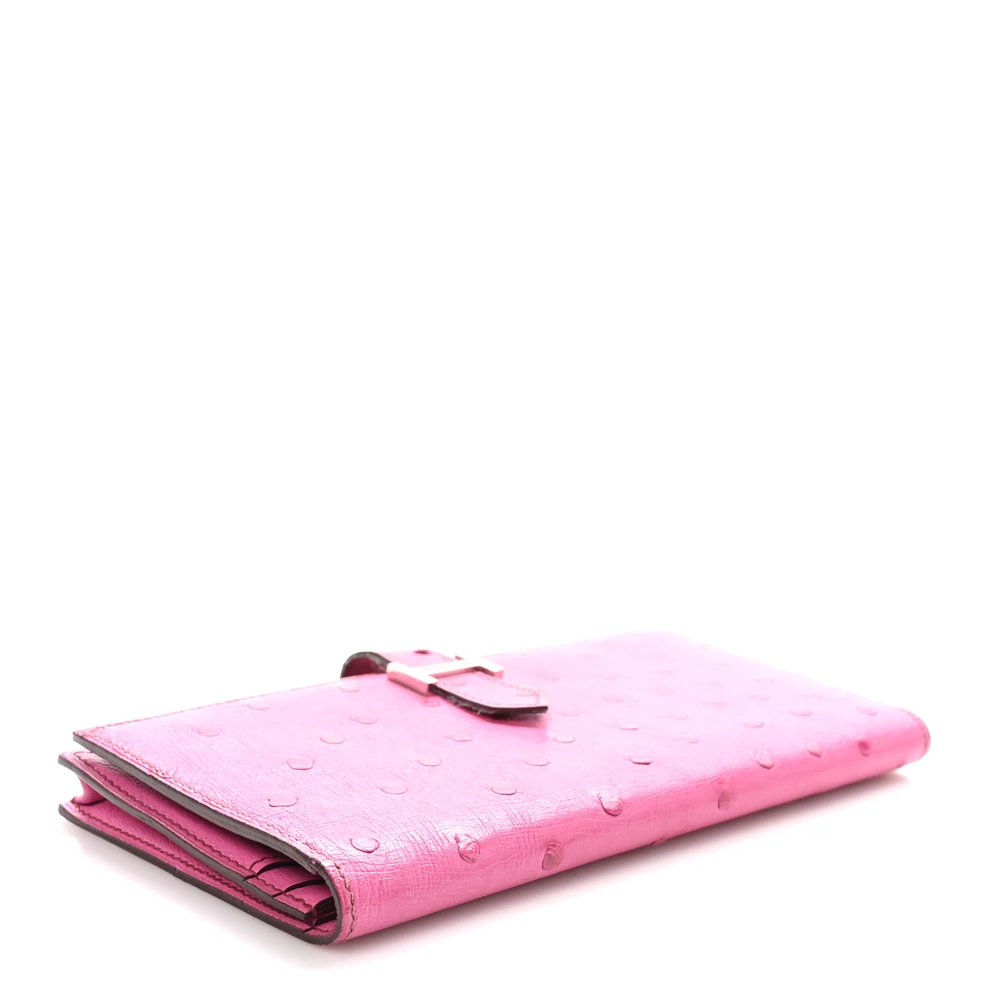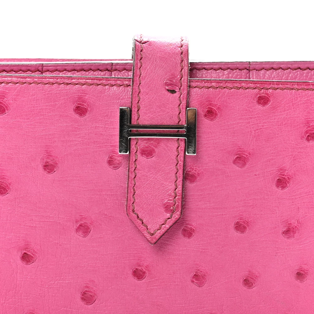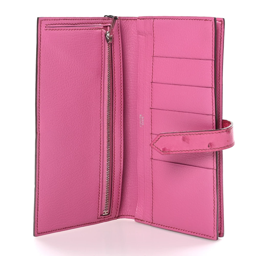 This Hermès Ostrich Bearn Wallet in Fuchsia is a stunning example of luxury and craftsmanship. Crafted from exotic ostrich leather, this wallet boasts a striking red hue with subtle pink undertones, creating a vibrant and sophisticated look. The elegant crossover strap, adorned with sleek silver palladium hardware, secures the wallet and opens to a thoughtfully designed interior. Inside, you’ll find a compact yet functional layout with card slots, patch pockets, billfolds, and a zippered currency compartment, all lined with matching leather. This chic and refined wallet is the perfect blend of exotic elegance and practicality, making it an essential addition to any luxury collection.