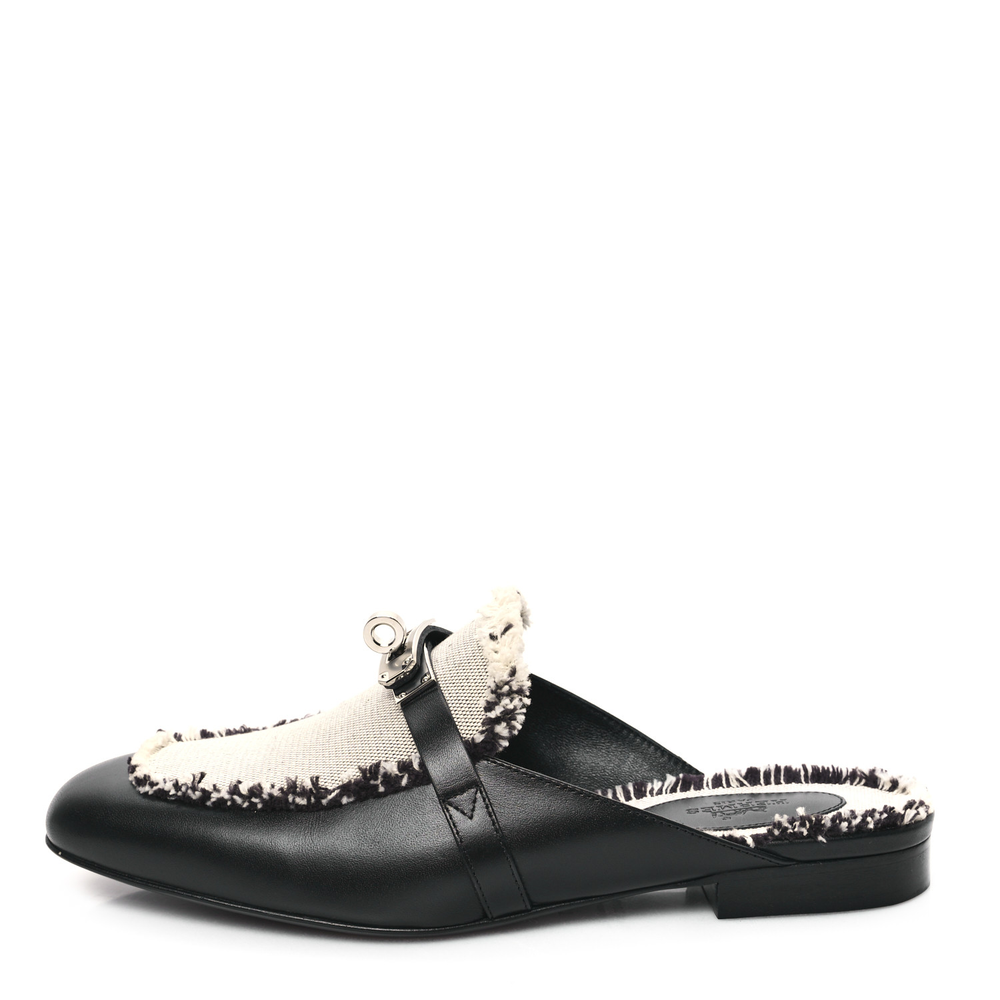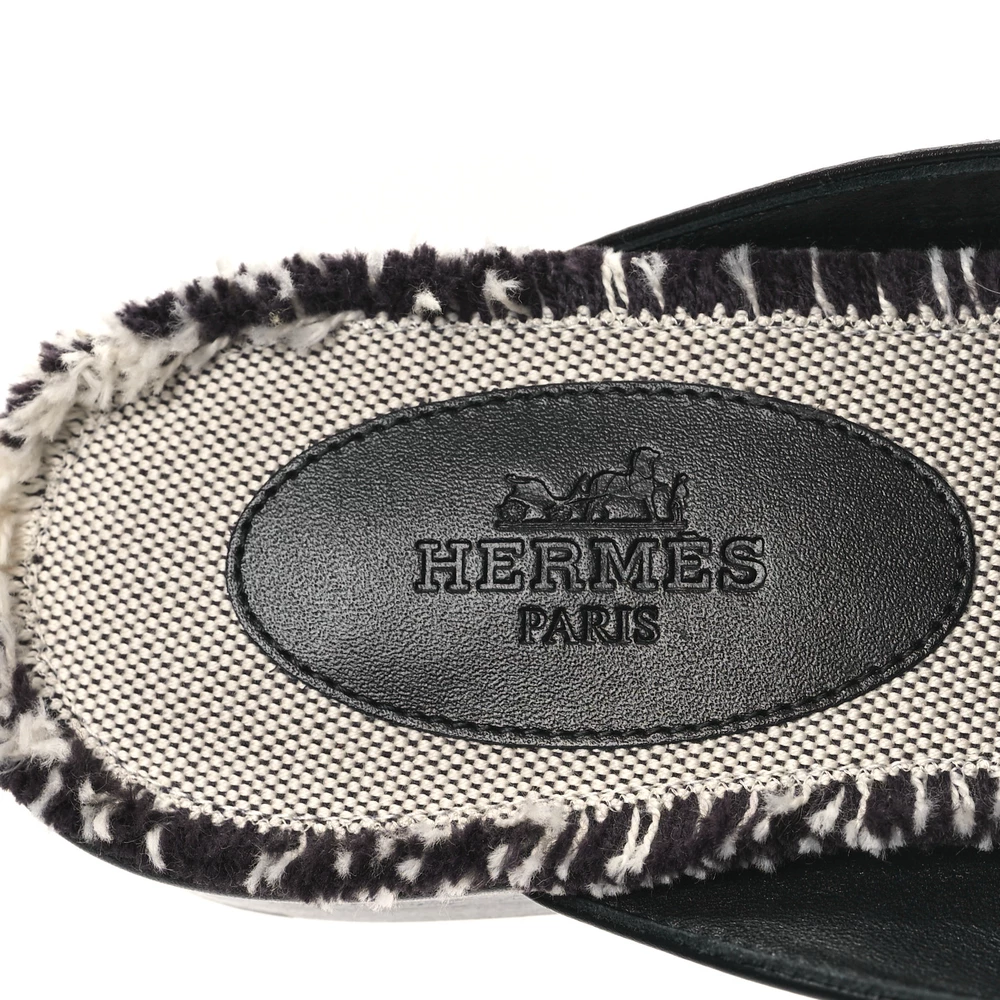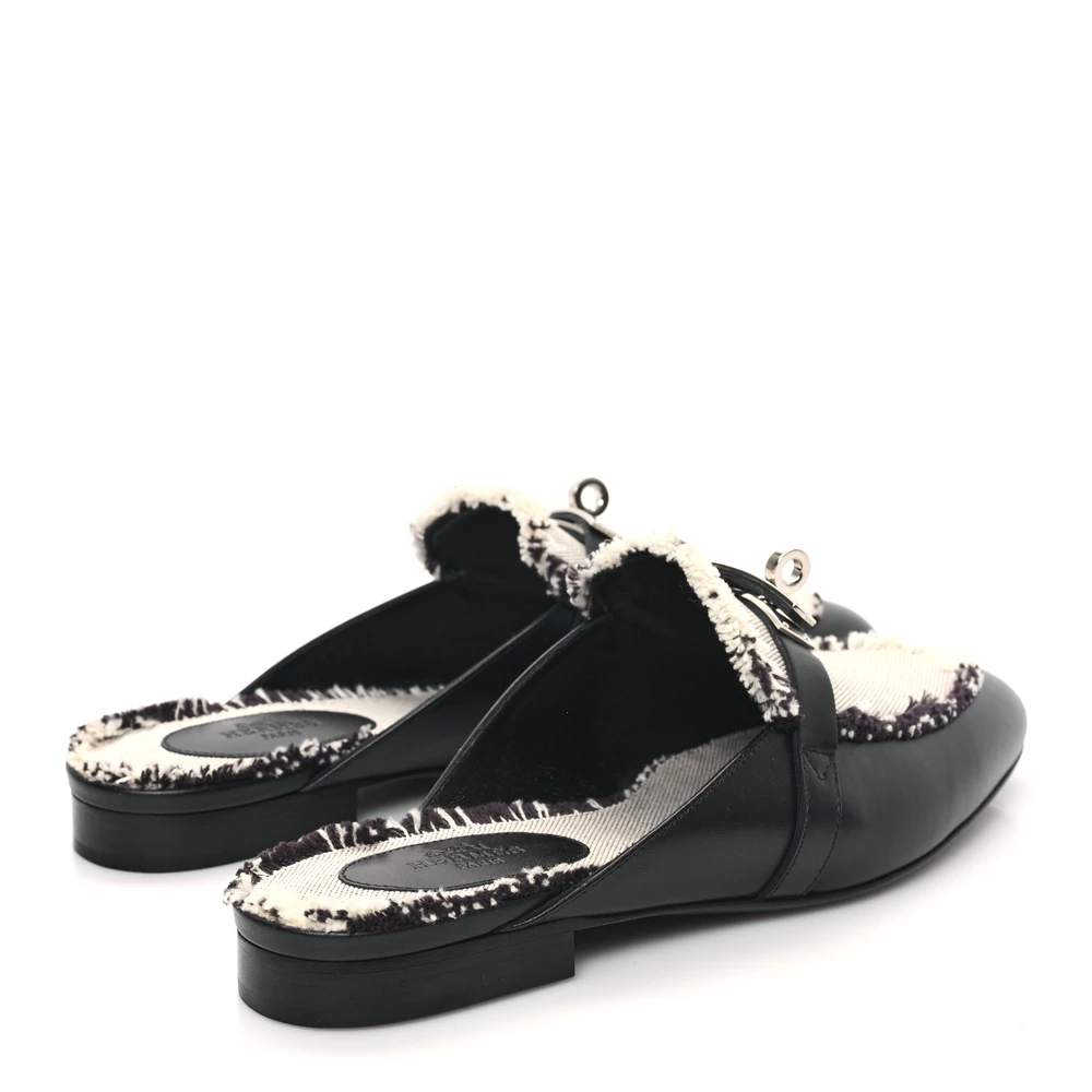 This Hermès Oz mule in Black Prunoir toile and calfskin fringe is a striking blend of texture and style. The frayed detailing adds a playful edge, while the structured leather ensures a refined finish. Designed for slip-on convenience, it provides both fashion and function. Whether styled with tailored pieces or relaxed ensembles, this mule makes a bold yet effortless statement.