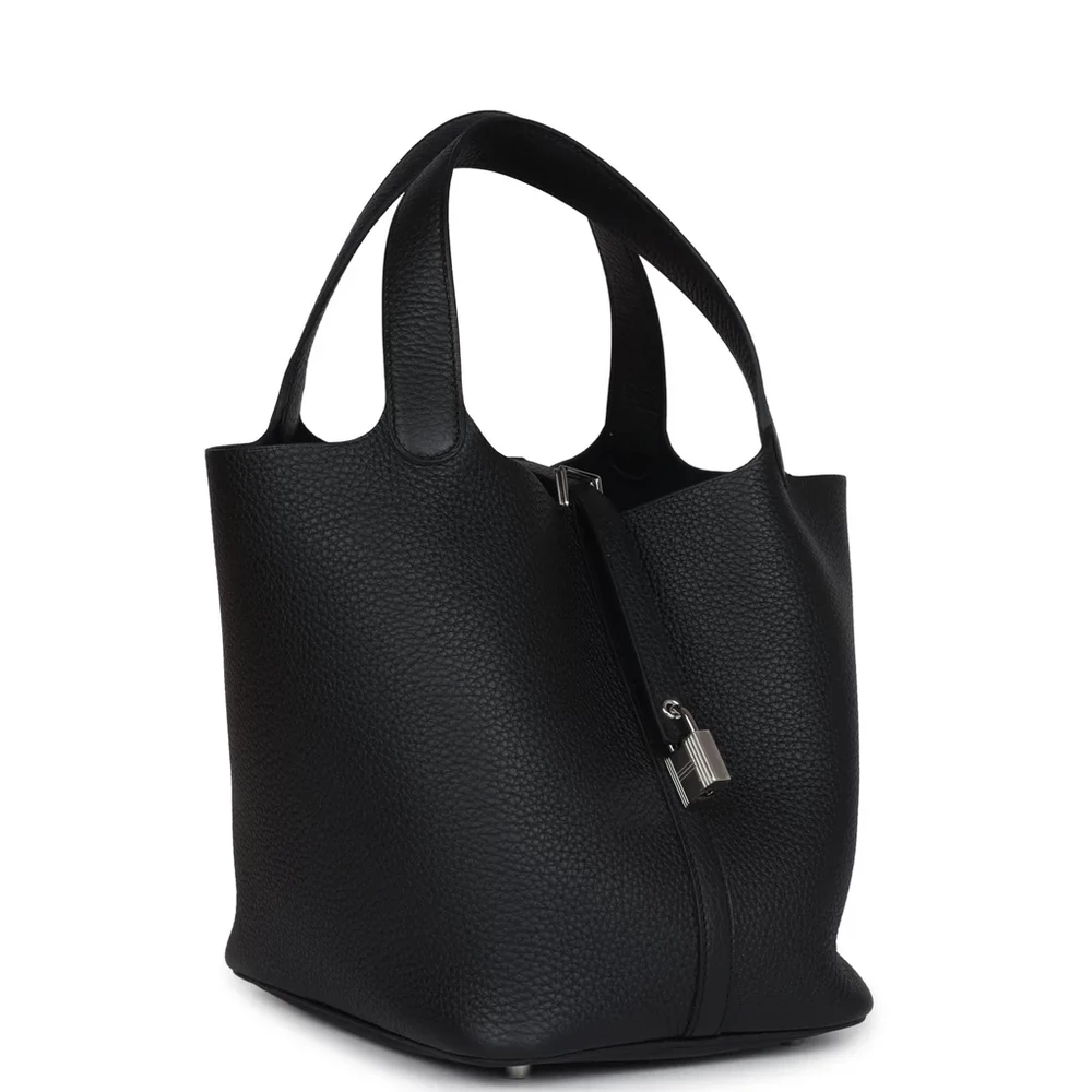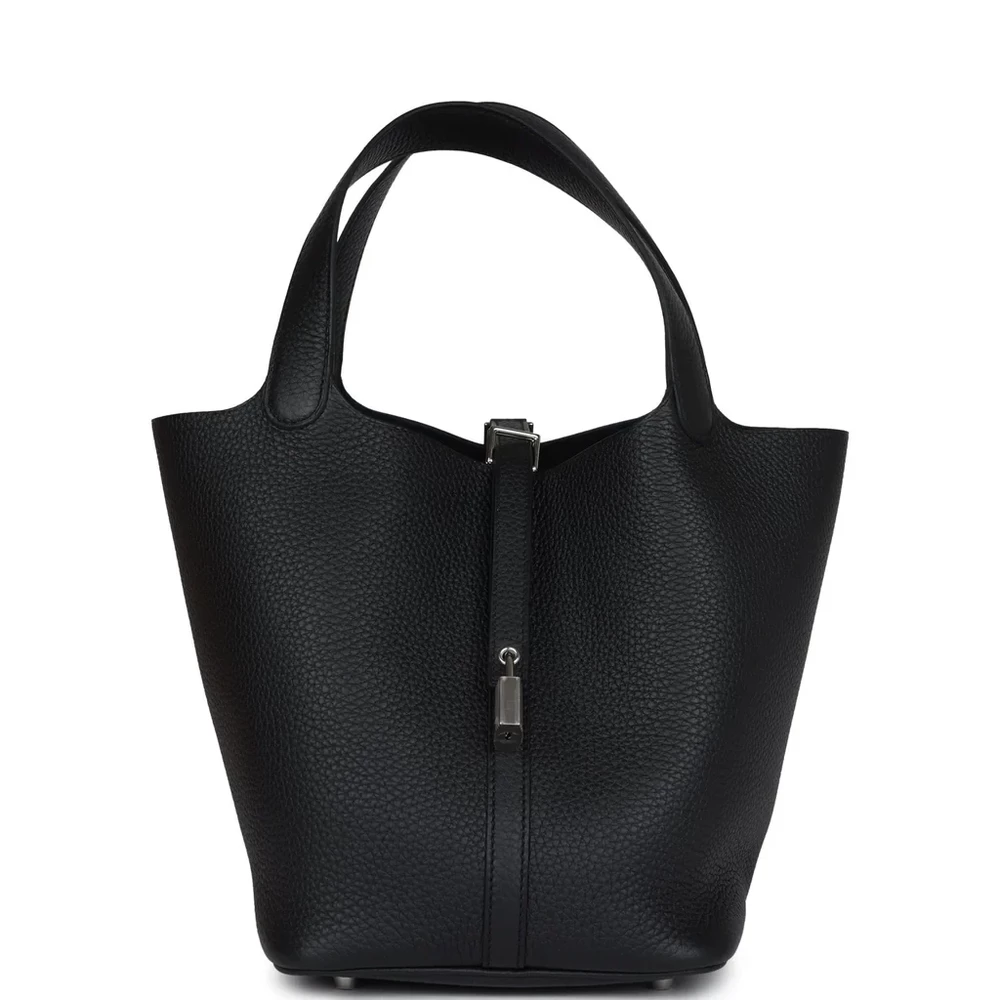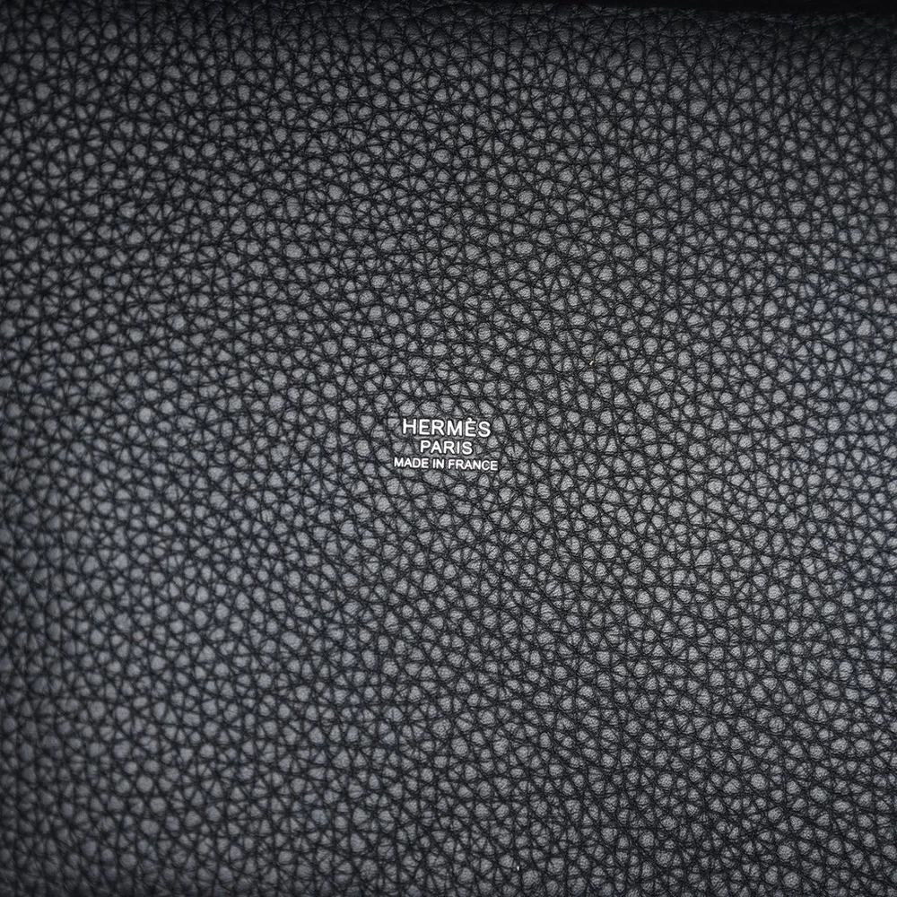 This Hermès Picotin Lock 22 Black Clémence with Palladium Hardware is a bold and practical handbag in sleek black. The larger 22 cm size offers more versatility, while the soft Clémence leather ensures a sophisticated and relaxed silhouette. The palladium hardware enhances its modern appeal. This Picotin is a perfect everyday luxury accessory.