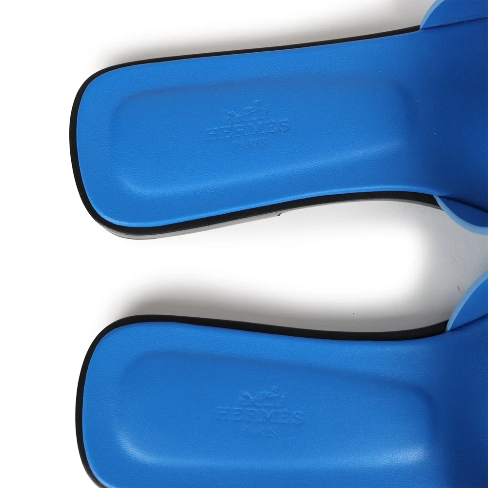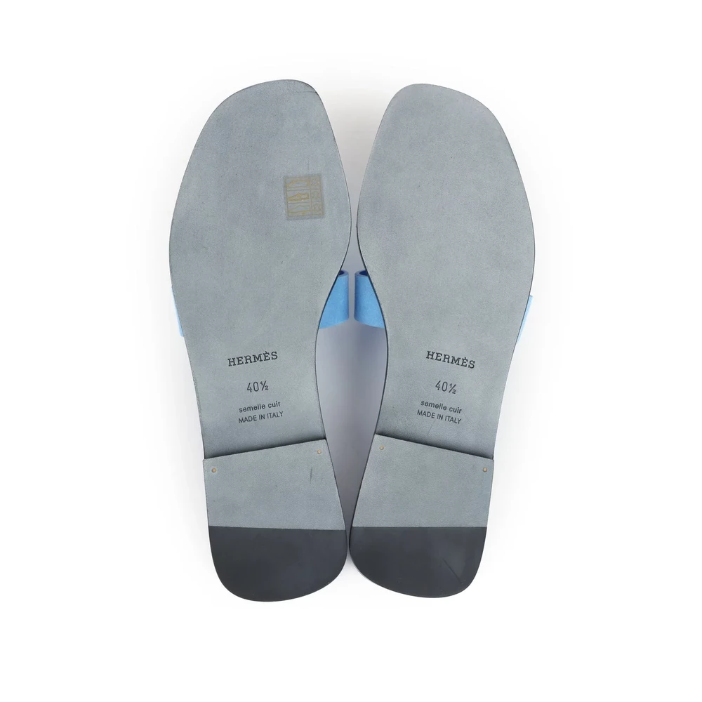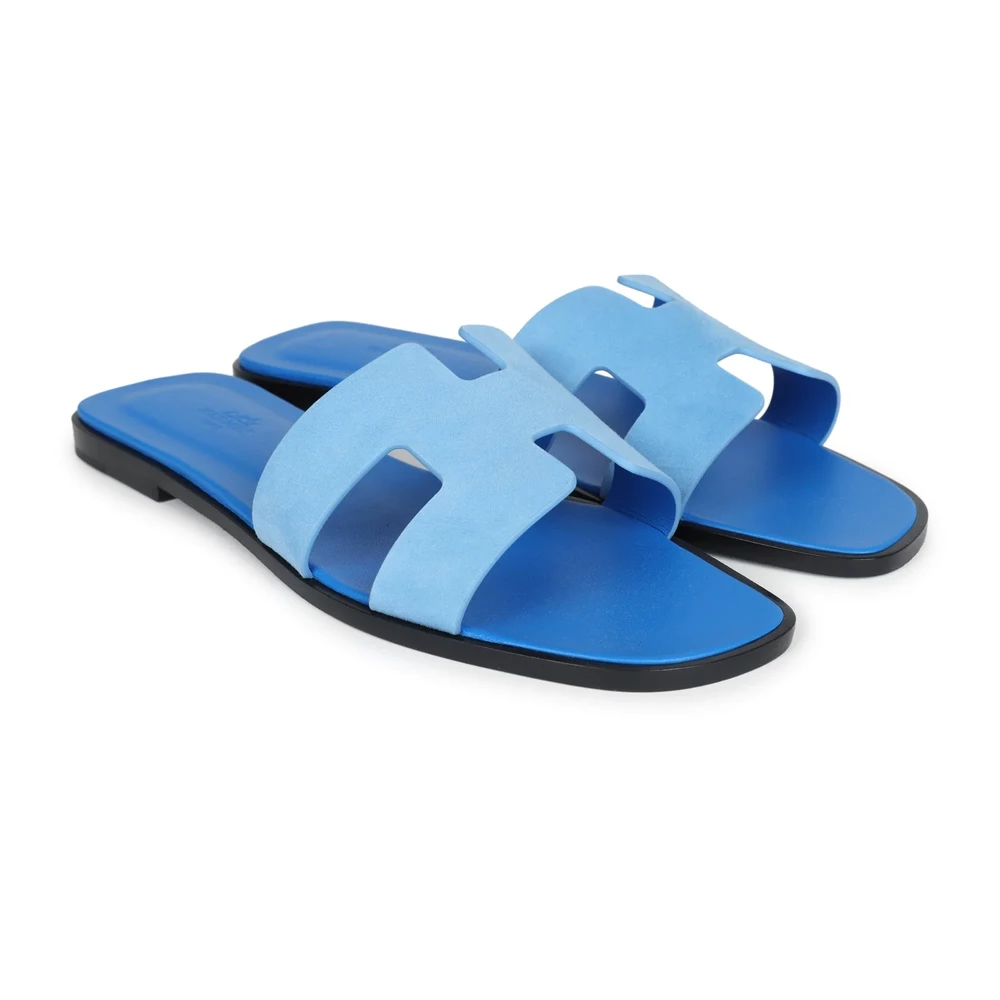 This Hermès Oran sandal in Bleu Cameo suede is a refined take on a classic design. The soft suede in a muted blue hue offers a sophisticated and understated look. The signature H-cut upper maintains the iconic silhouette, while the flat sole ensures everyday comfort. Perfect for those who appreciate timeless style with a modern touch.