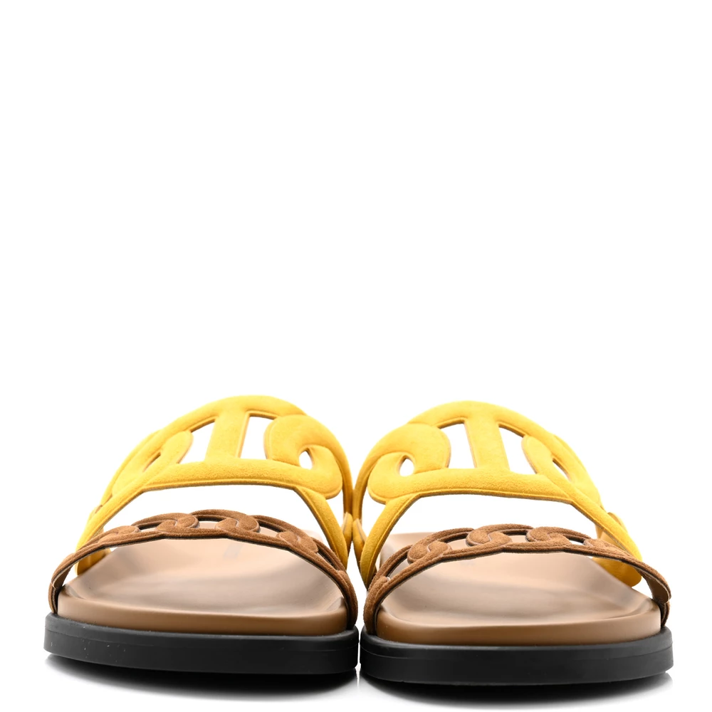 This Hermès Extra sandal in Jaune Topaze Suede & Goatskin is a bold and playful footwear choice. The vibrant yellow hue adds a striking pop of color, while the suede texture enhances its luxurious appeal. Designed with a comfortable fit, it’s perfect for making a statement in any outfit. Whether worn casually or styled for a special occasion, this sandal brings a unique charm.