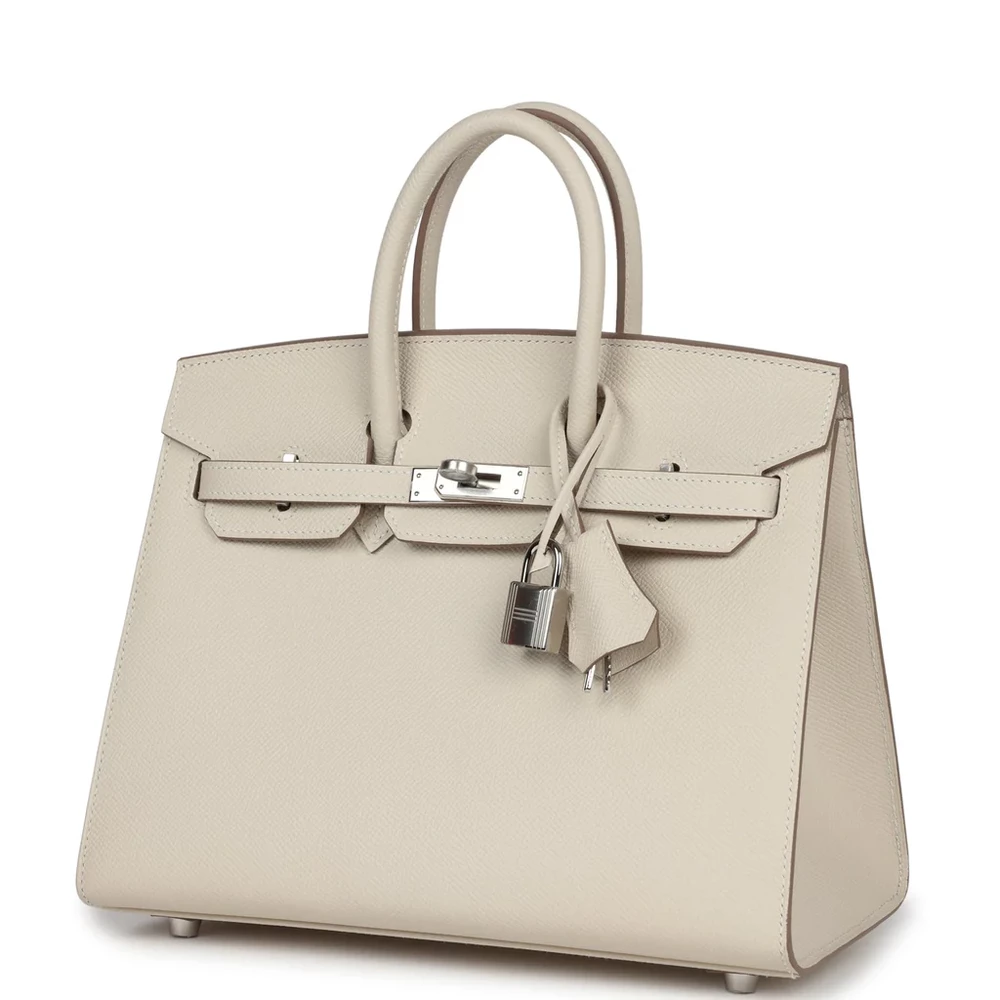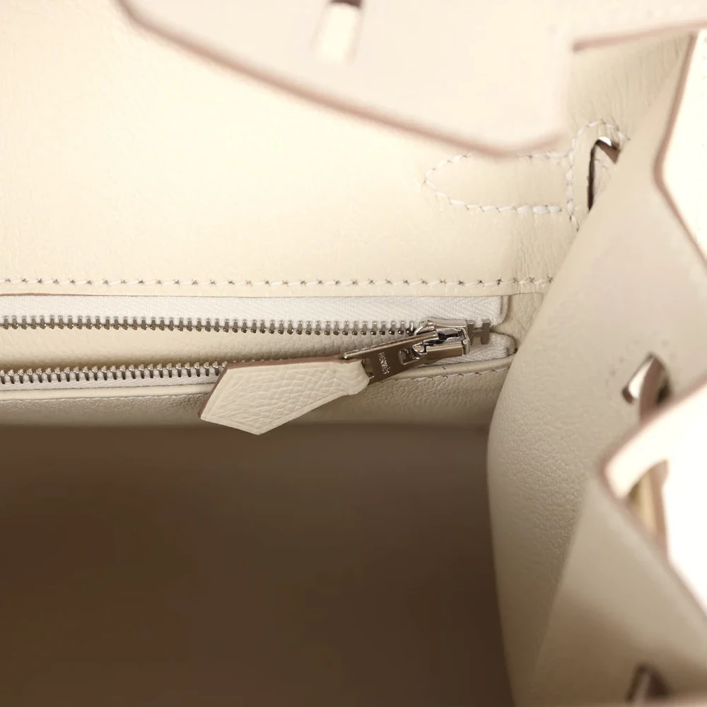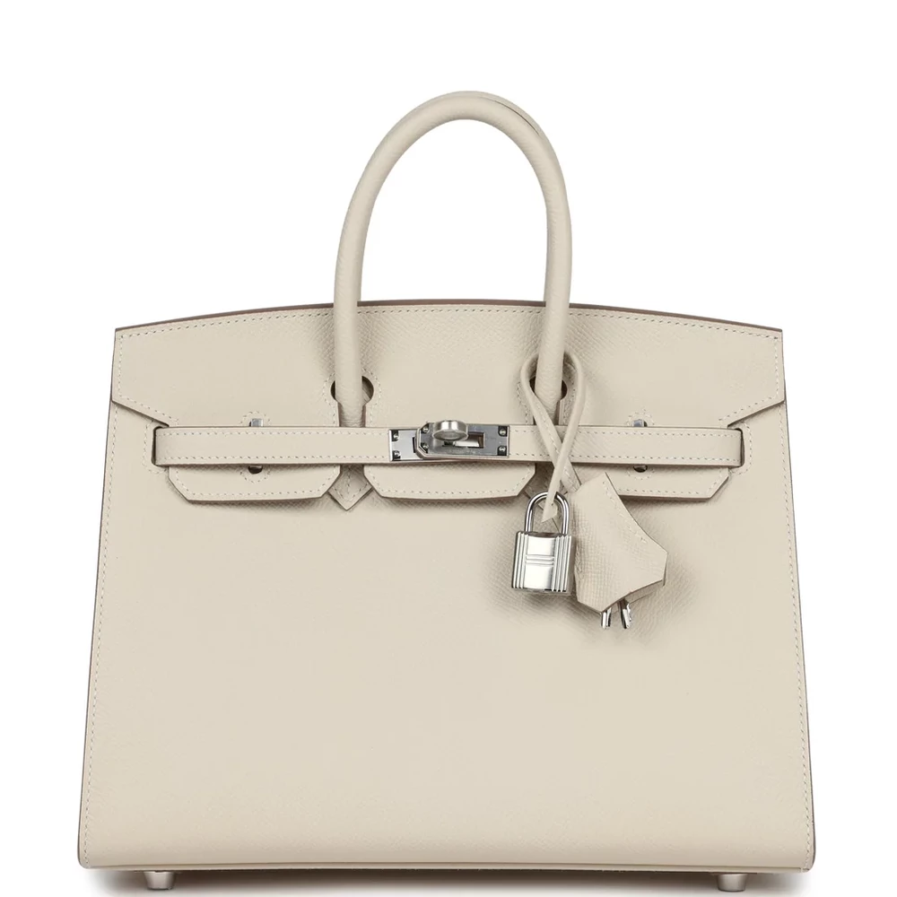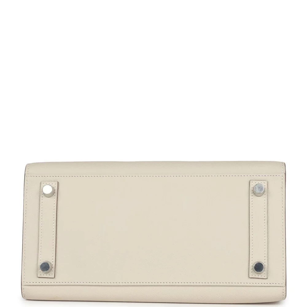 This Hermès Birkin is made from Craie Epsom leather with palladium hardware, showcasing a classic design. It features tonal stitching, a front flap, and two straps with a center toggle closure for a secure fastening. The bag also includes a clochette with a lock and two keys, along with double rolled handles for easy carrying. The interior is lined with Craie Chevre leather for a smooth and luxurious feel. One zip pocket with an Hermès engraved zipper pull and an open pocket on the opposite side provide convenient storage.