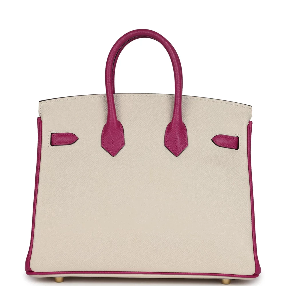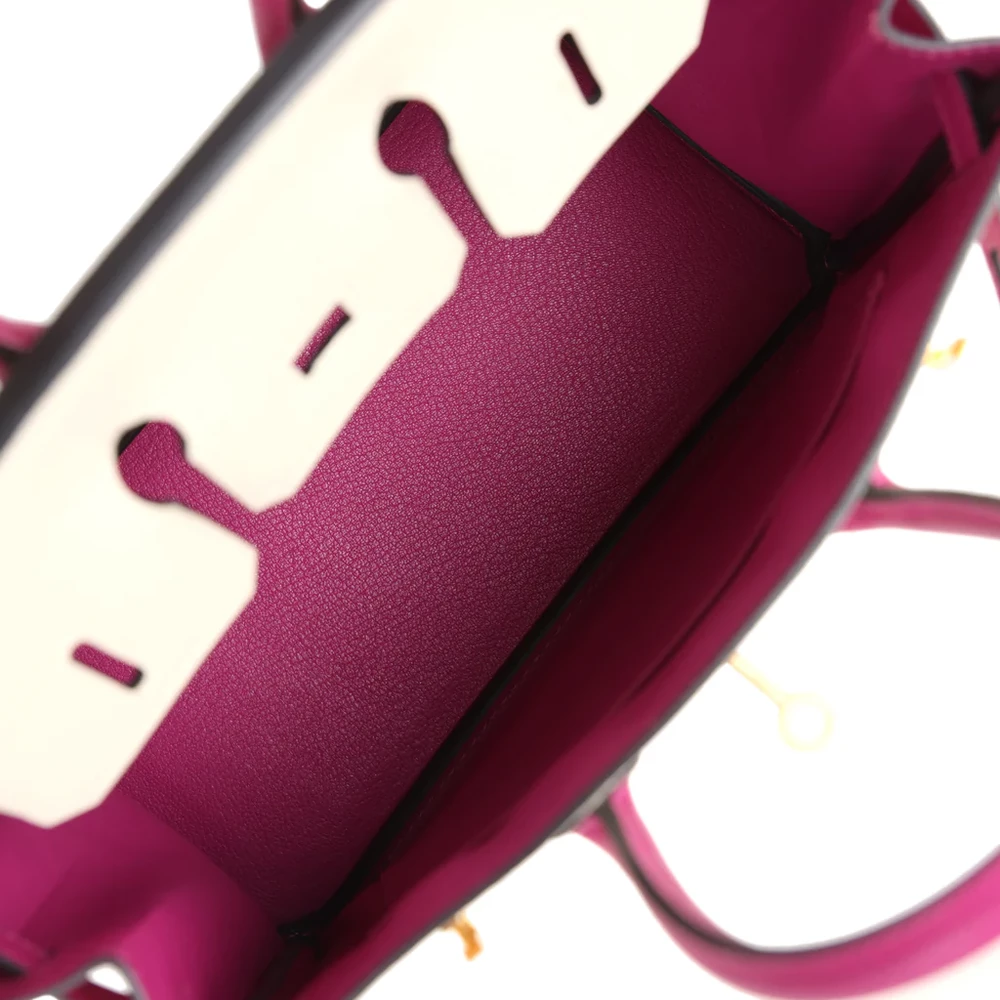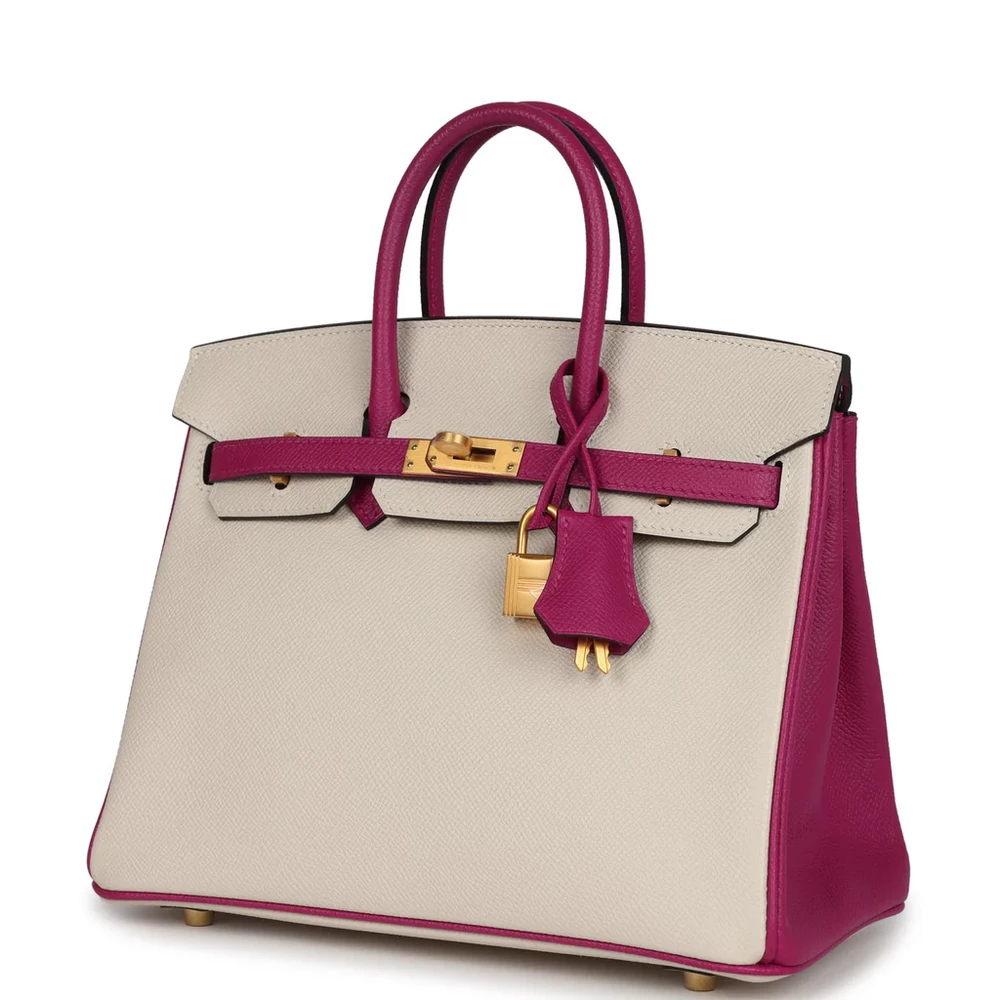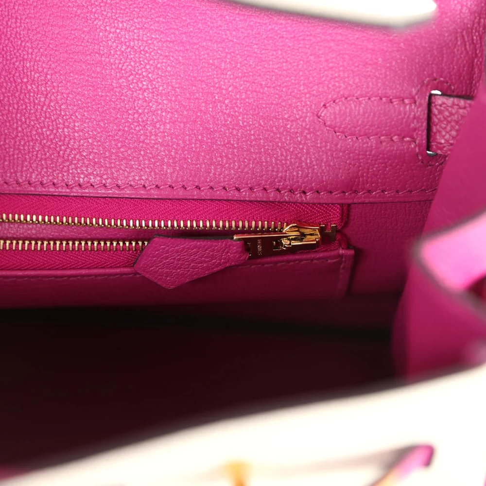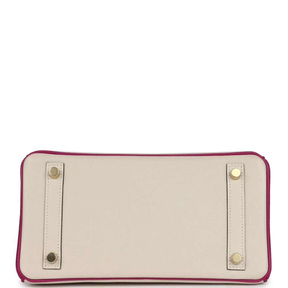 This Special Order Bi-color Sellier Hermès Birkin is made from Craie and Rose Pourpre Epsom leather with brushed gold hardware. The bag features tonal stitching and a front flap with two straps, secured by a center toggle closure for easy access. A clochette with a lock and two keys adds elegance, while the double rolled handles ensure comfort. Inside, the bag is lined with Rose Pourpre Chevre leather for a soft, refined finish. There is one zip pocket with an Hermès engraved zipper pull, and an open pocket on the opposite side for convenient storage.