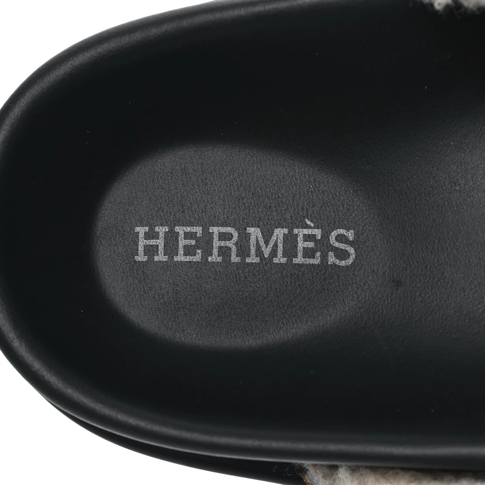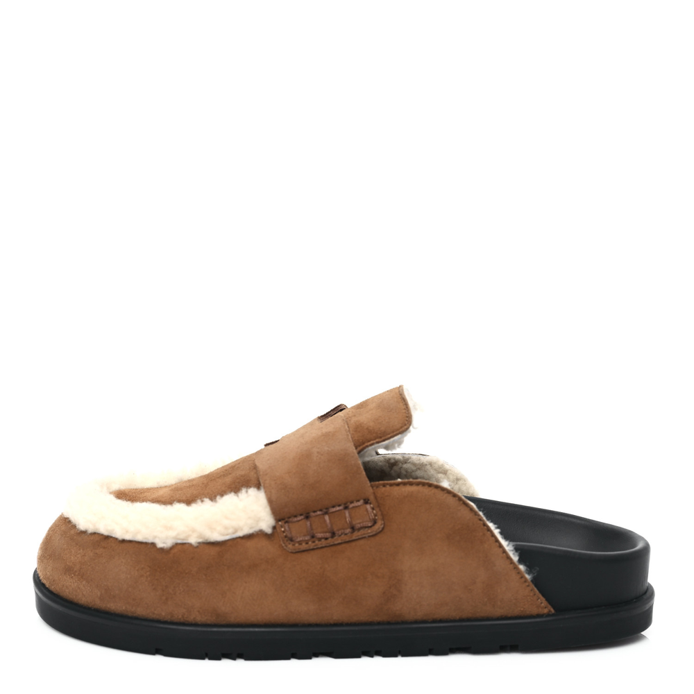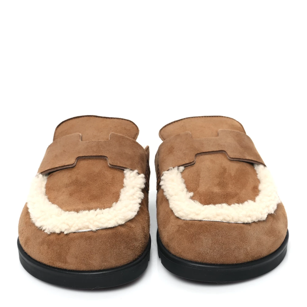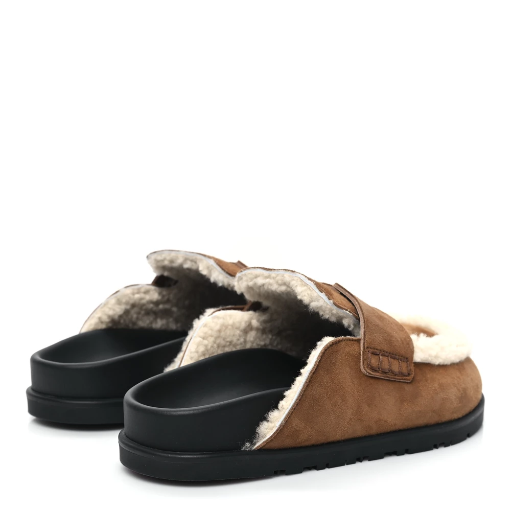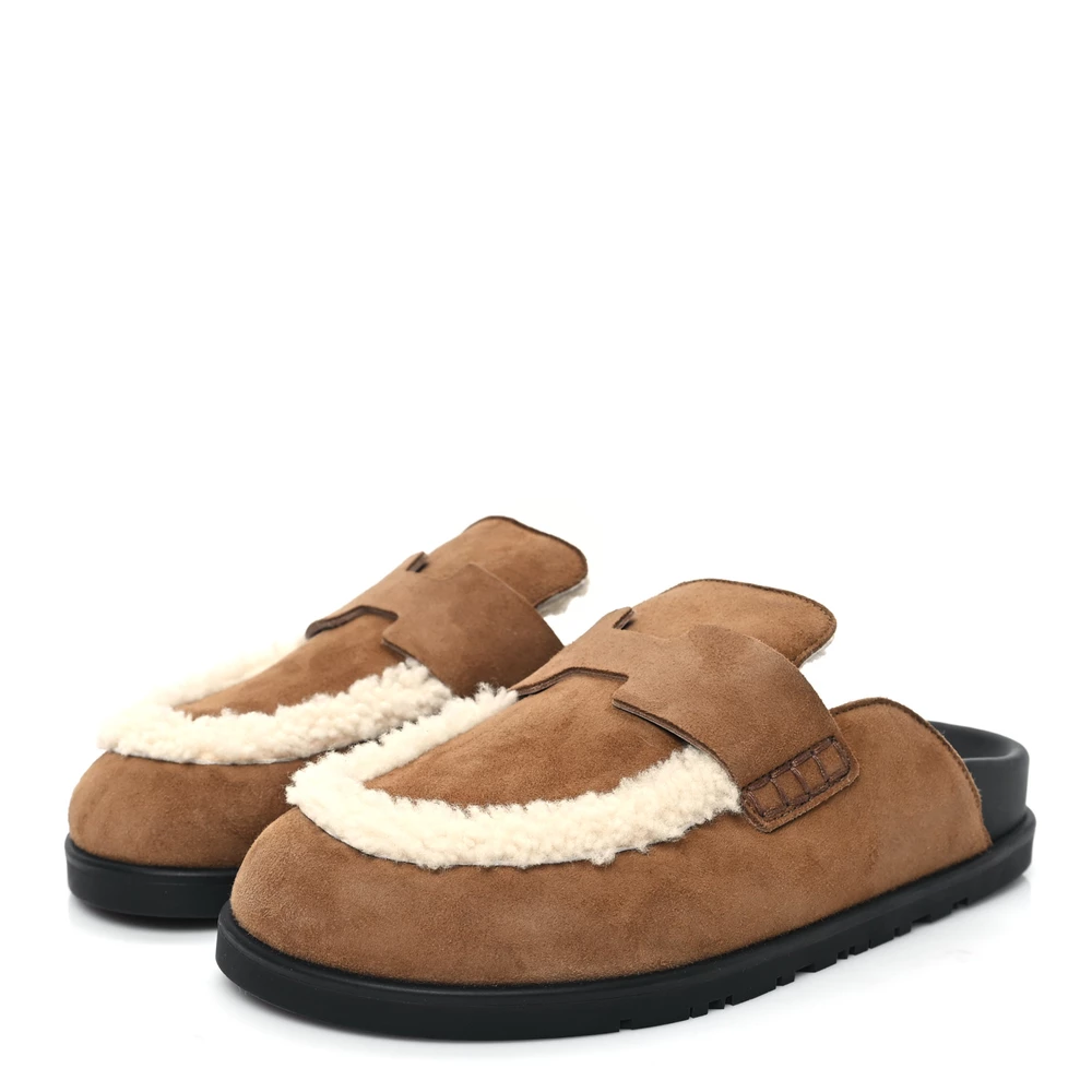 This Hermès Go mule in Beige Kraft and Ecru Suede & Goatskin shearling is a cozy and luxurious footwear choice. The plush shearling lining provides warmth and softness, while the suede exterior adds an elegant touch. Designed for comfort and ease, it features a supportive sole for all-day wear. Whether worn indoors or as a stylish statement outdoors, this mule embodies relaxed elegance.