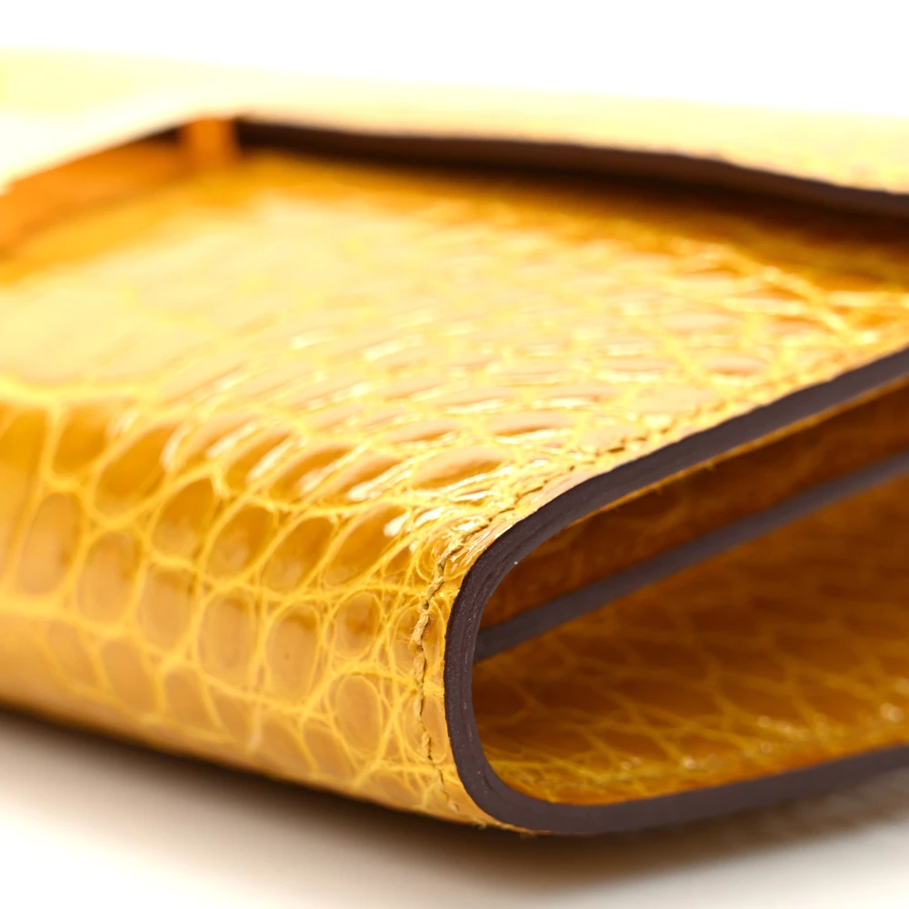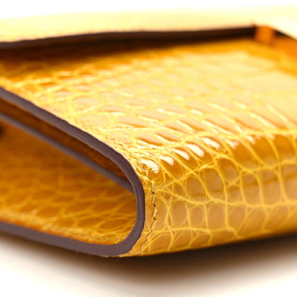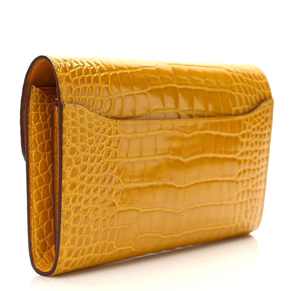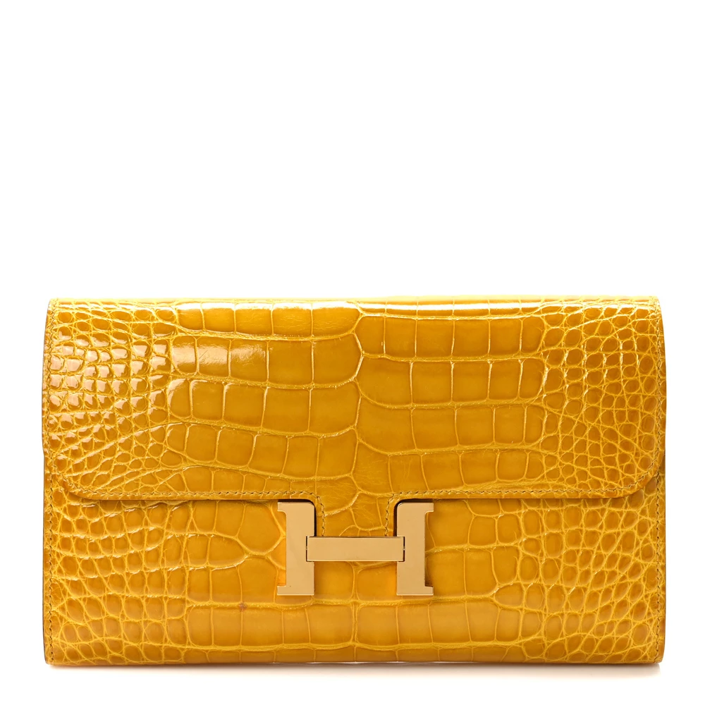 This Hermès Shiny Alligator Constance Long Wallet in Vert Emeraude is the epitome of refined luxury and sophistication. Expertly crafted from glossy alligator leather, it features a stunning emerald green hue that radiates opulence. The front flap is secured with a polished silver Hermès “H” clasp, adding a signature touch of elegance. Inside, the wallet opens to reveal a meticulously partitioned leather interior, complete with card slot panels on either side and a zipper compartment in the center, offering both organization and style. This exquisite wallet is a statement piece, perfect for those who appreciate impeccable craftsmanship and timeless luxury.