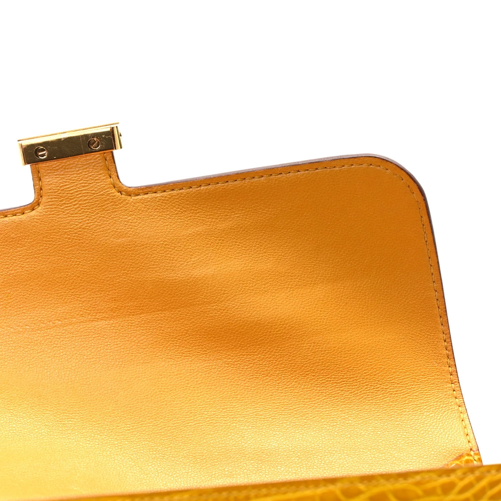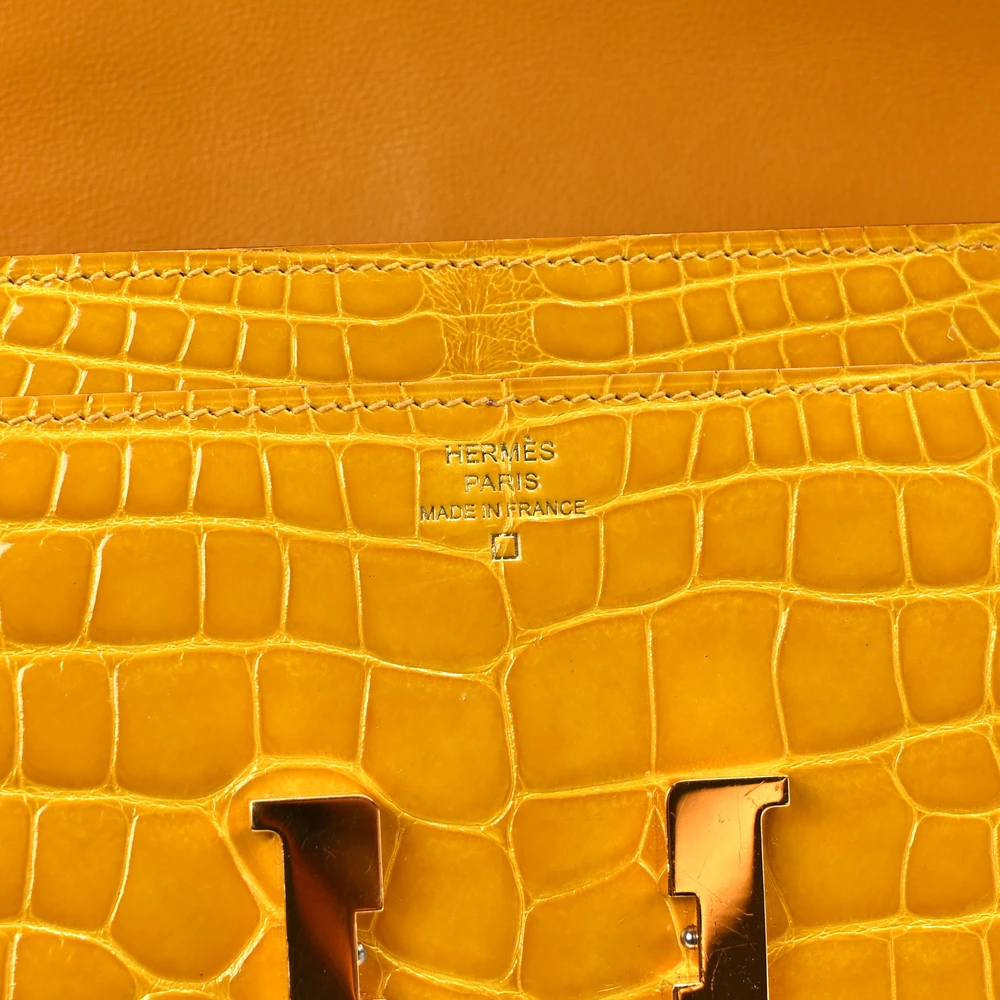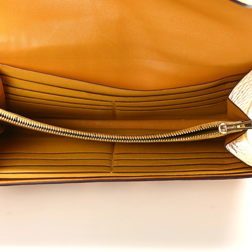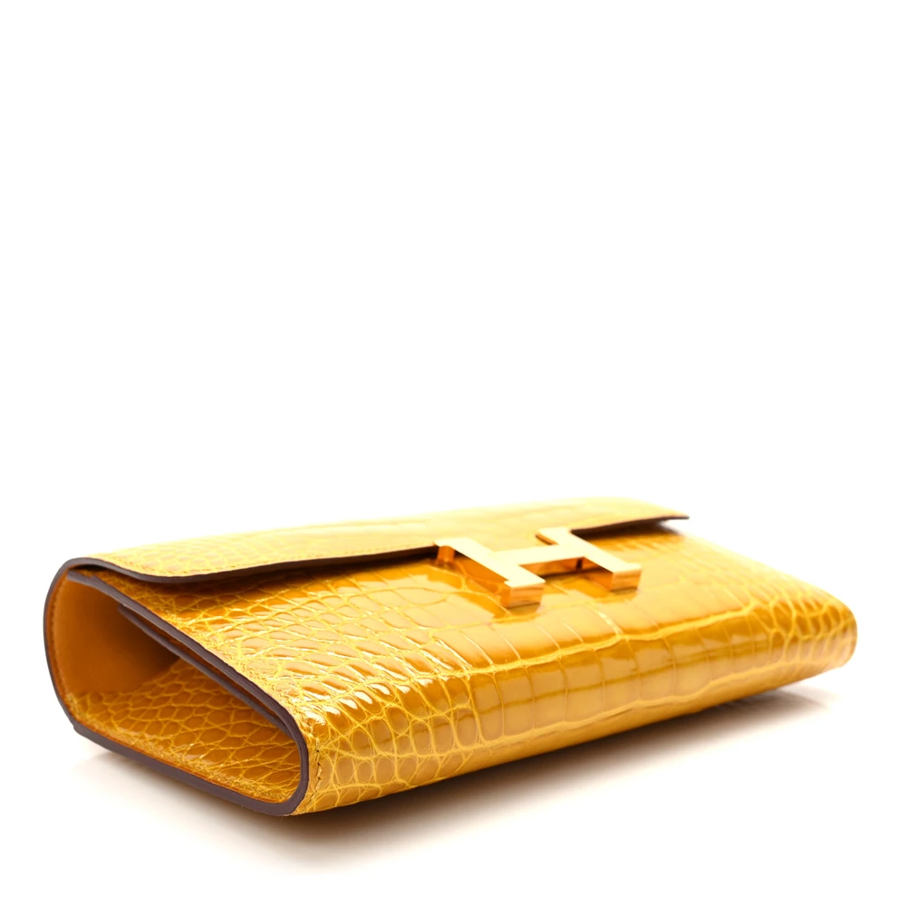 This Hermès Shiny Alligator Constance Long Wallet in Vert Emeraude is the epitome of refined luxury and sophistication. Expertly crafted from glossy alligator leather, it features a stunning emerald green hue that radiates opulence. The front flap is secured with a polished silver Hermès “H” clasp, adding a signature touch of elegance. Inside, the wallet opens to reveal a meticulously partitioned leather interior, complete with card slot panels on either side and a zipper compartment in the center, offering both organization and style. This exquisite wallet is a statement piece, perfect for those who appreciate impeccable craftsmanship and timeless luxury.