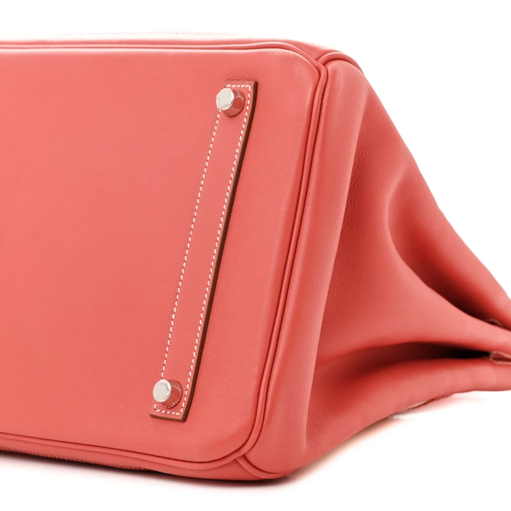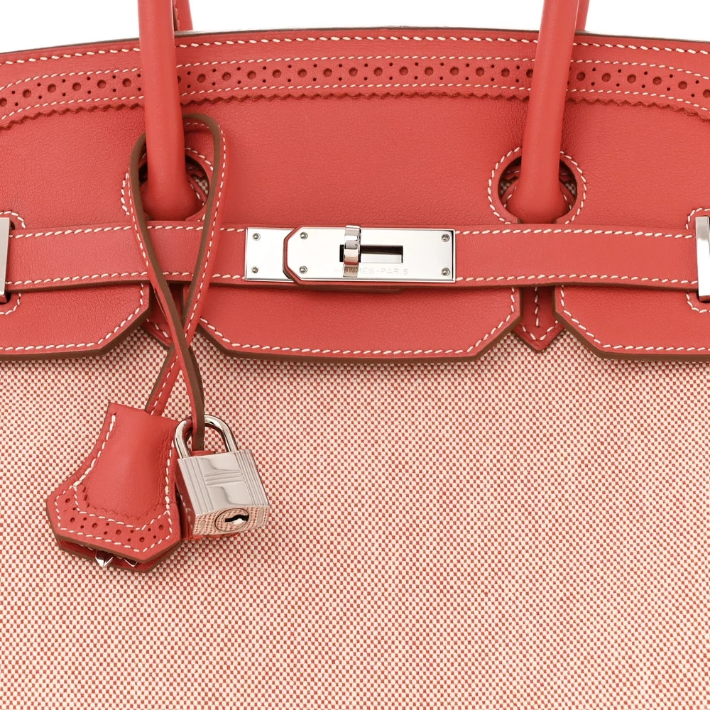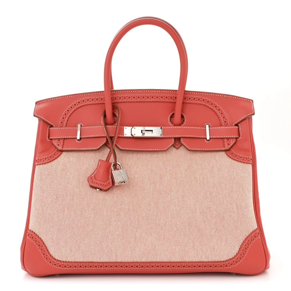 This Hermès Swift & Toile Ghillies Birkin 35 in Rosy is an exquisite and rare design featuring a mix of smooth Swift leather and Toile canvas. The Ghillies detailing adds a refined, brogue-inspired touch to the classic Birkin silhouette. Measuring 35 cm, this bag is both stylish and practical for daily wear. Palladium hardware enhances the delicate pink hue with a modern contrast. This is a highly collectible and unique piece for true Hermès connoisseurs.