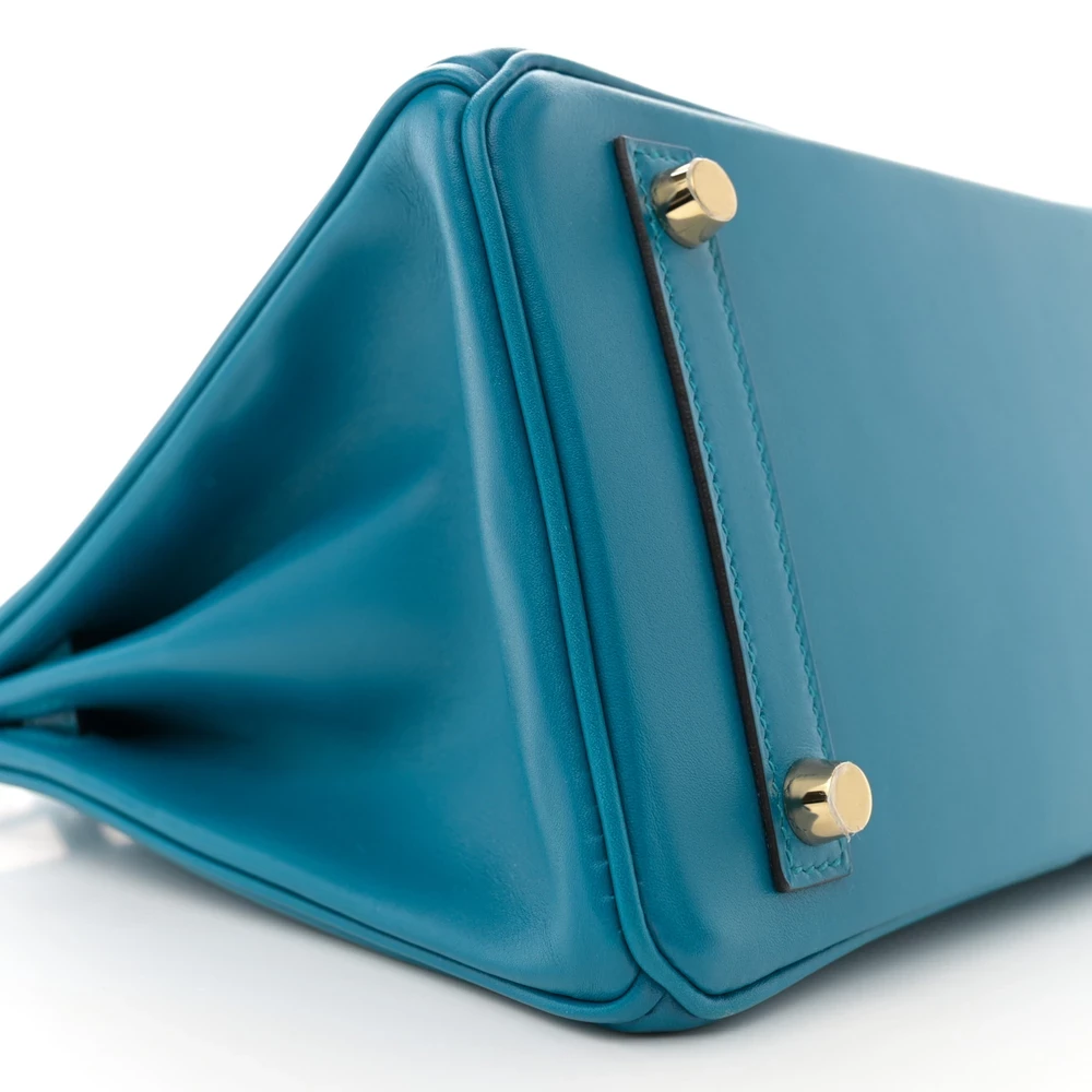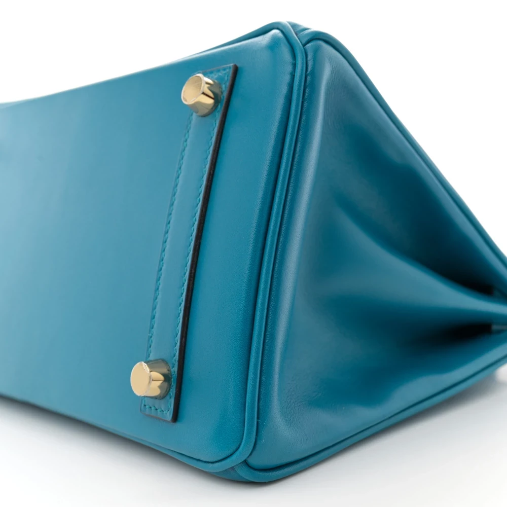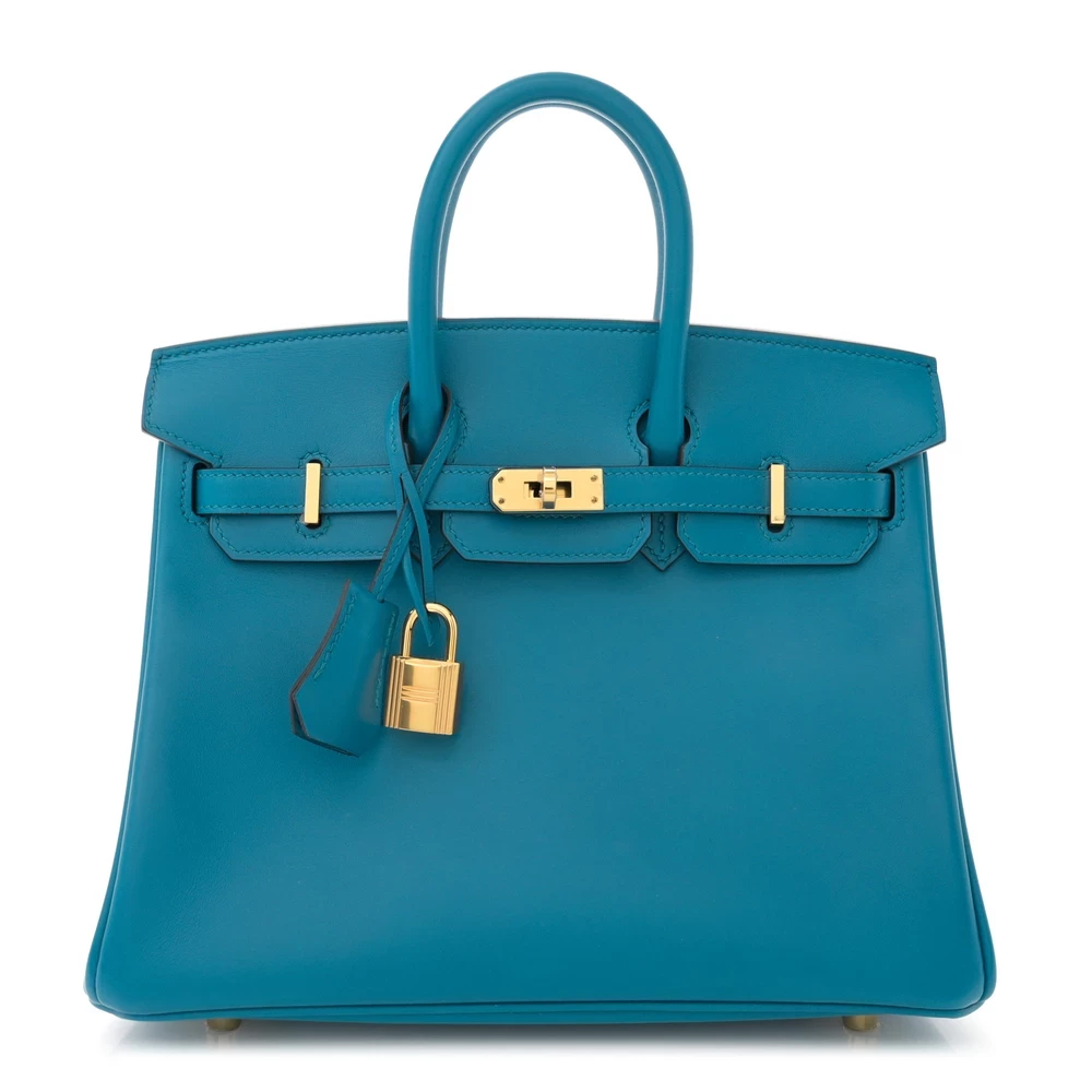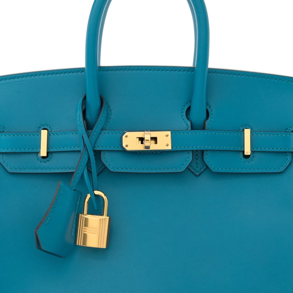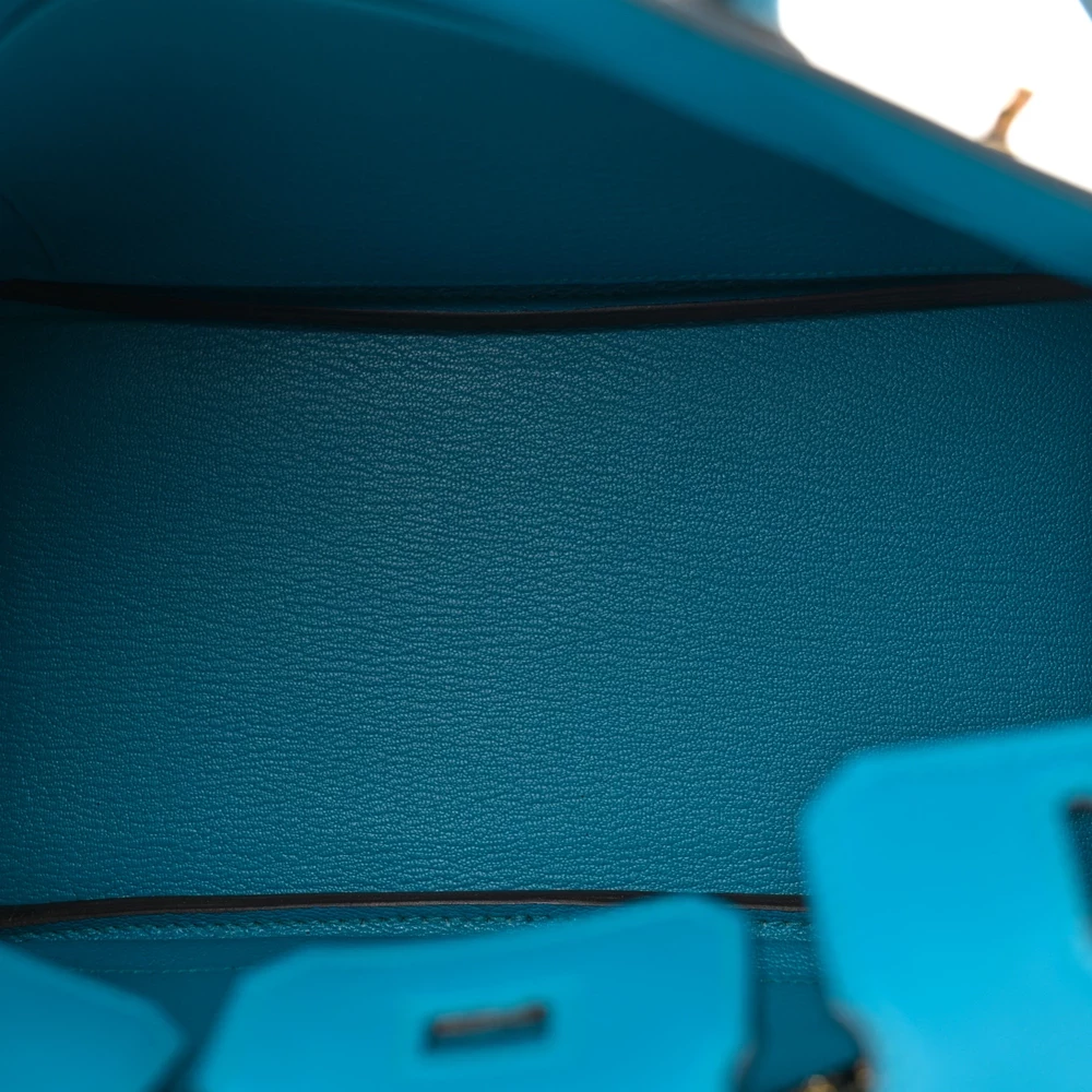 This Hermès Tadelakt Birkin 25 in Bleu Izmir is a sleek and polished handbag in a vibrant turquoise-blue shade. The smooth Tadelakt leather has a subtle sheen, enhancing the brilliance of the Bleu Izmir color. Measuring 25 cm, it is compact yet luxurious for effortless styling. Palladium hardware adds a crisp contrast to the bright hue, making this a refined and eye-catching piece. This is an ideal choice for those who love bold and glossy finishes.