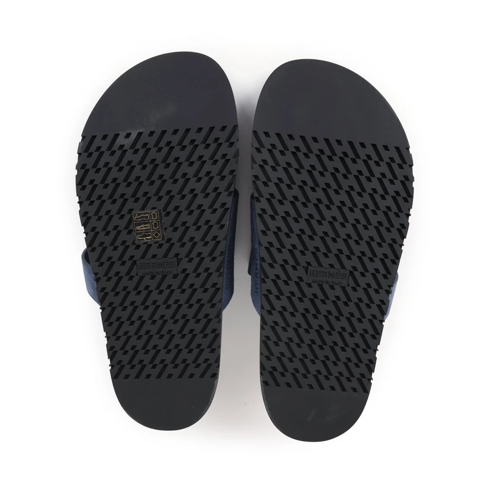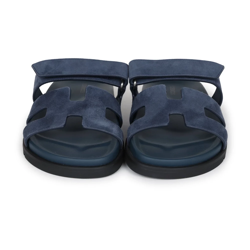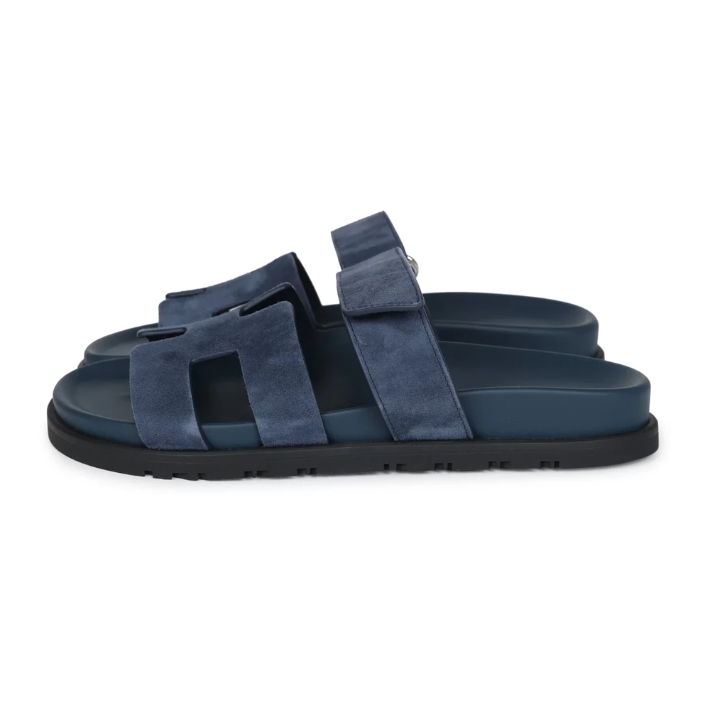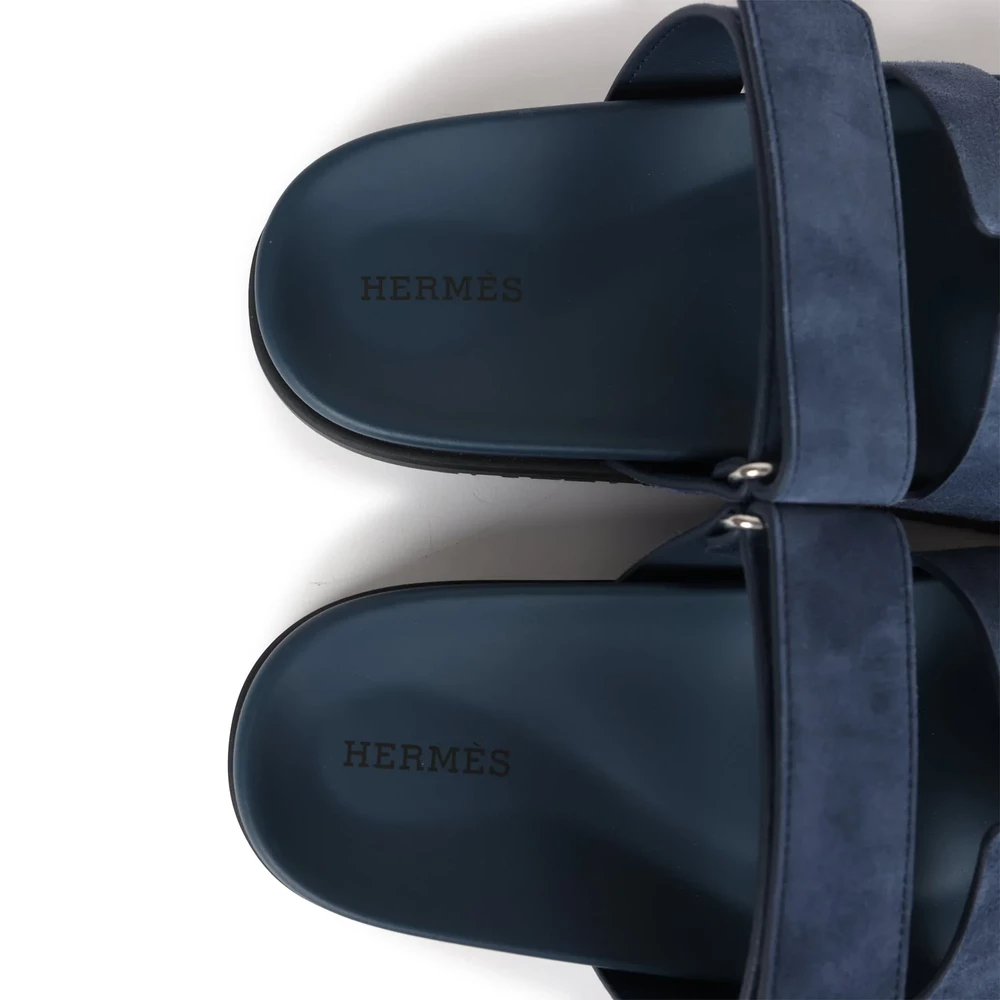 This Hermès Chypre Techno sandal in Bleu Céleste suede with palladium hardware is an elegant and contemporary footwear option. The soft sky-blue suede brings a fresh and luxurious feel, while the adjustable strap provides a customized fit. The ergonomic sole enhances comfort, making this sandal a practical yet stylish choice for any casual-chic look.
