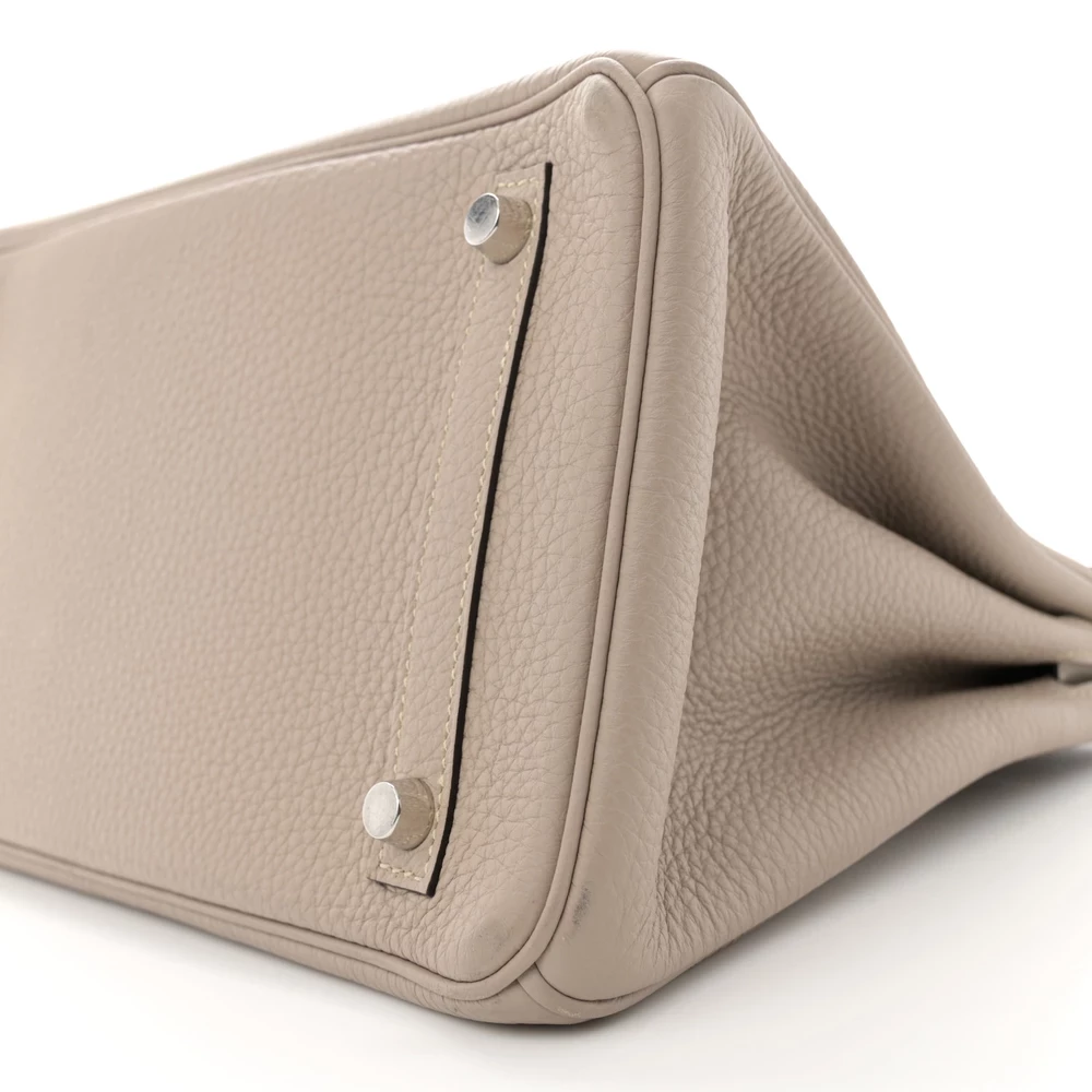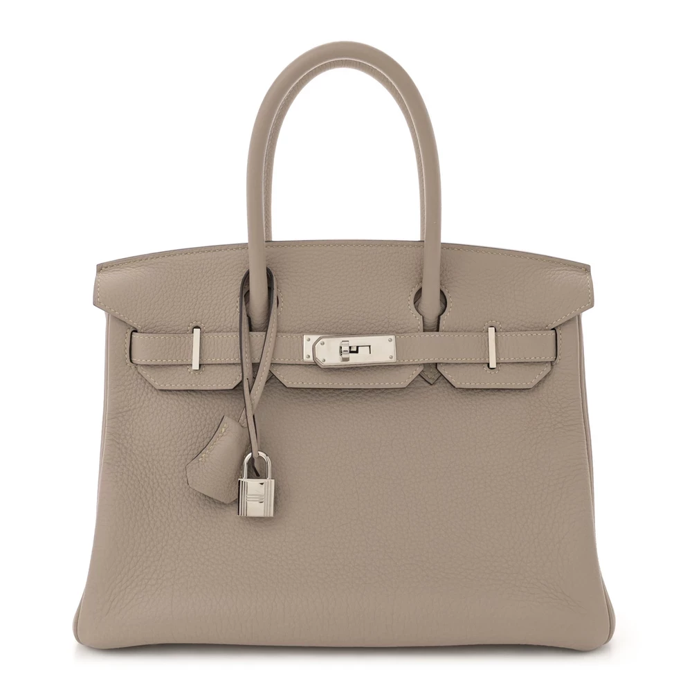 This Hermès Togo Birkin 30 in Gris Tourterelle is an elegant and neutral handbag in a soft dove-gray shade. The slightly pebbled Togo leather enhances its structured silhouette while remaining supple to the touch. With a 30 cm size, it is practical yet refined. Palladium hardware provides a modern and understated finish. This is a sophisticated investment piece that effortlessly complements any wardrobe.