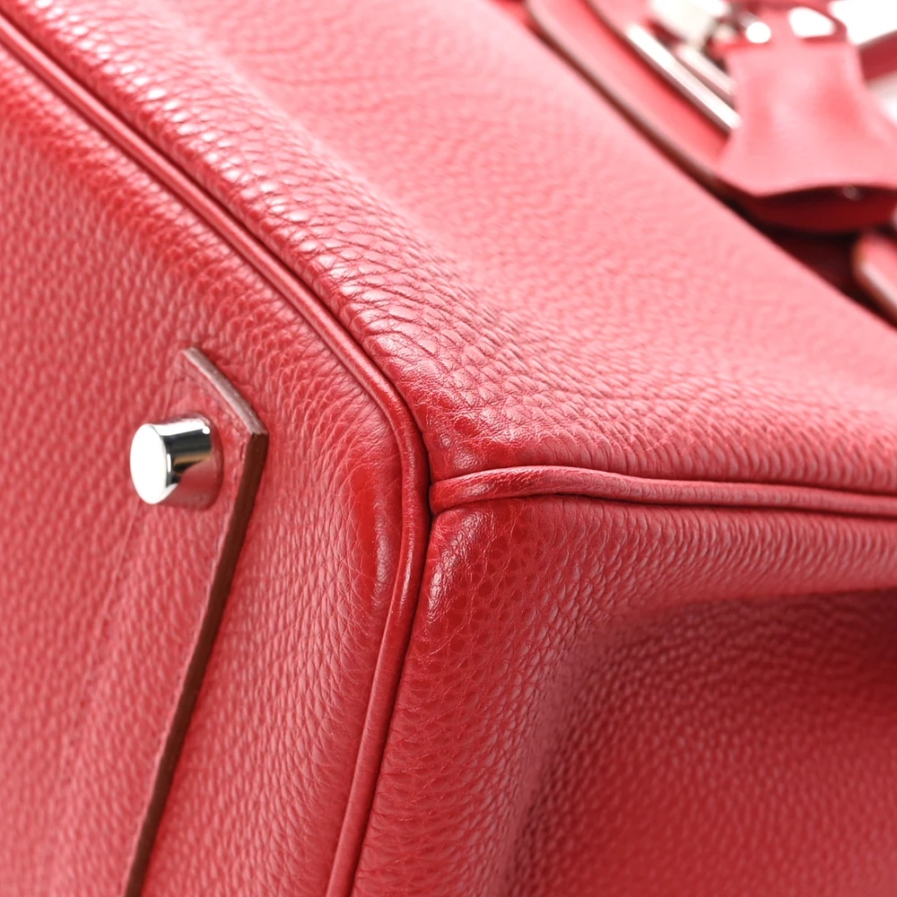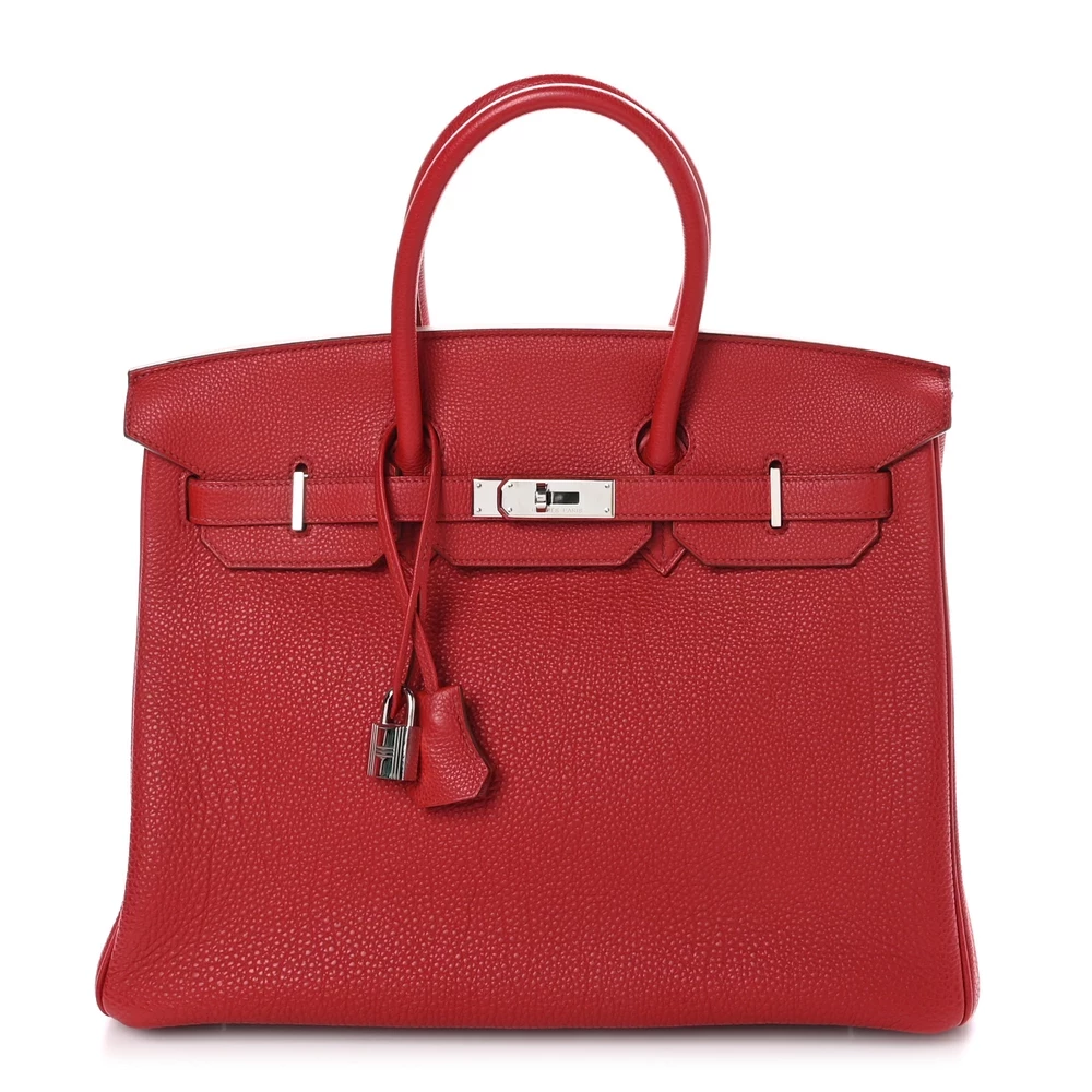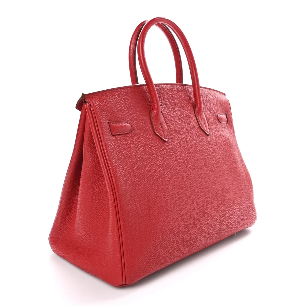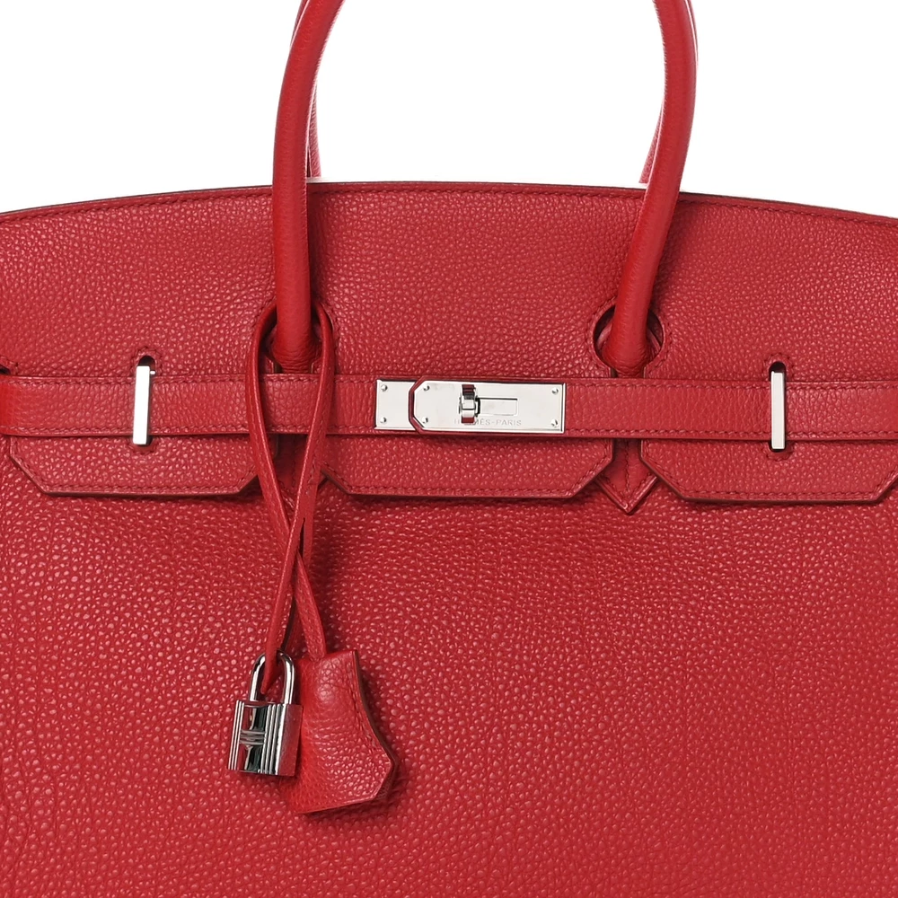 This Hermès Togo Birkin 35 in Rouge Garance is a bold and captivating handbag in a striking red hue with warm undertones. The Togo leather offers a fine grain and a slight sheen, ensuring both beauty and durability. Measuring 35 cm, it provides generous space without sacrificing elegance. Palladium hardware adds a cool contrast, making the rich red color stand out even more. This is a confident and statement-making Birkin.