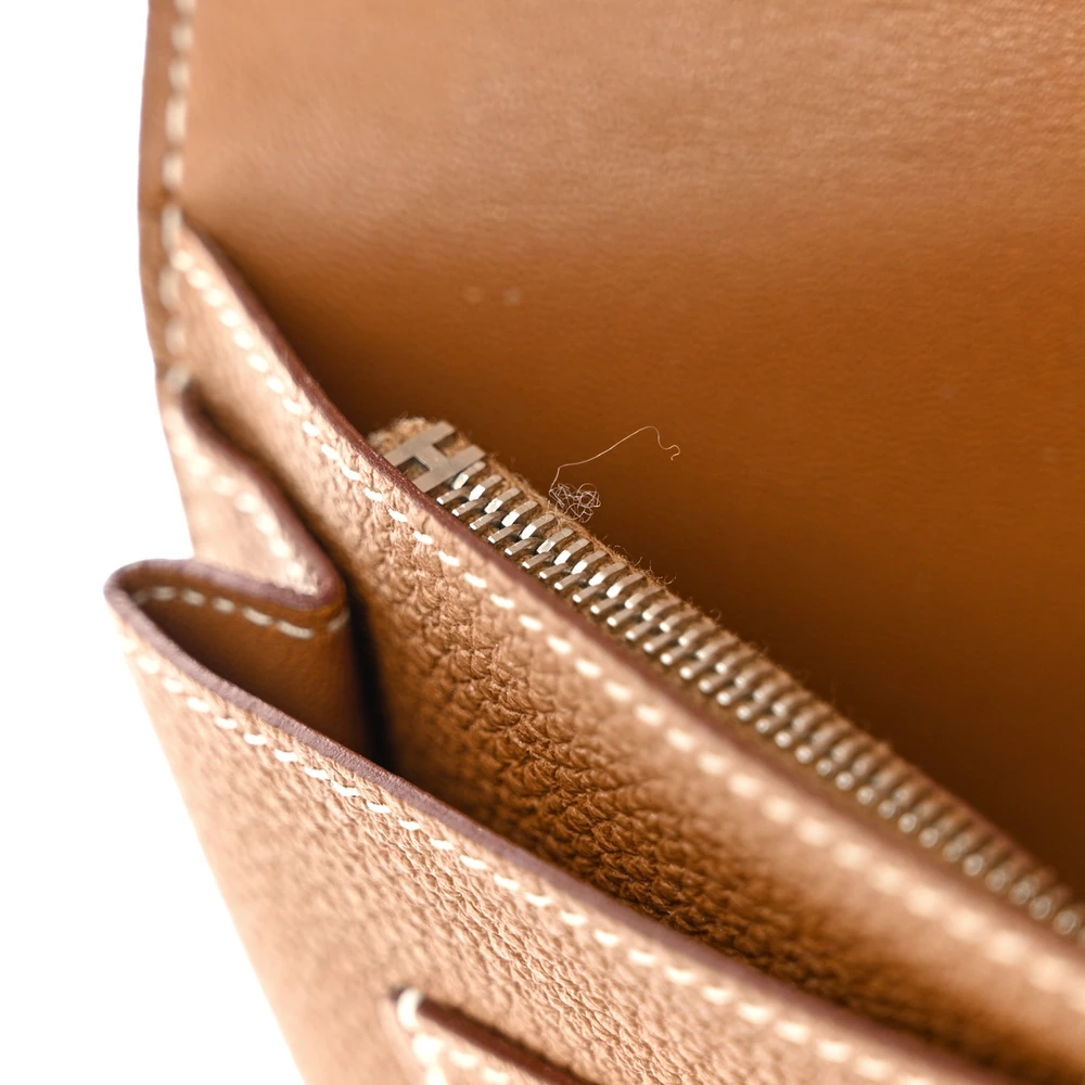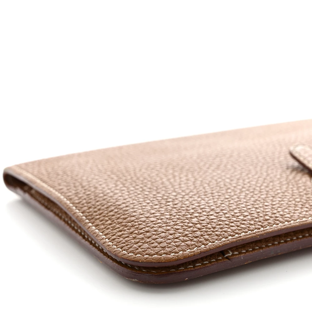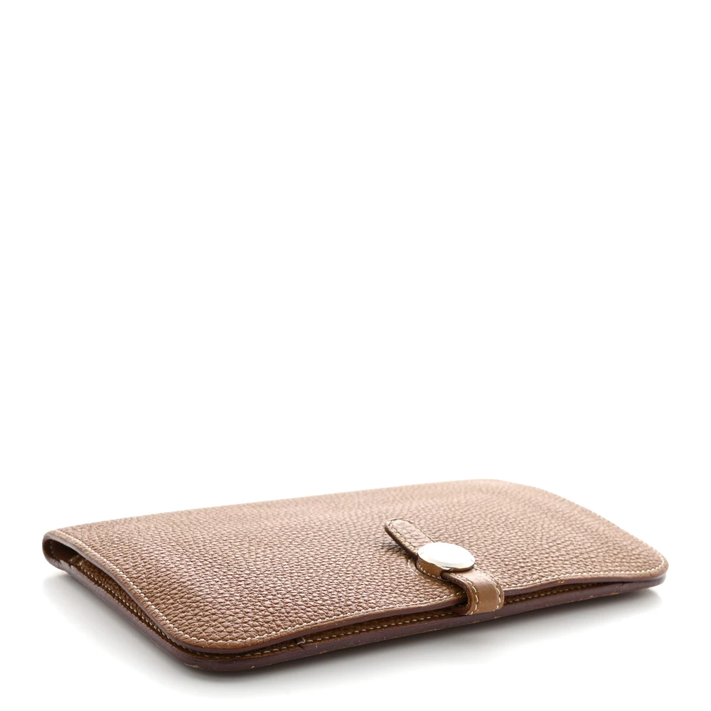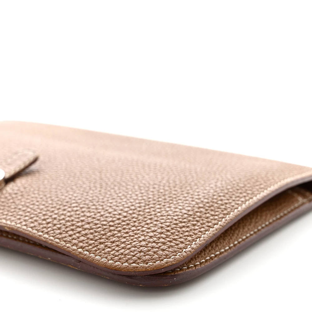 This Hermès Togo Dogon Duo Wallet in Gold is a refined and practical accessory that exemplifies luxury and functionality. Crafted from soft yet durable Togo calfskin leather, the wallet is finished in a warm light brown hue, Gold, which adds a timeless elegance. The wallet opens with a sleek palladium closure, revealing a thoughtfully designed interior with multiple pockets for cards, a coin pocket, and a removable insert for added organization. Perfect for those who appreciate understated sophistication, this wallet is a versatile and stylish addition to any collection.