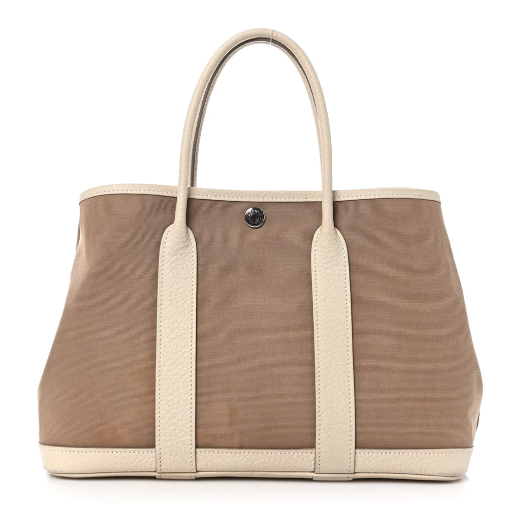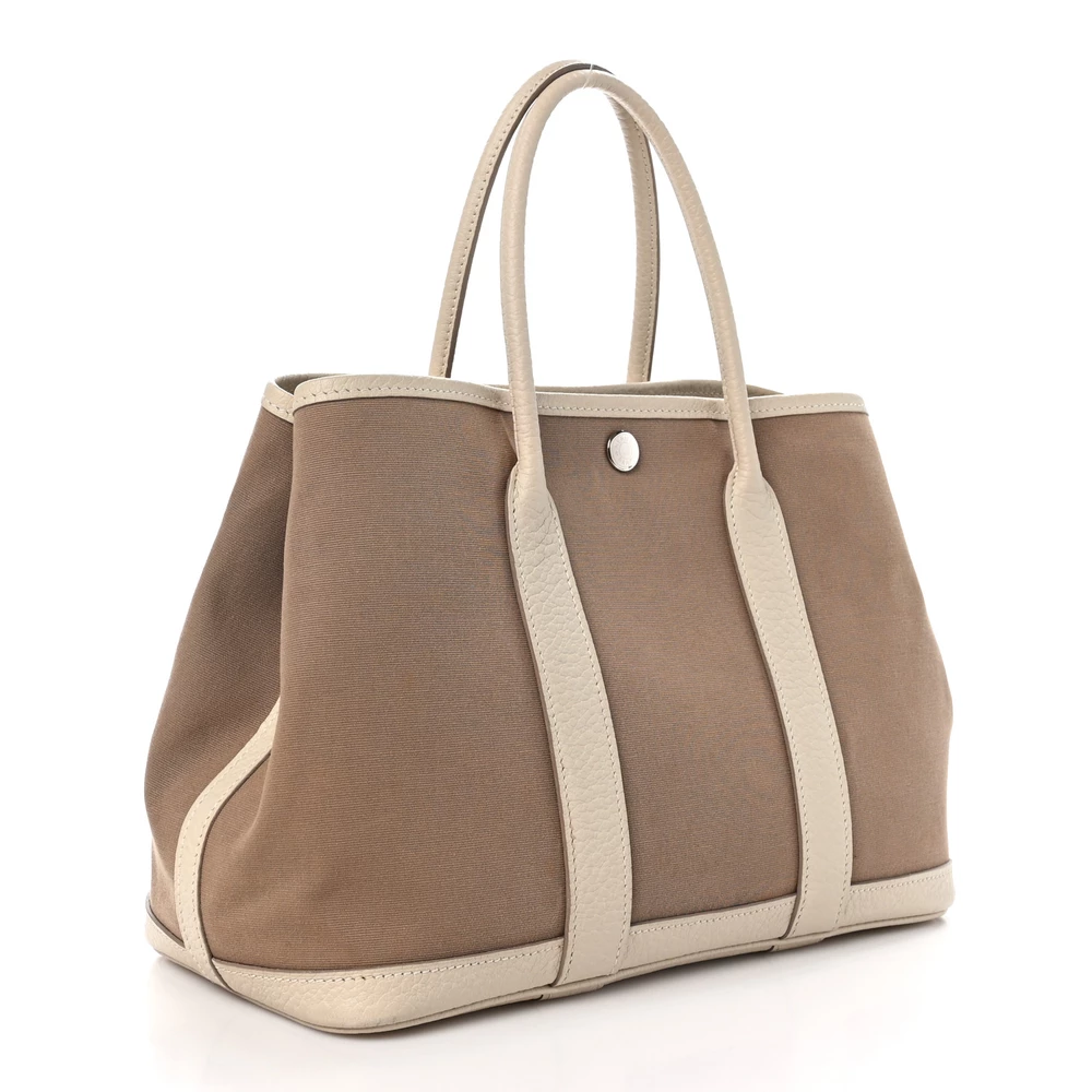 This Hermès Garden Party 30 TPM in Craie & Etoupe Toile & Negonda Leather is a beautifully neutral tote with a sophisticated color pairing. The Toile fabric keeps the bag lightweight, while the Craie and Etoupe Negonda leather trims add a timeless and elegant contrast. Its compact design makes it perfect for effortless everyday wear. The muted tones create a versatile and refined aesthetic, ensuring seamless pairing with a variety of outfits. This bag is ideal for those who appreciate understated luxury with a touch of contrast.