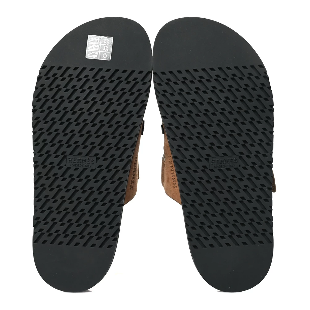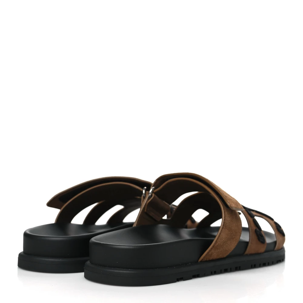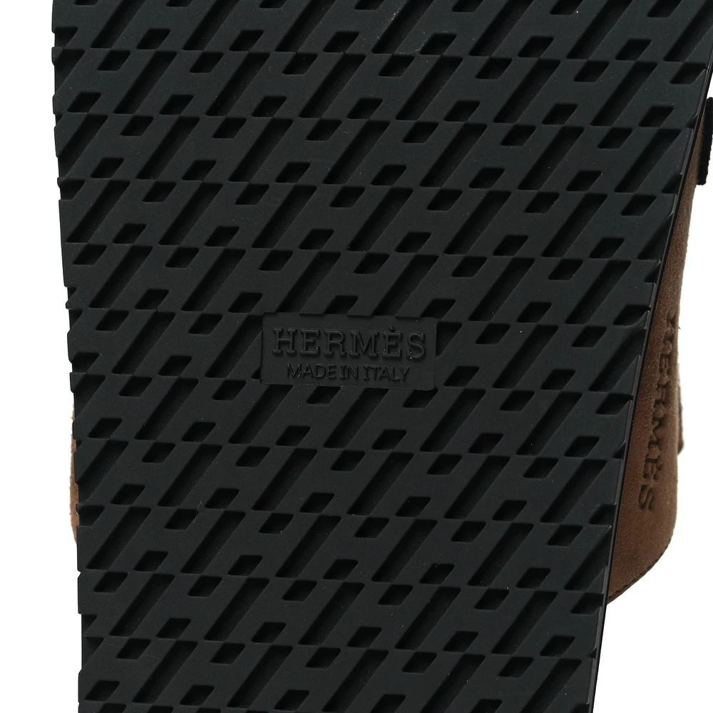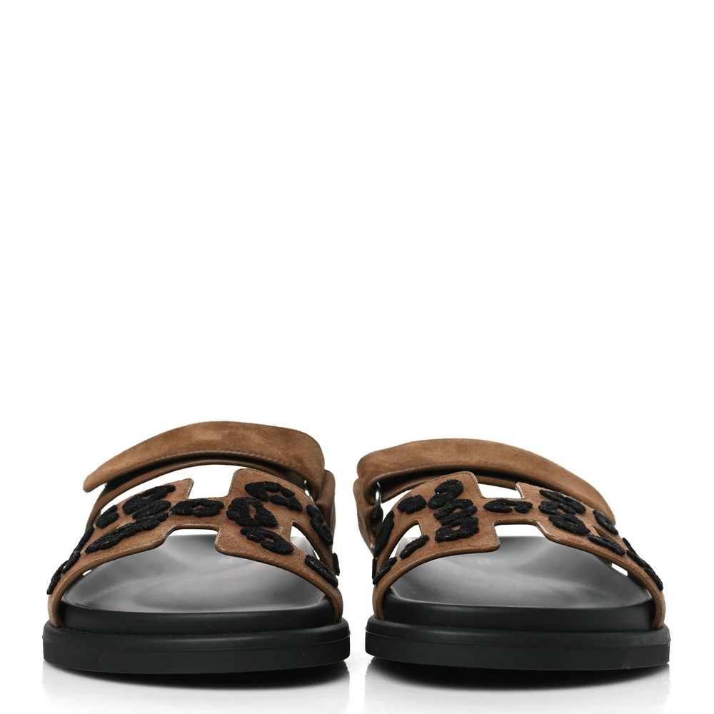 This Hermès Chypre sandal in Brun Fumé Black tufted leopard Suede & Goatskin is a bold and playful statement piece. The tufted leopard pattern adds texture and depth, while the ergonomic sole ensures all-day wearability. Designed with an adjustable strap, it provides both security and style. Whether styled with neutral outfits or bold prints, this sandal exudes a unique charm.