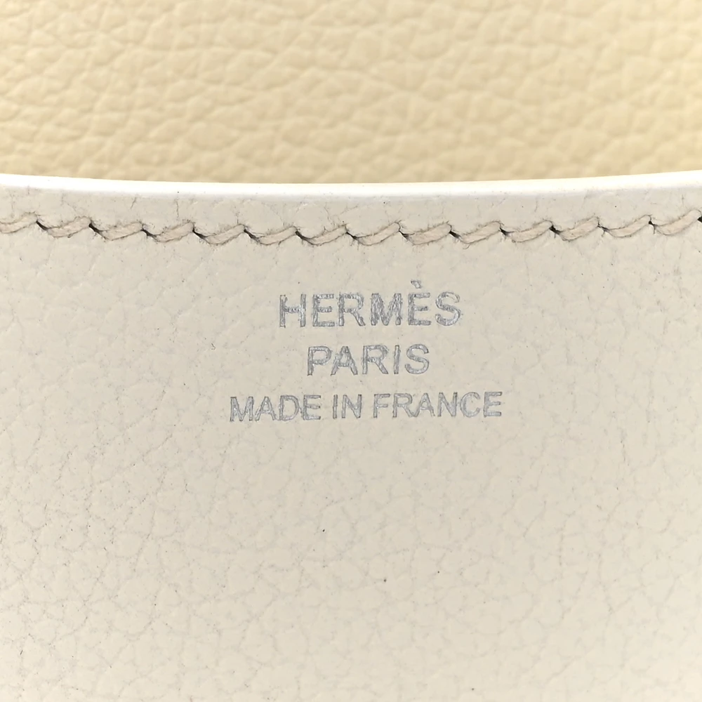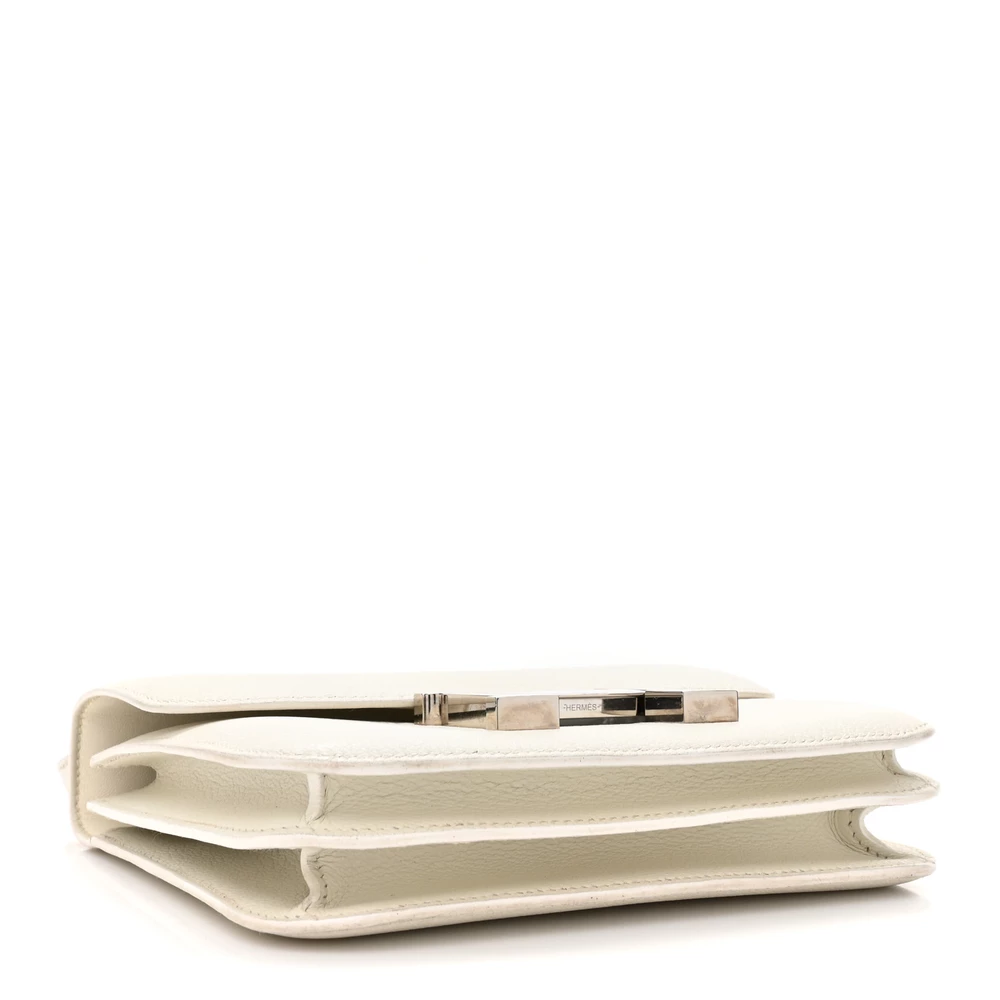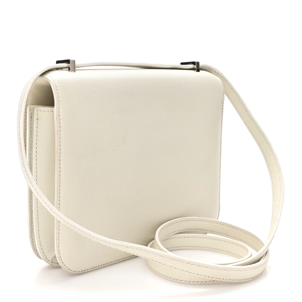 This Hermès Evercolor Constance 18 White is a sleek and minimalistic handbag in a crisp white shade. The Evercolor leather offers a soft and fine-grained texture, ensuring long-lasting beauty. The compact 18cm size makes it an effortlessly elegant choice. Palladium hardware enhances its fresh and modern aesthetic. This Constance is a perfect addition to any refined wardrobe.