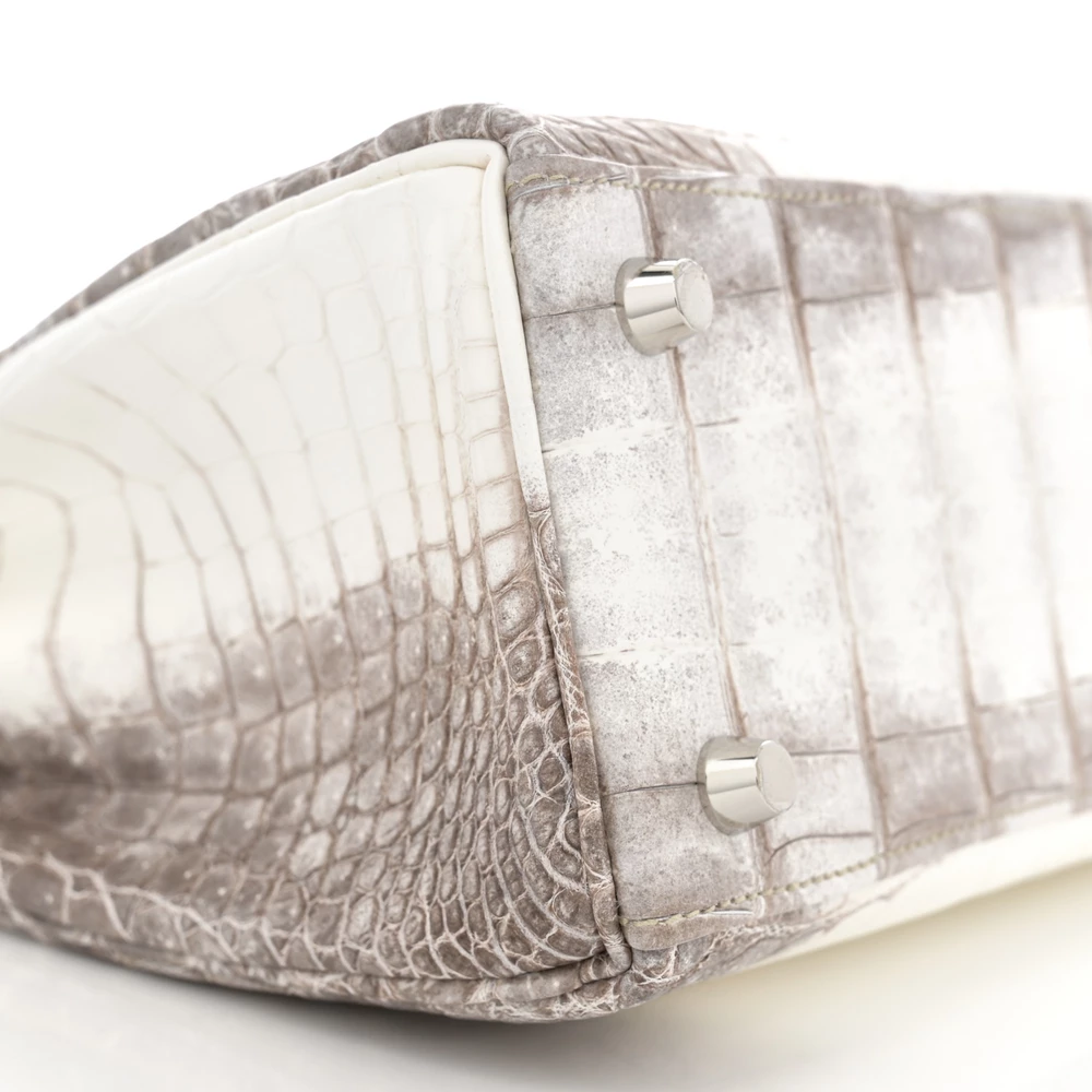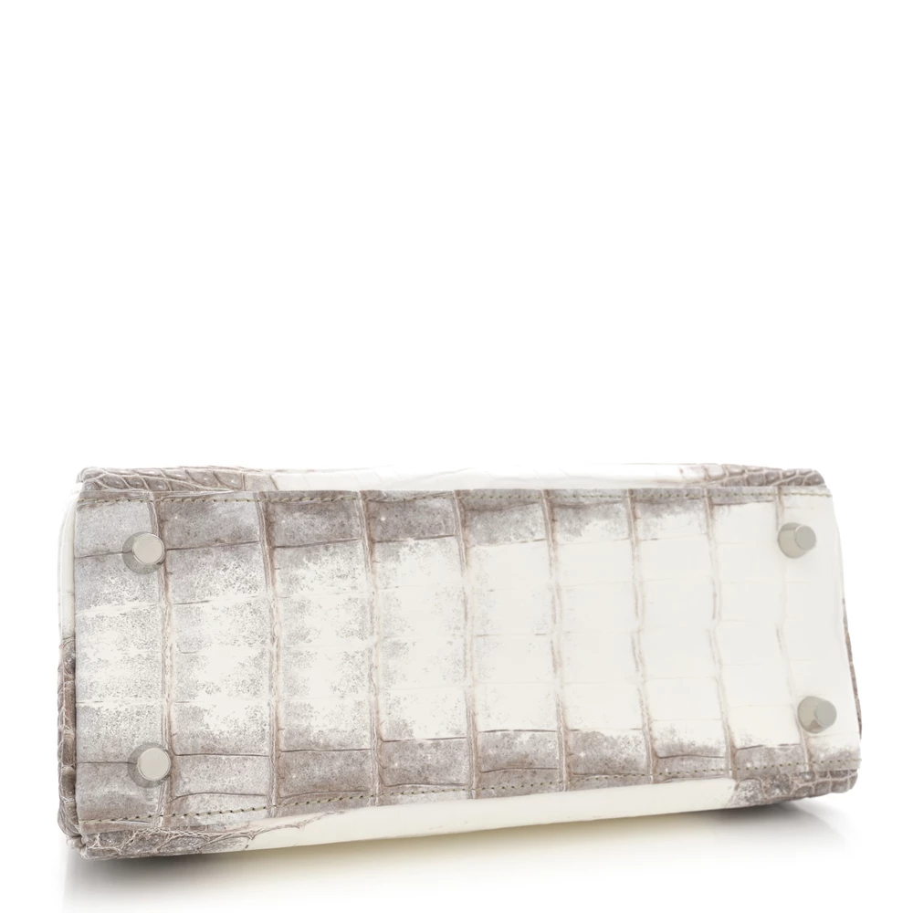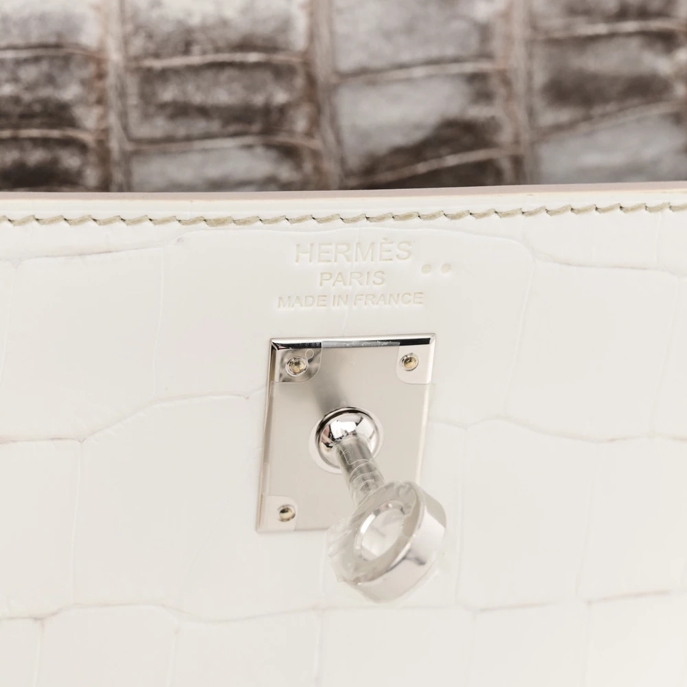 This Hermès Matte Niloticus Crocodile Himalaya Kelly Retourne 25 White is one of the rarest and most coveted handbags in the world. The matte Niloticus crocodile leather showcases a breathtaking gradient of white and soft gray, resembling the Himalayan mountains. The Retourne construction softens its edges for an elegant and effortless look. Palladium hardware enhances its refined and luxurious appeal. This Kelly is an extraordinary collector’s piece.