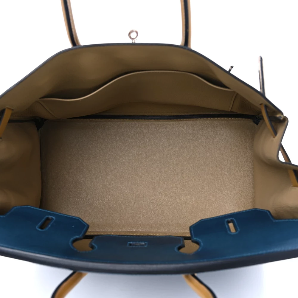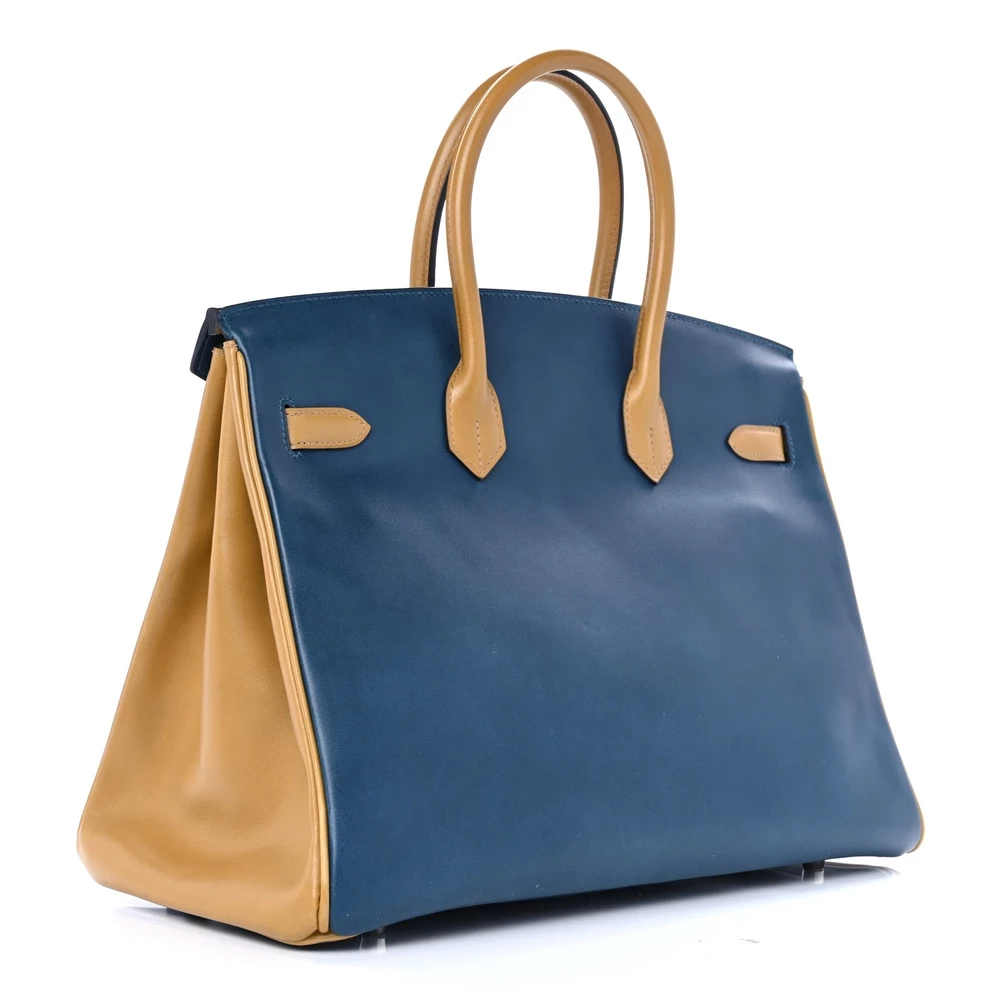 This Hermès Box Horseshoe Birkin 35 in Bleu de Prusse & Curry is a rare and striking custom piece. The combination of deep navy Bleu de Prusse and warm mustard Curry creates a unique and bold contrast. Box leather provides a smooth, glossy finish, adding to its refined appearance. Measuring 35 cm, this Birkin offers both style and spaciousness. Gold hardware enhances the rich color pairing, making it a collector’s dream.