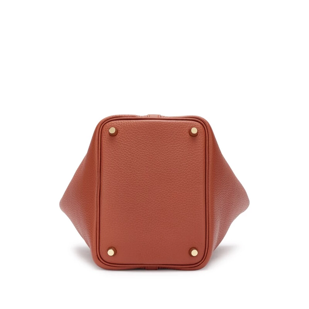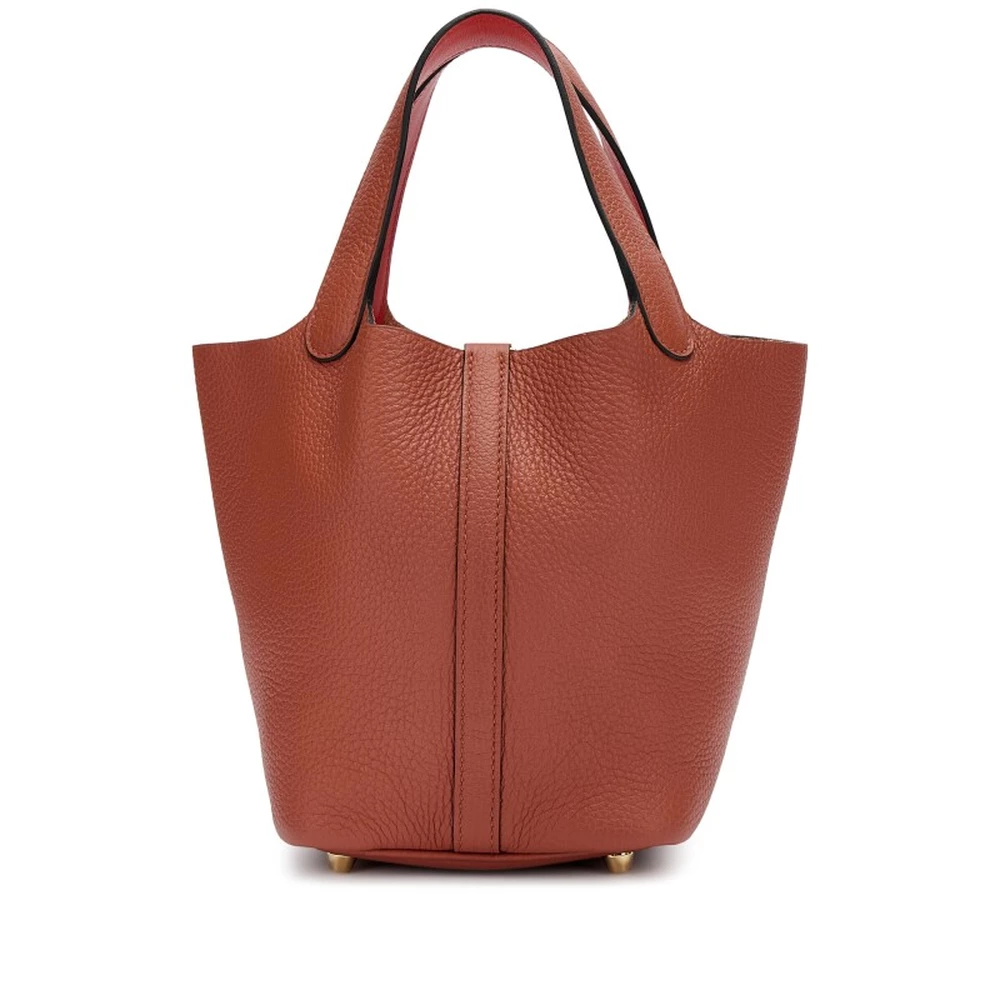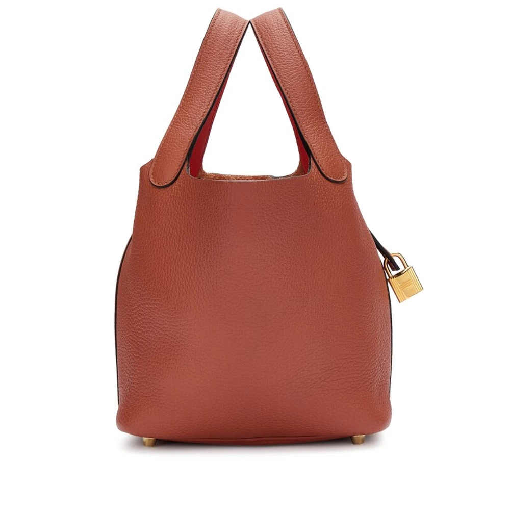 This Hermès Cuivre Clémence and Capucine Swift Verso Picotin Lock 18 with Gold Hardware is a rich and fiery two-tone handbag featuring a deep copper exterior with a vibrant orange interior. The mix of Clémence and Swift leather adds texture and depth, while the gold hardware enhances its warm color palette. This Picotin is a bold and luxurious statement piece.