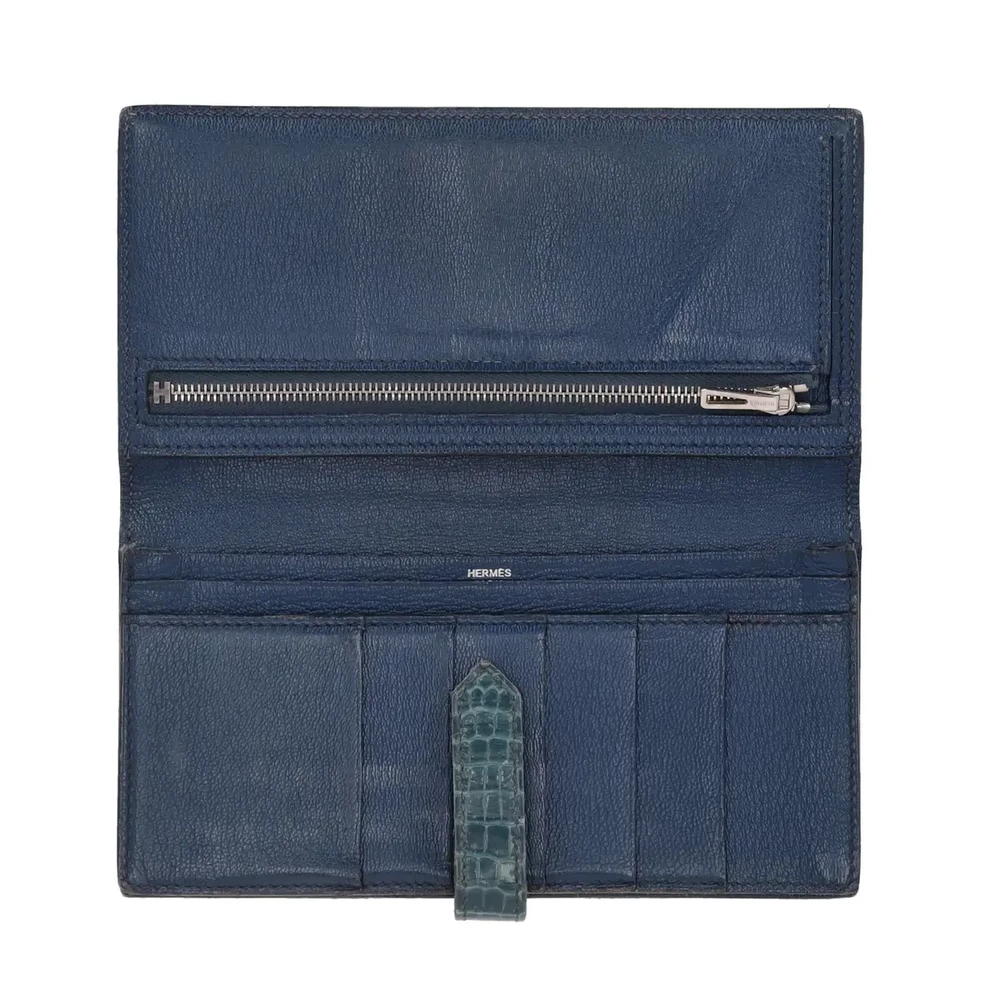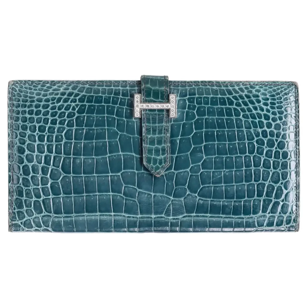 This Hermès Diamond Bearn Wallet in 18K White Gold and Shiny Crocodile Skin is an extraordinary display of luxury and craftsmanship. The sleek, glossy crocodile leather is elevated by an H clasp crafted from 18K white gold, adorned with dazzling diamonds for a refined and opulent finish. Designed for collectors and connoisseurs, this wallet is both a functional piece and a rare treasure. Its meticulous construction and breathtaking materials make it a true symbol of exclusivity and elegance.