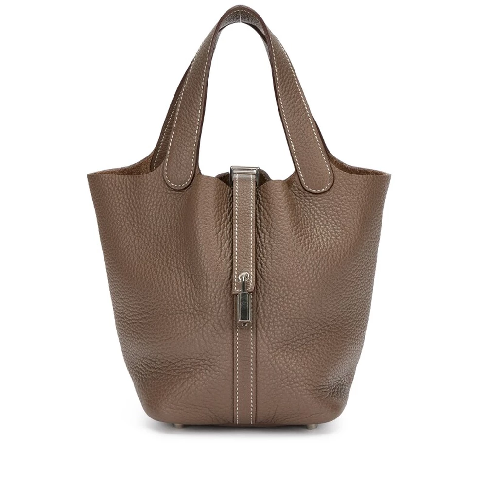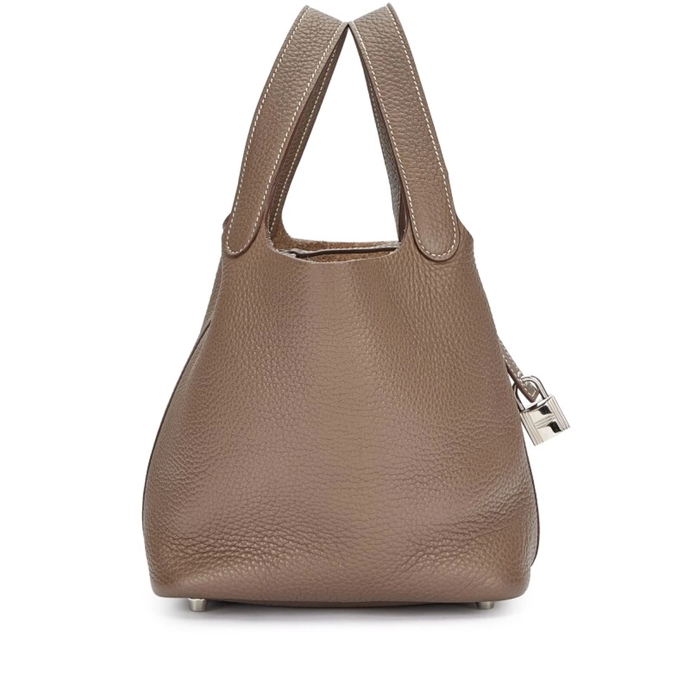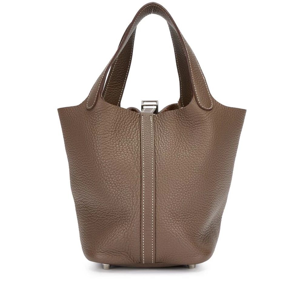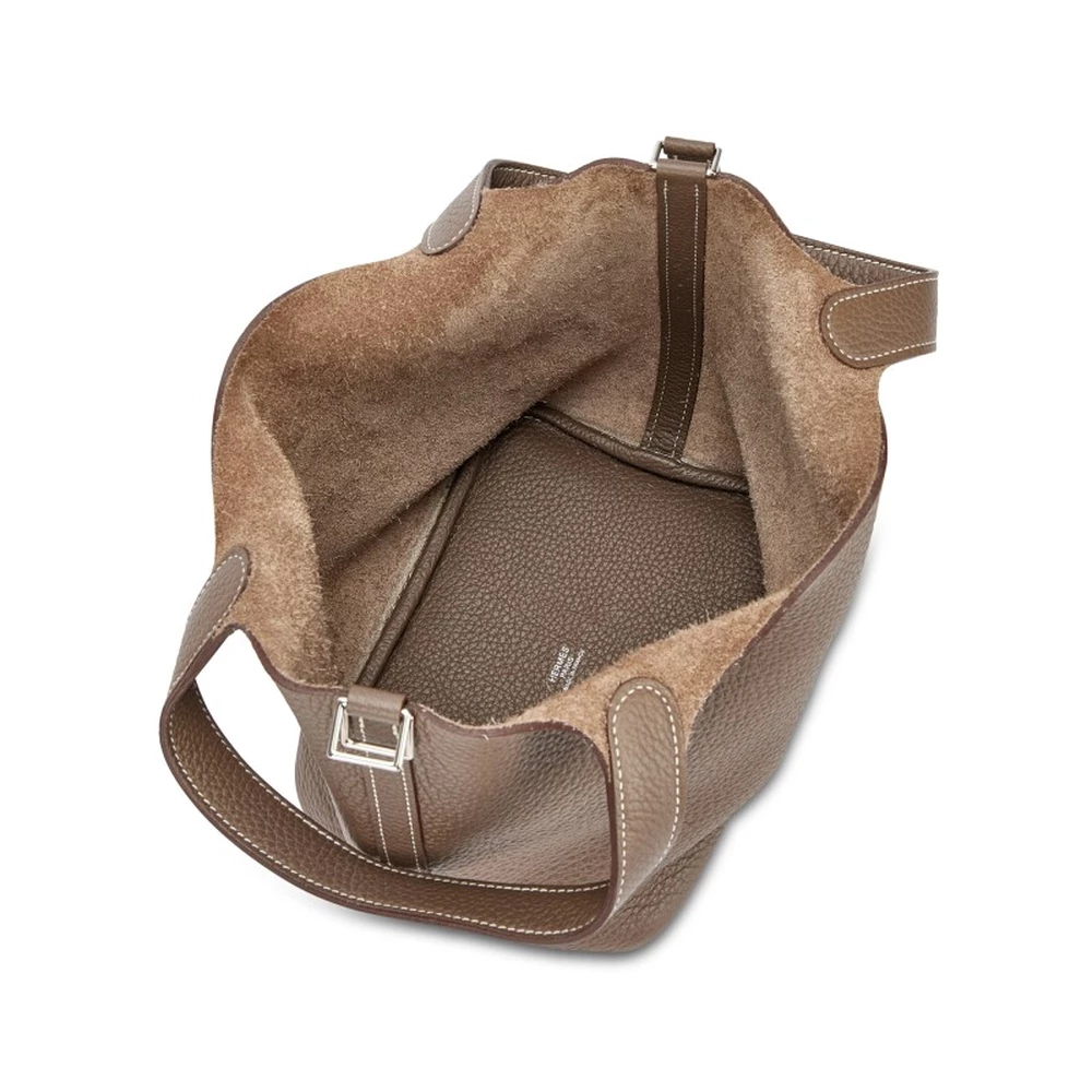 This Hermès Étoupe Clémence Picotin Lock 18 with Palladium Hardware is a refined and neutral-toned handbag in a classic taupe shade. The Clémence leather’s soft texture creates a relaxed yet structured look, while the palladium hardware adds a cool, modern edge. The open-top bucket design enhances its effortless appeal. This Picotin is a must-have for those who appreciate understated elegance.