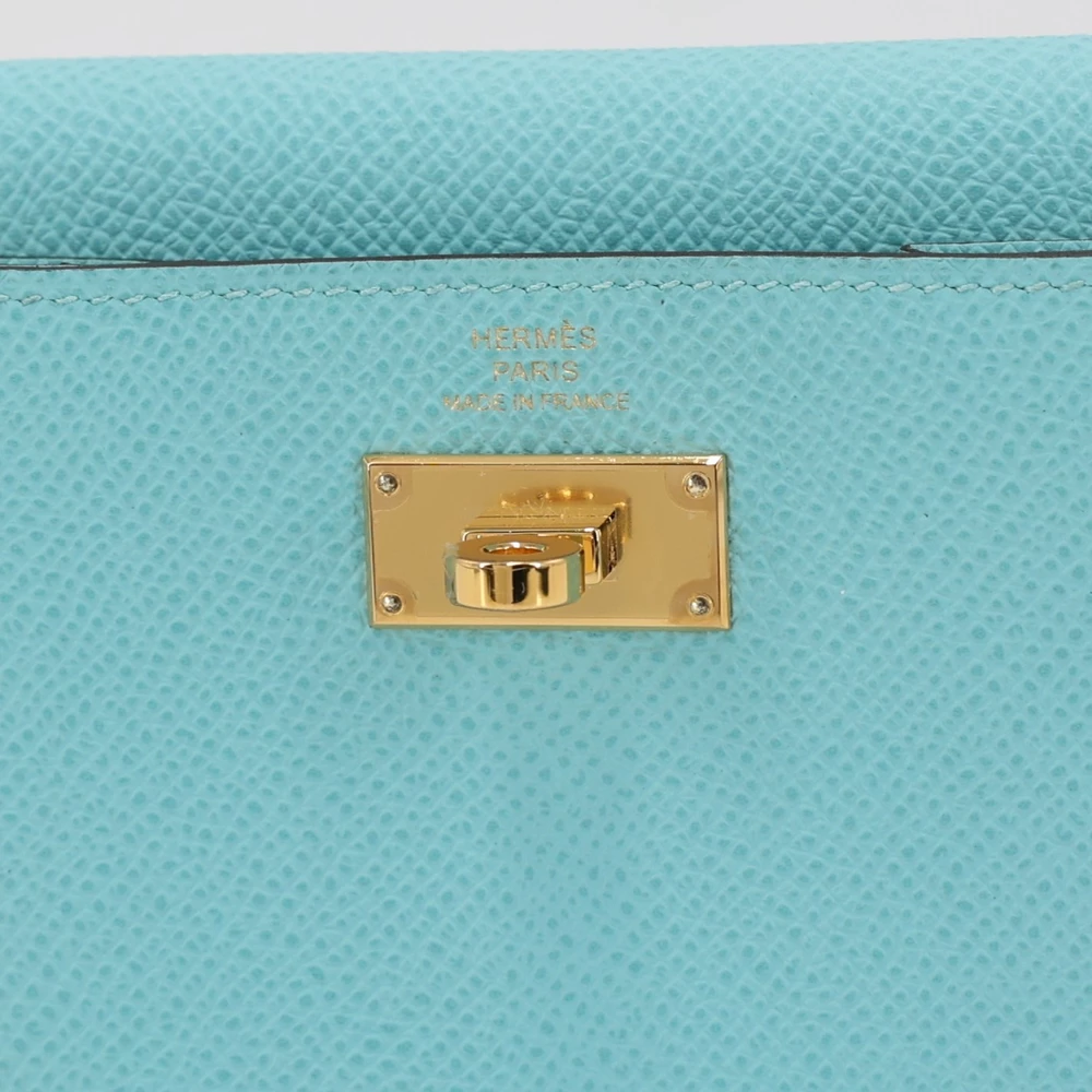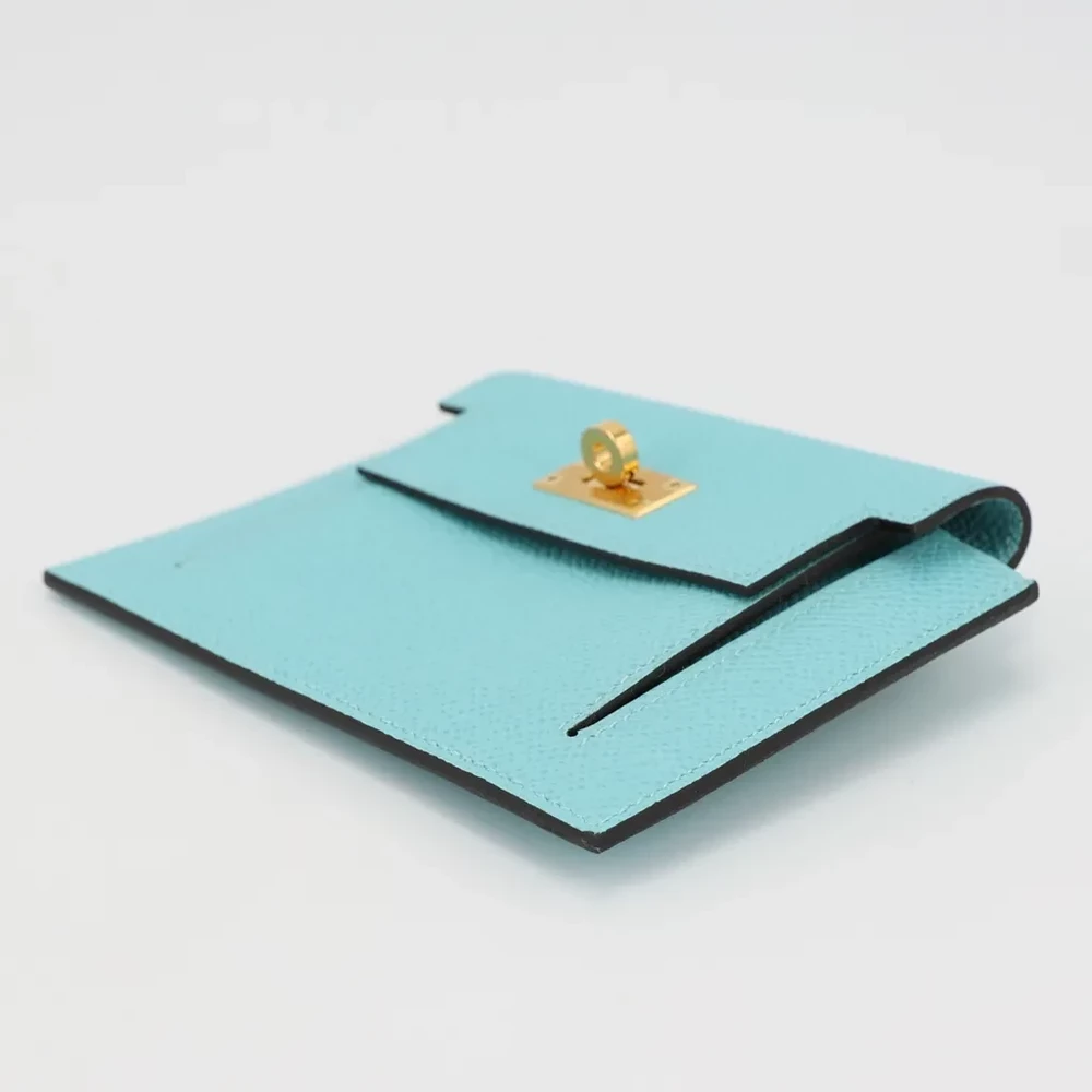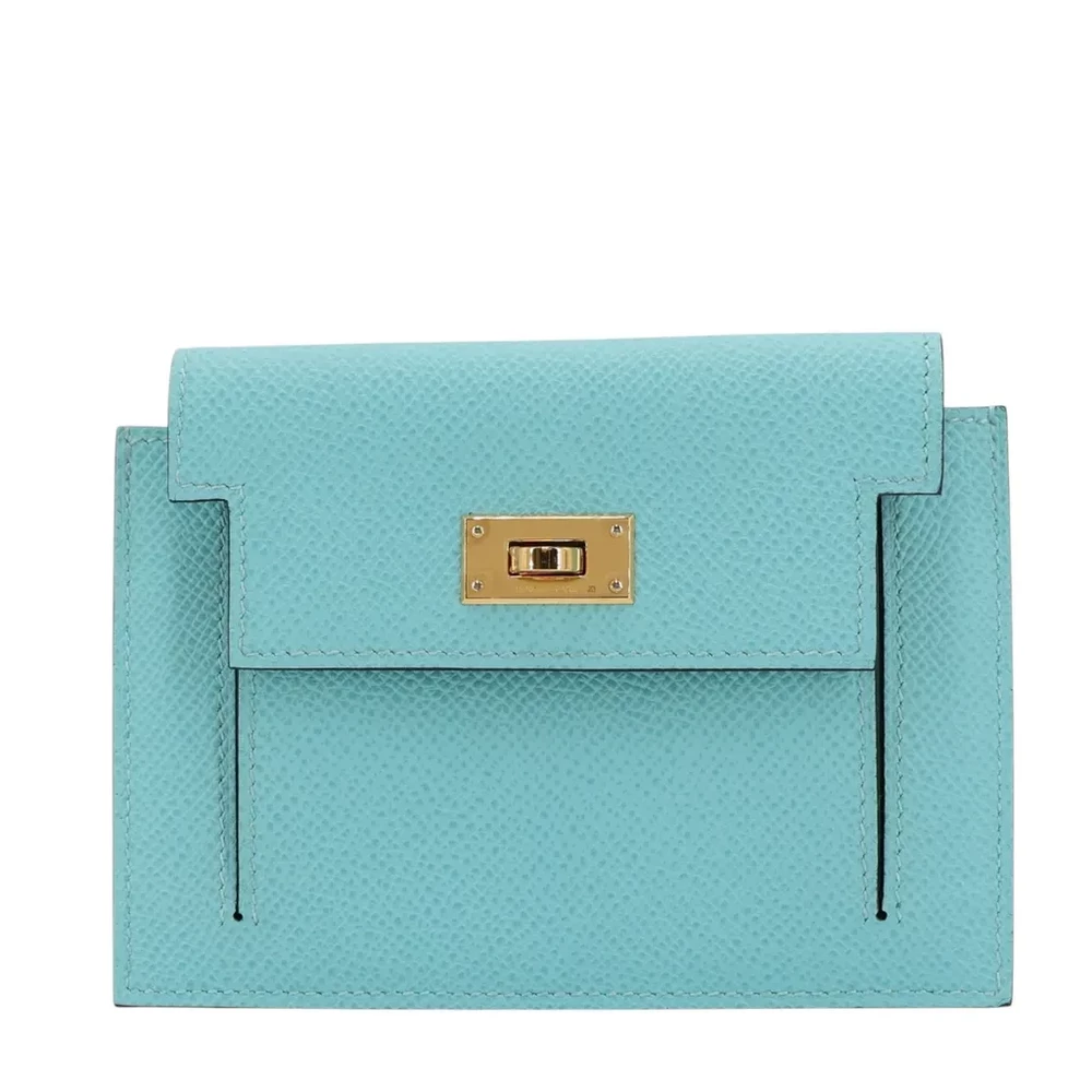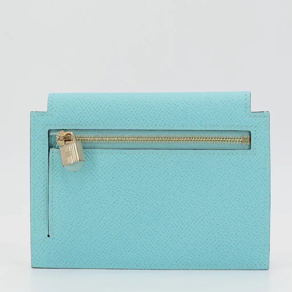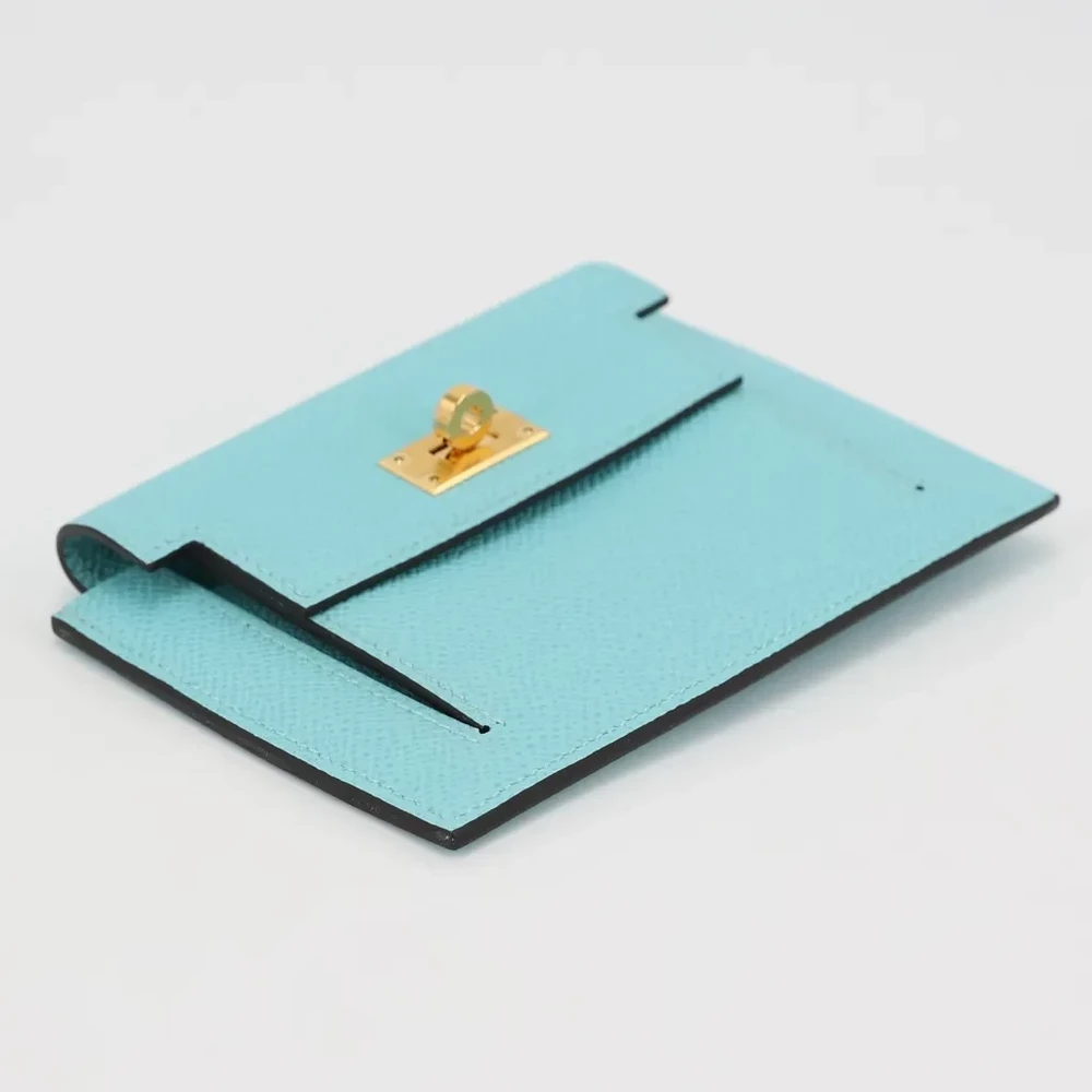 This Hermès Kelly Pocket Compact wallet is a refined and practical accessory, crafted from durable Epsom leather in the refreshing Bleu Atoll (3P) shade. The serene blue hue is elegantly paired with radiant gold hardware, creating a striking contrast that enhances its timeless appeal. Stamped with a “Z” for 2021, this wallet reflects Hermès’ signature craftsmanship and attention to detail. Measuring approximately 13cm in length, 10cm in height, and 1cm in width, its slim and compact design makes it an ideal everyday companion. Accompanied by its receipt, this exquisite piece is available in Singapore, making it a desirable addition for collectors and those who appreciate luxury with functionality.